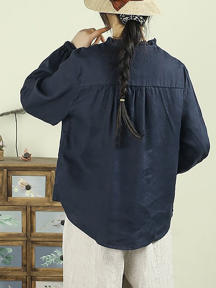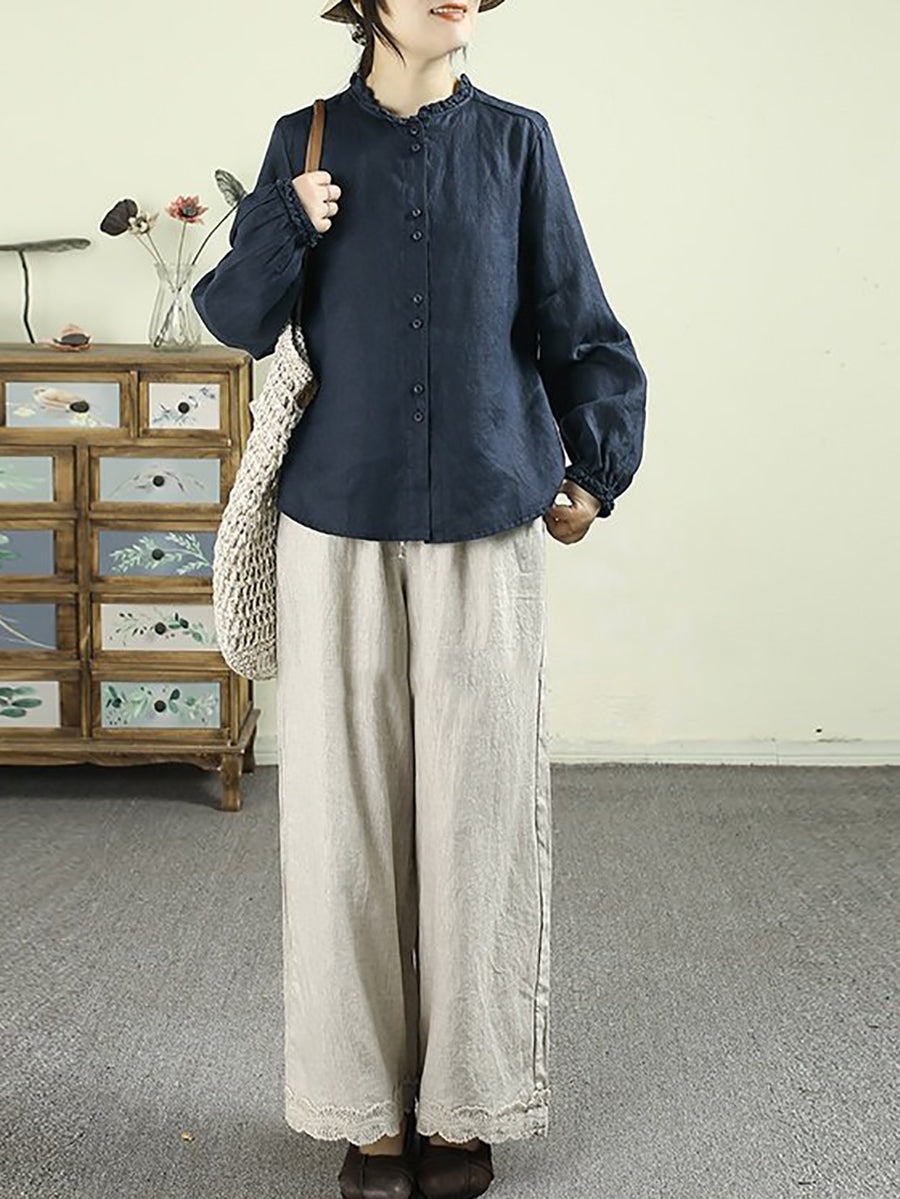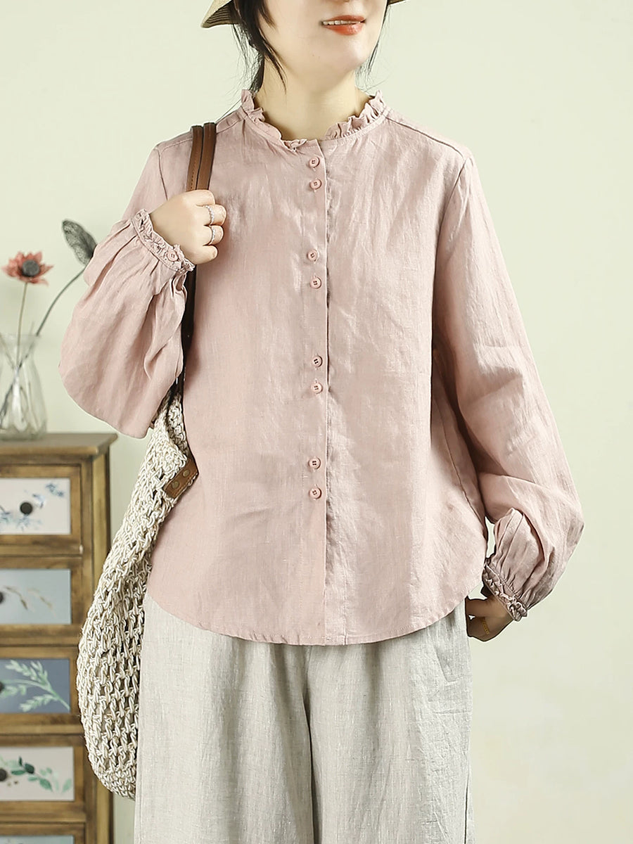 قميص نسائي أنيق ربيعي بلون موحد وياقة واقفة مصنوع من الكتان بنسبة 100%
