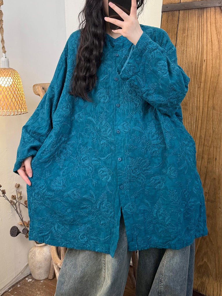 قميص نسائي خريفي مطرز فنيًا من الكتان بياقة واقفة