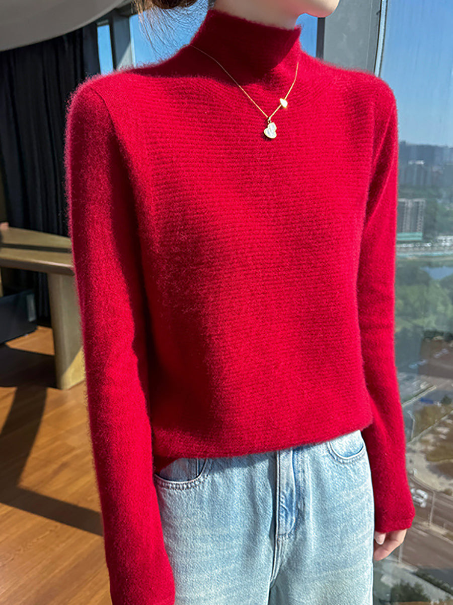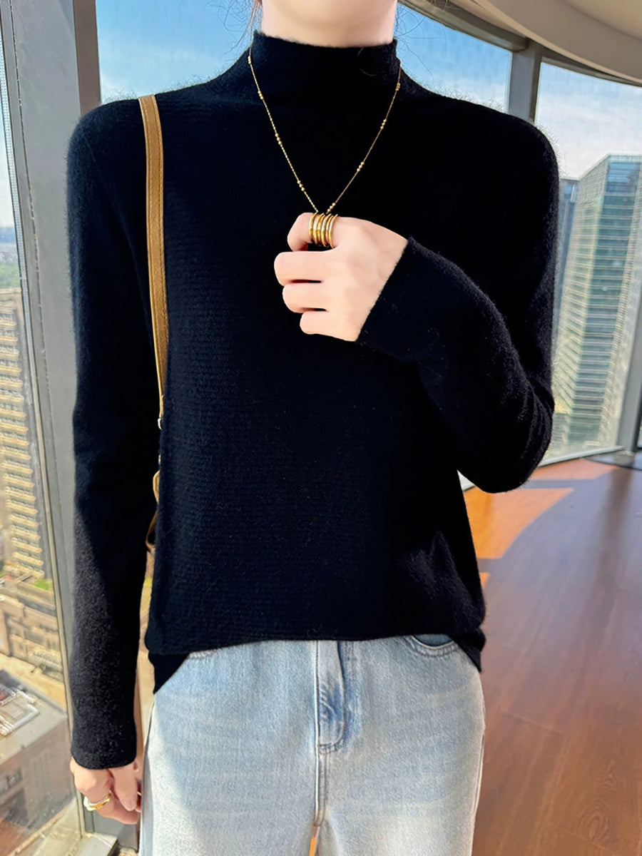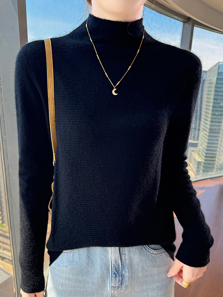 كنزة نسائية خريفية فنية بلون موحد بياقة نصف مدورة