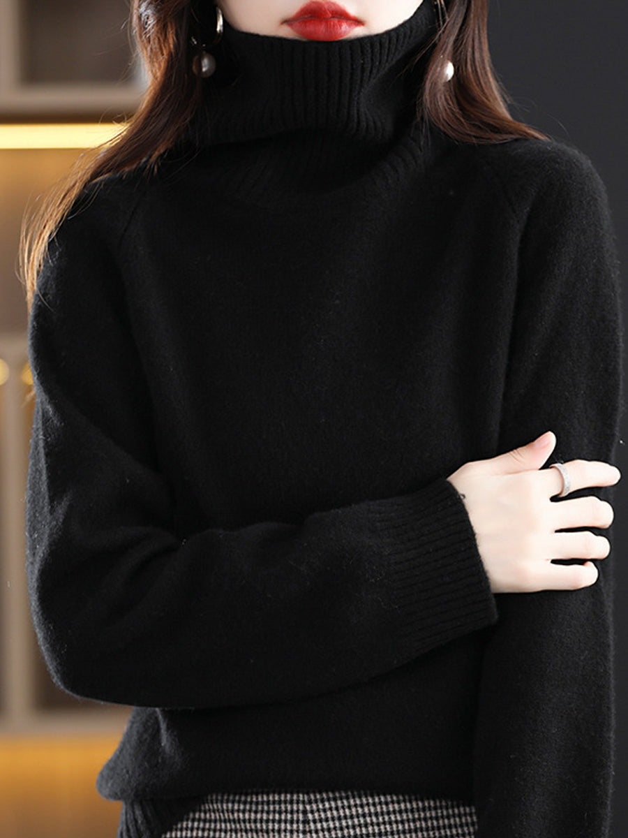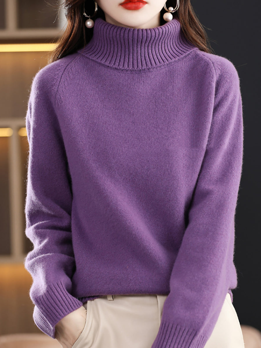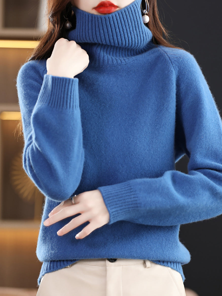 كنزة نسائية خريفية فنية بلون موحد بياقة عالية