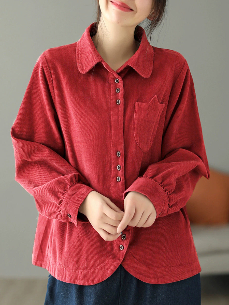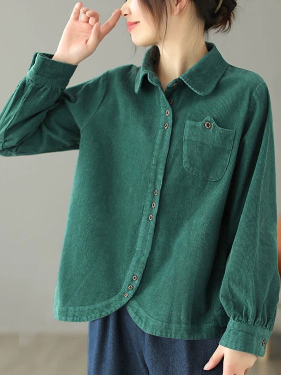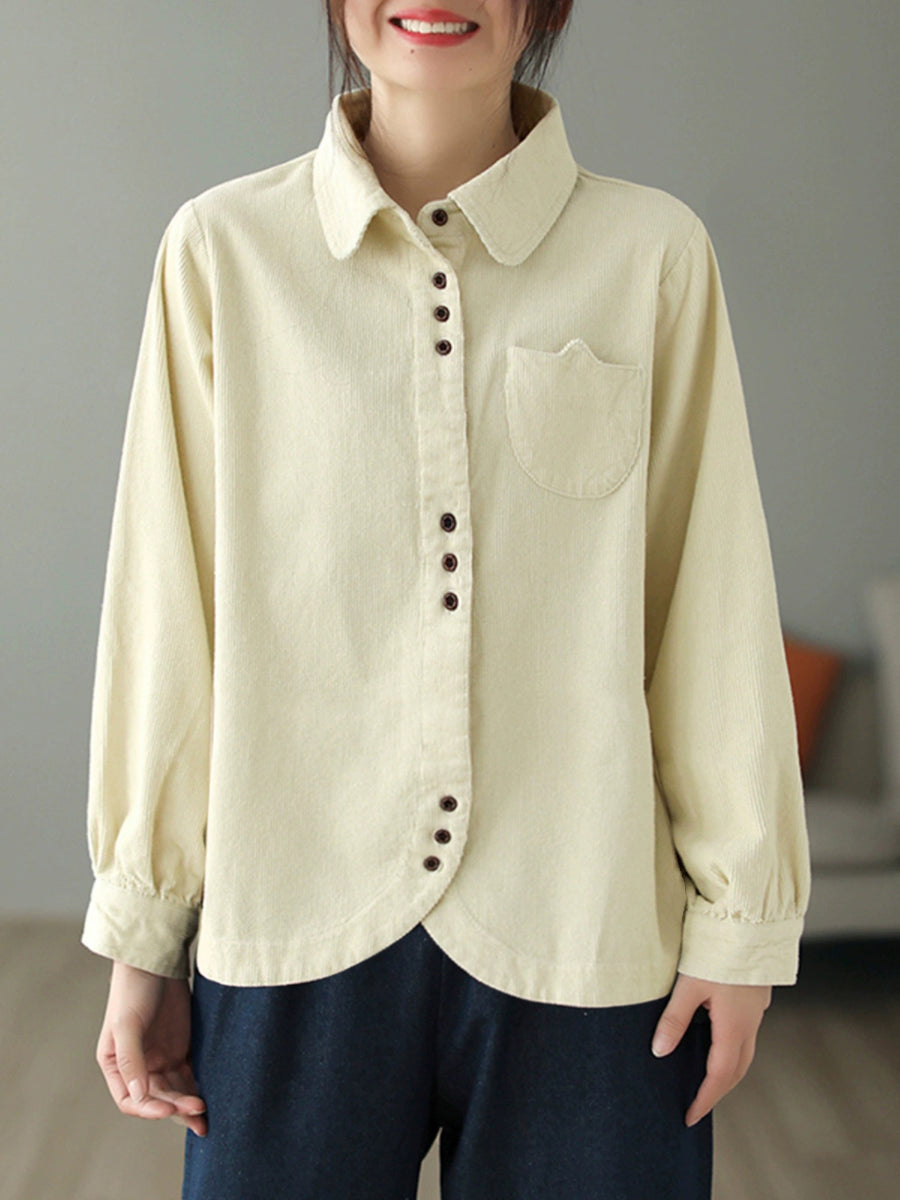 قميص نسائي خريفي من قماش مخملي بياقة مطوية بلون نقي