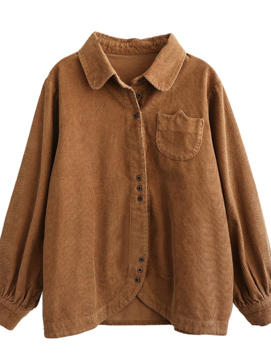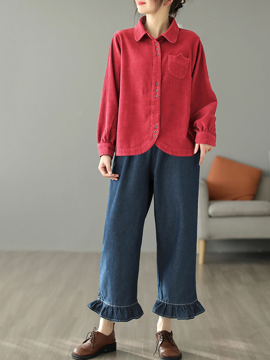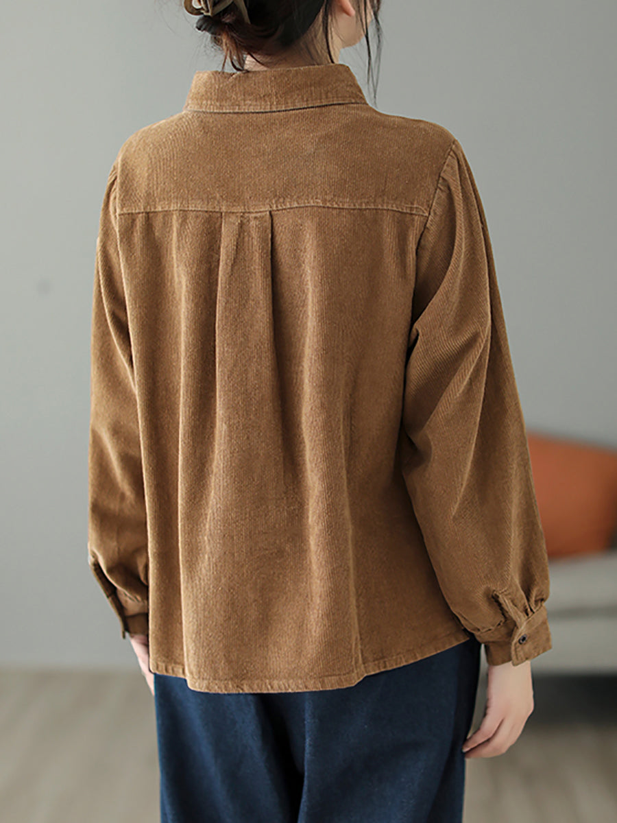 قميص نسائي خريفي من قماش مخملي بياقة مطوية بلون نقي