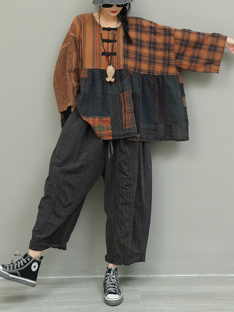 بدلات نسائية فضفاضة من القطن برقبة دائرية ومطرزة بنقشة مربعات من الخريف