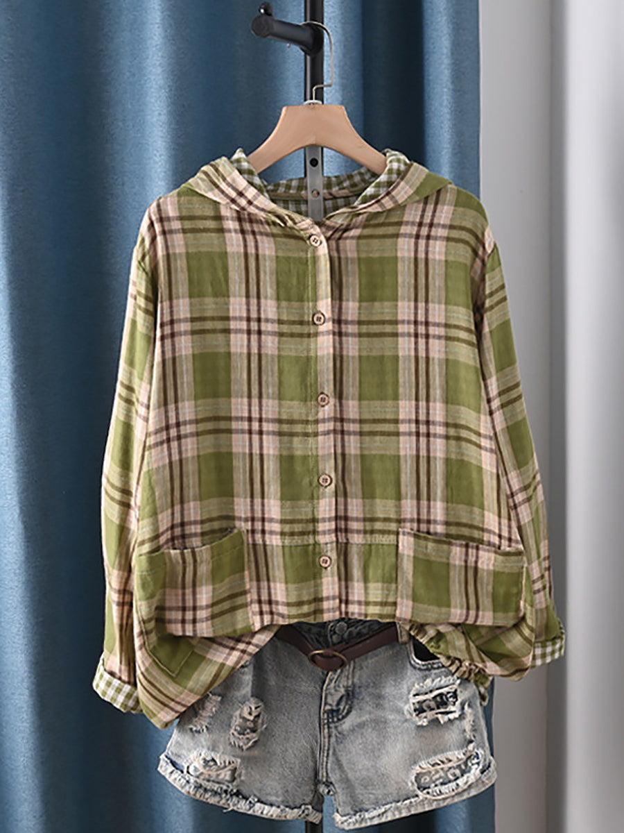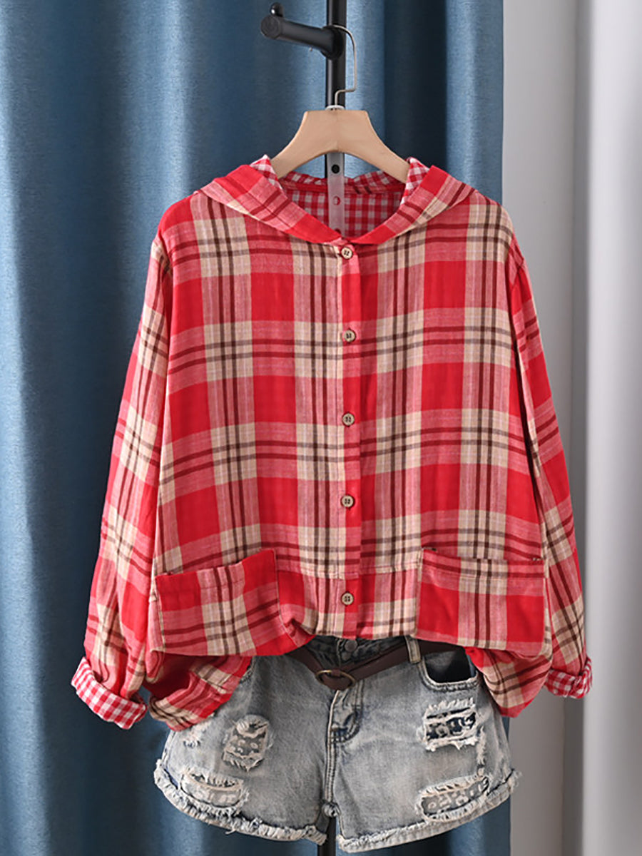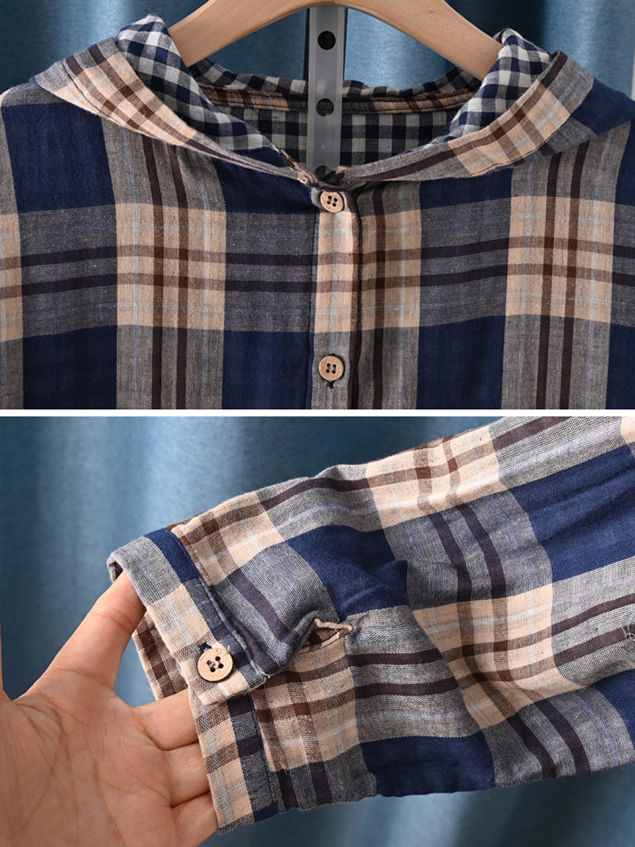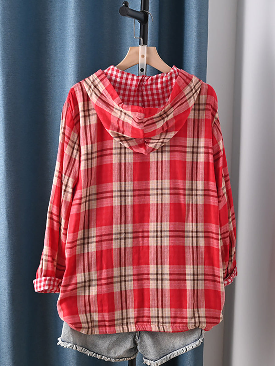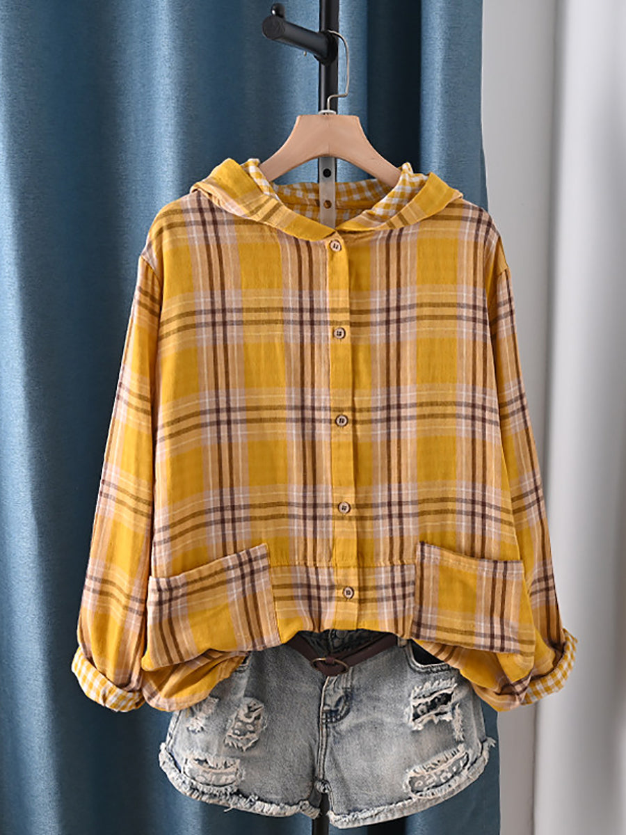 قميص نسائي كاجوال ربيعي بنقشة مربعات مصنوع من القطن بنسبة 100% مع غطاء للرأس