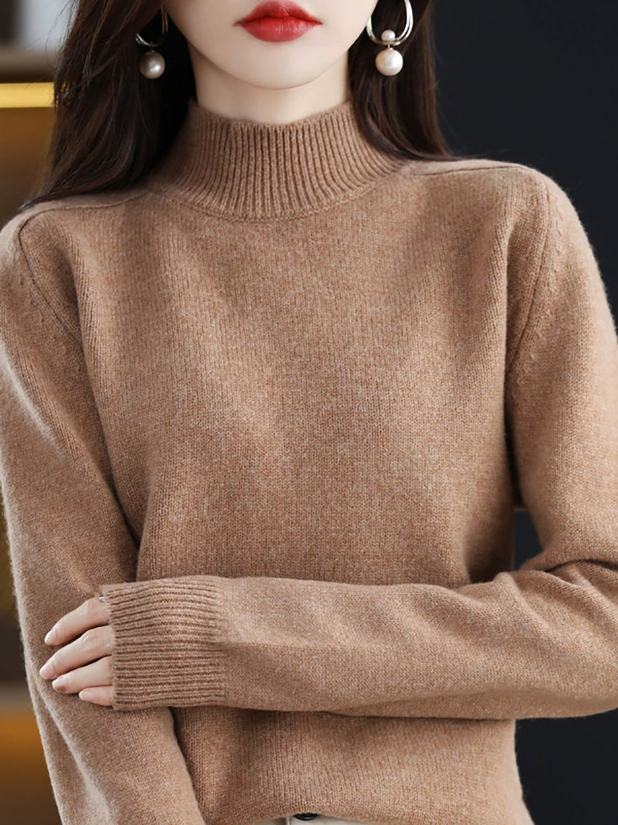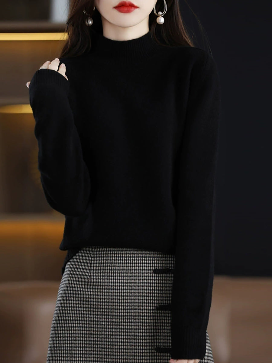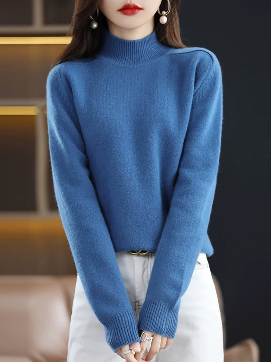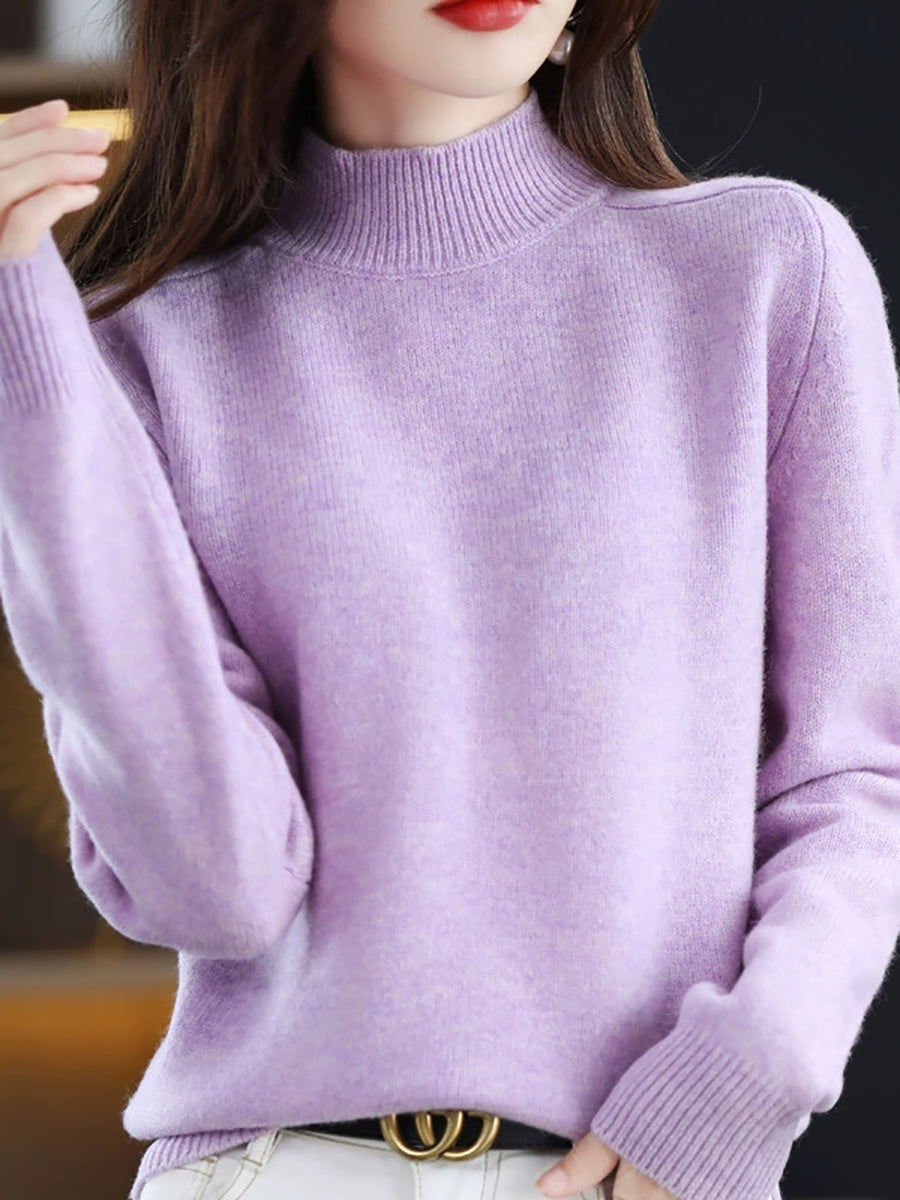 كنزة شتوية نسائية كاجوال بلون موحد بياقة نصف مدورة