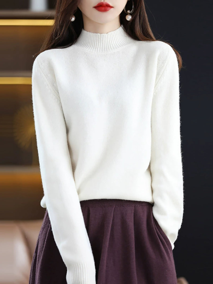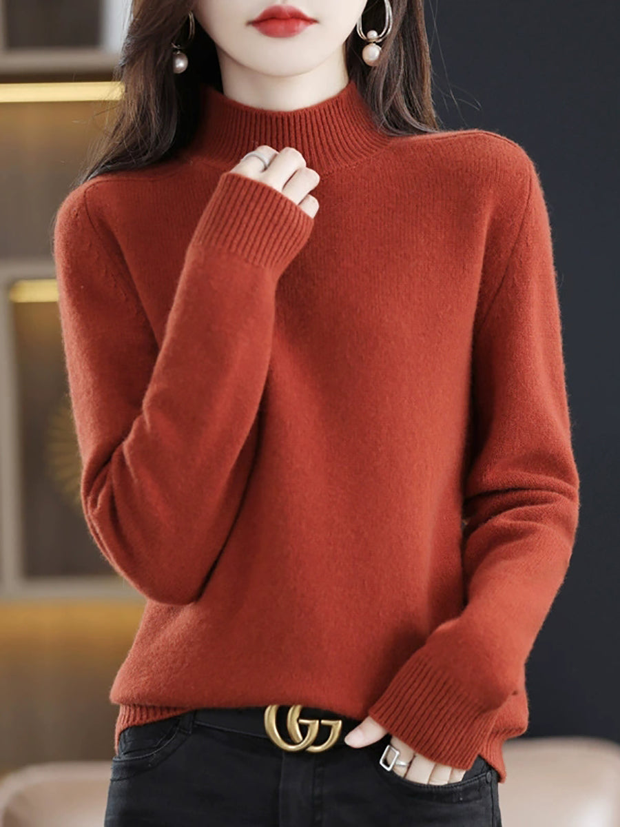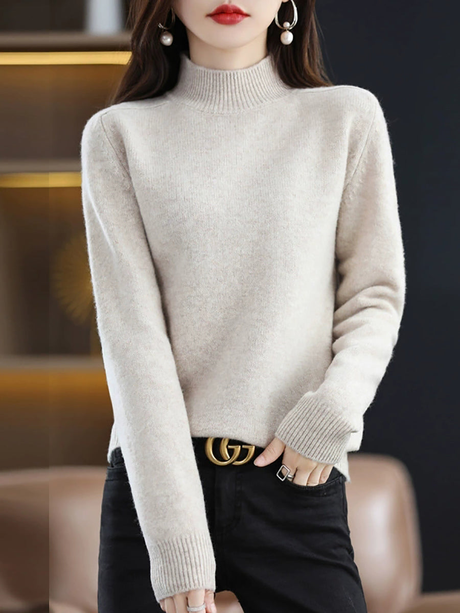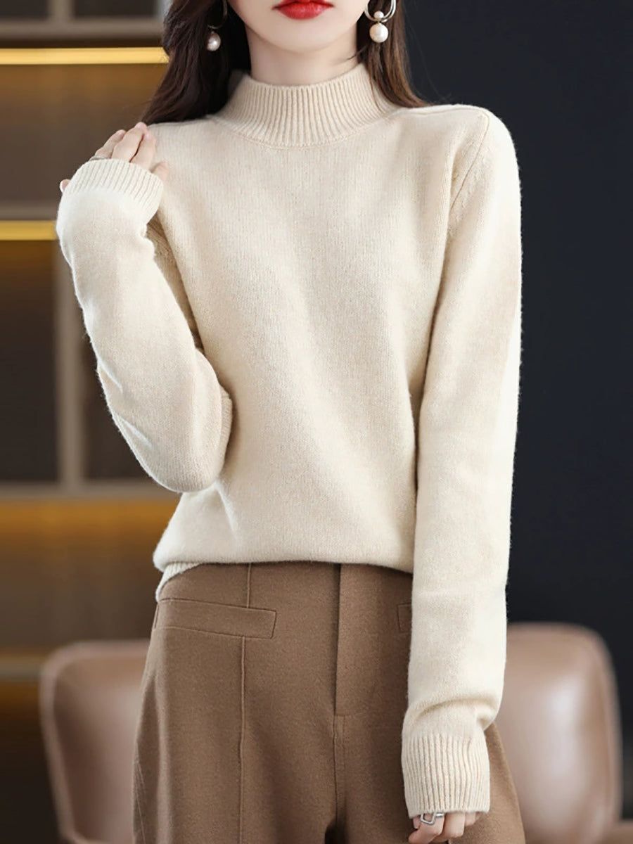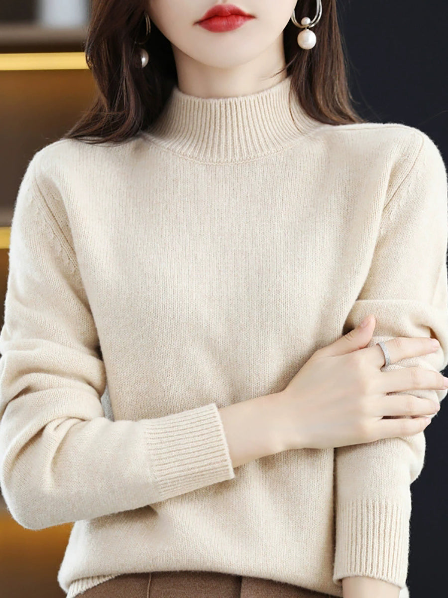 كنزة شتوية نسائية كاجوال بلون موحد بياقة نصف مدورة