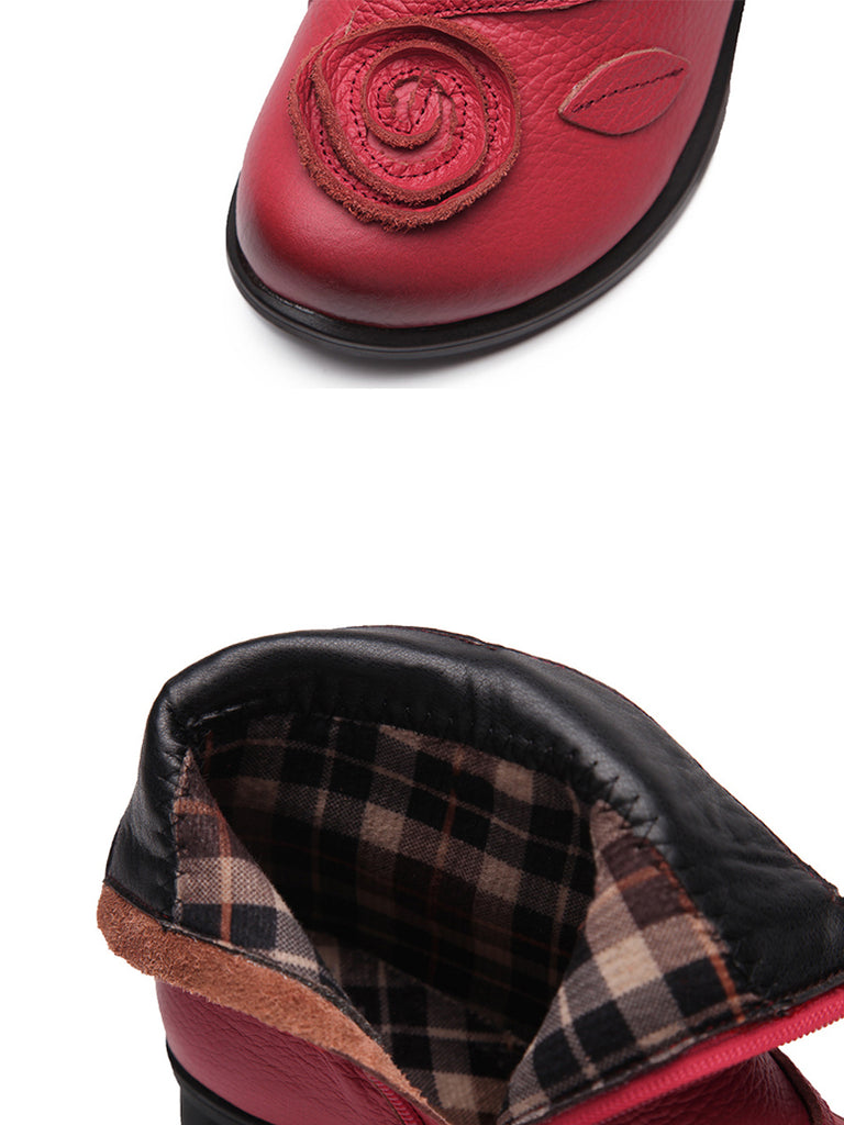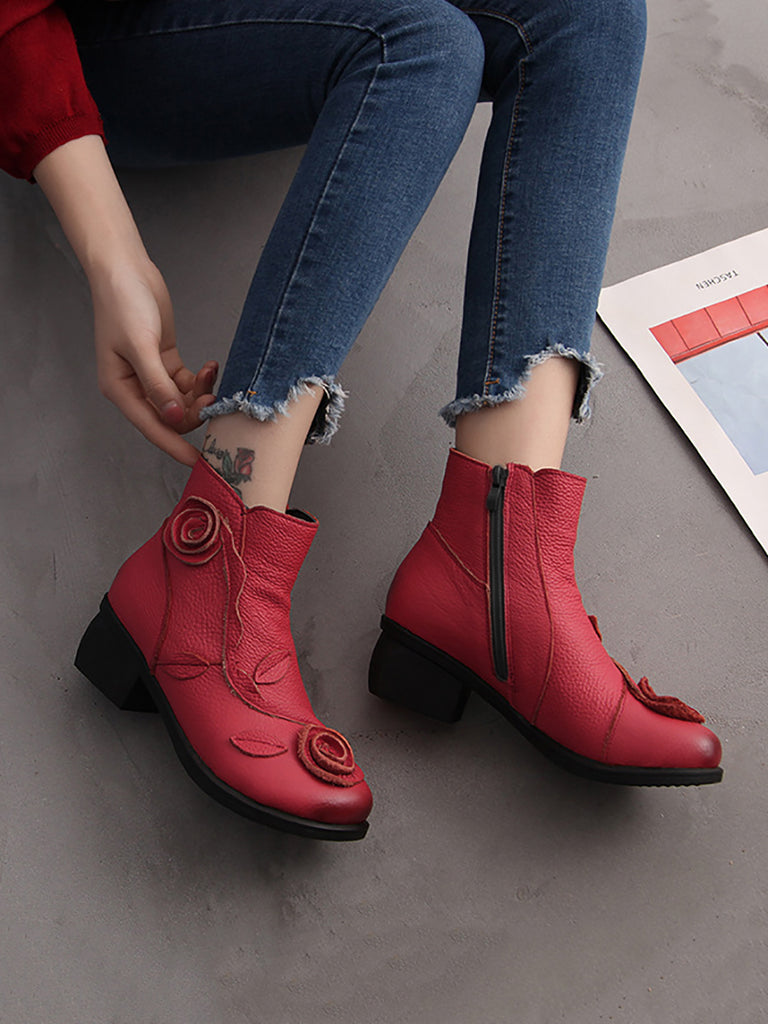 أحذية نسائية ذات كعب متوسط صلبة من الجلد على شكل زهرة ريترو