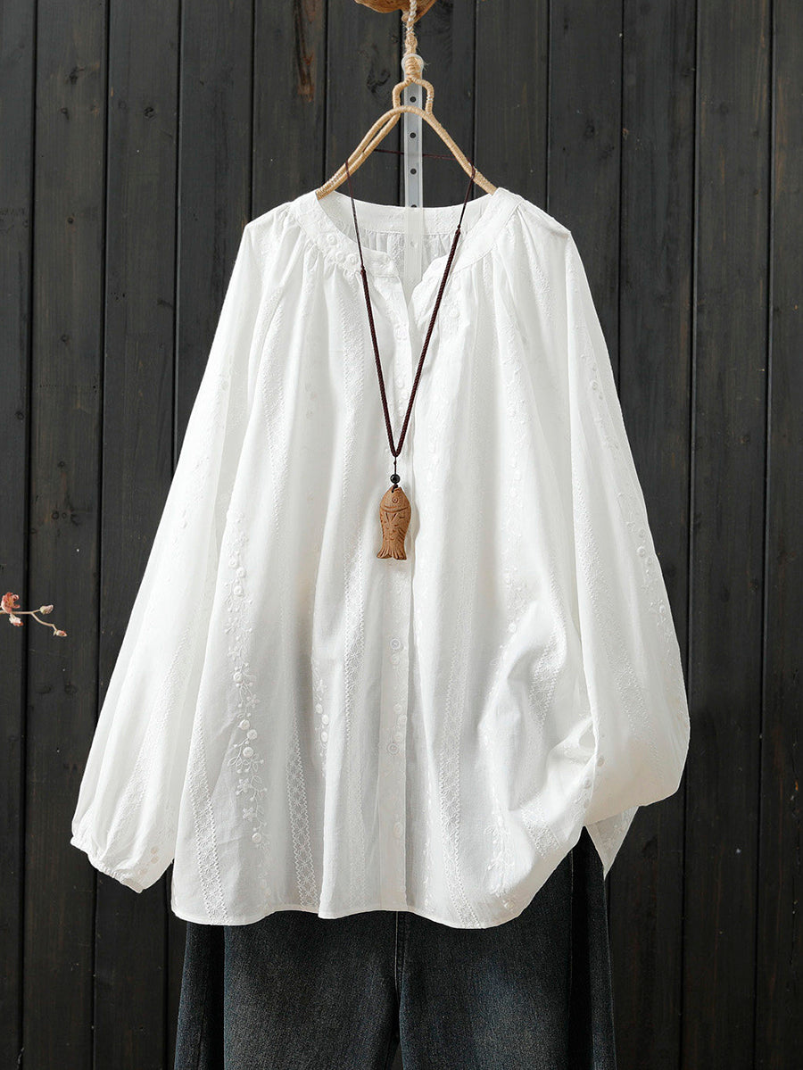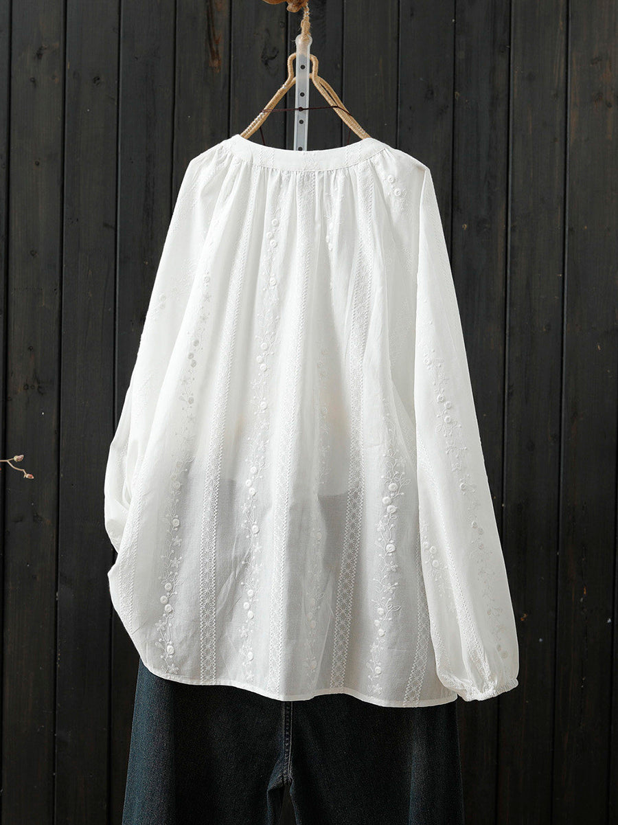 قميص نسائي ربيعي مطرز فني من القطن برقبة دائرية