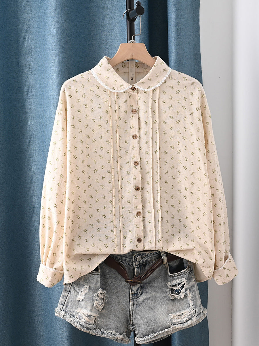 قميص نسائي ربيعي مزين بنقوش زهور فنية، مصنوع من القطن الخالص 100%، بياقة مطوية.