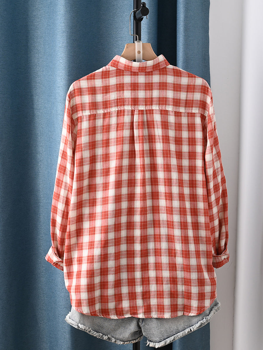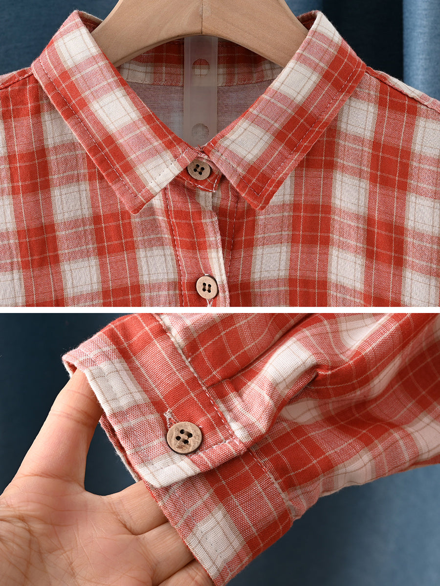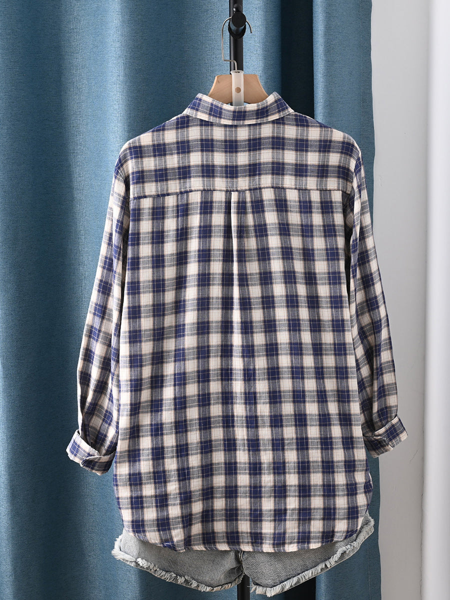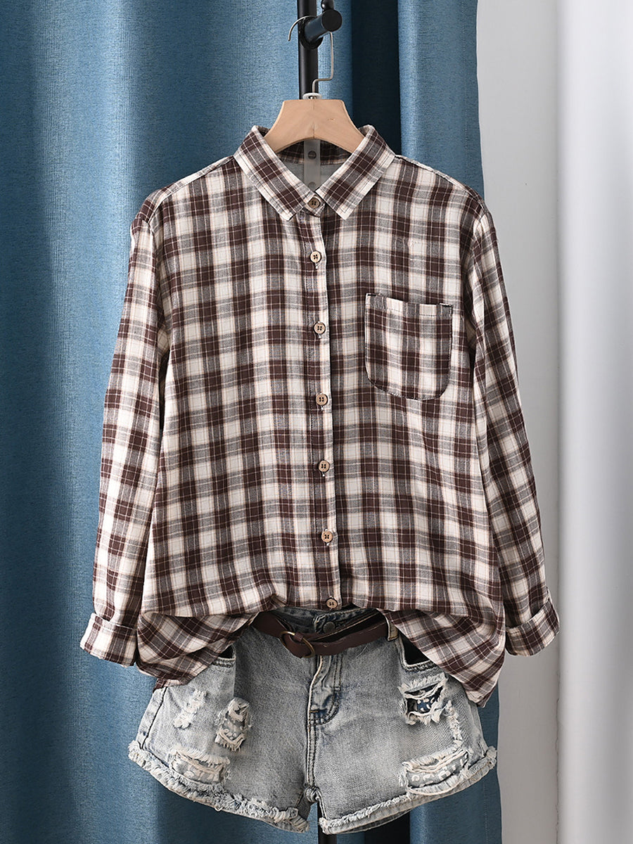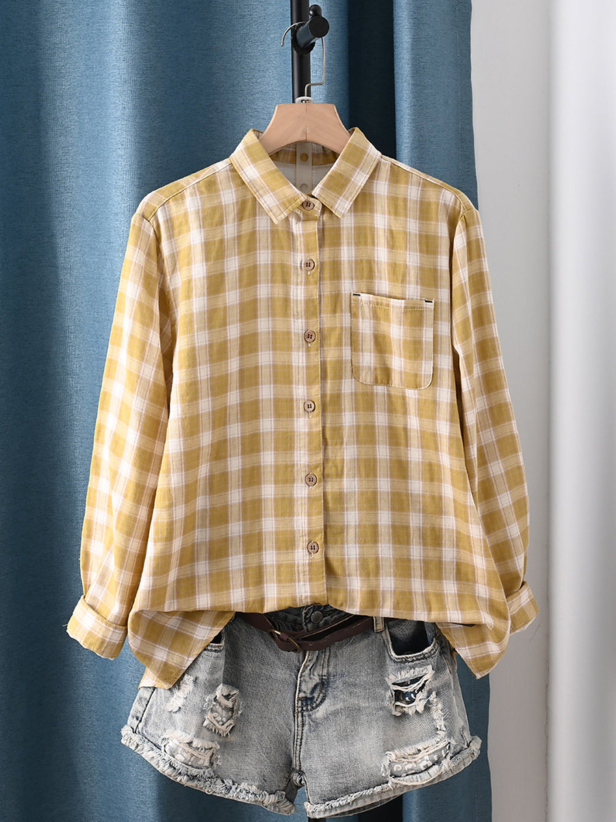 قميص نسائي ربيعي أنيق بنقشة مربعات وياقة مطوية، مصنوع من القطن بنسبة 100%