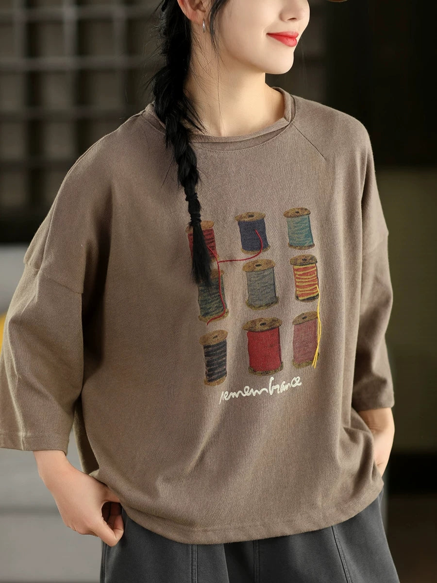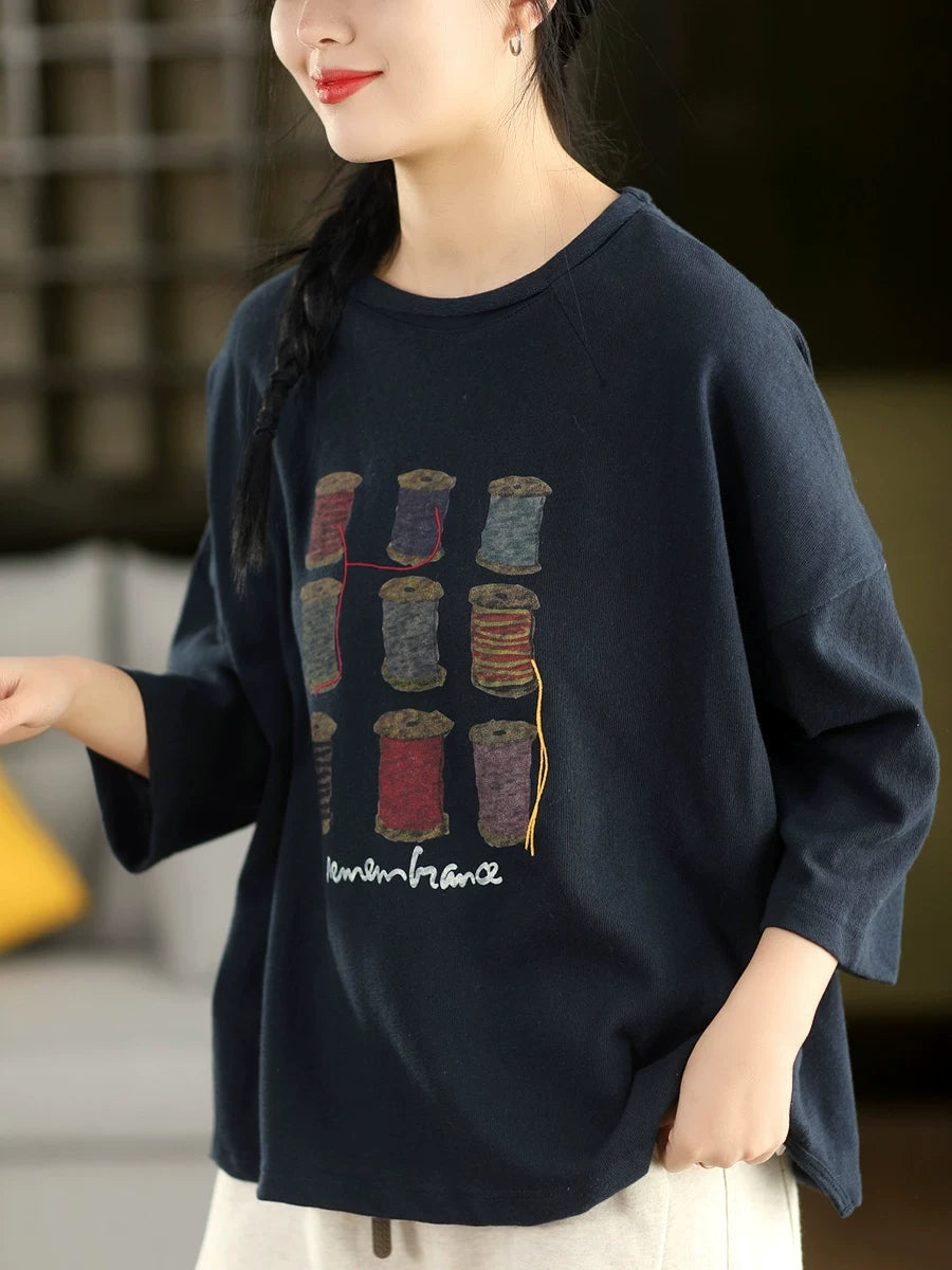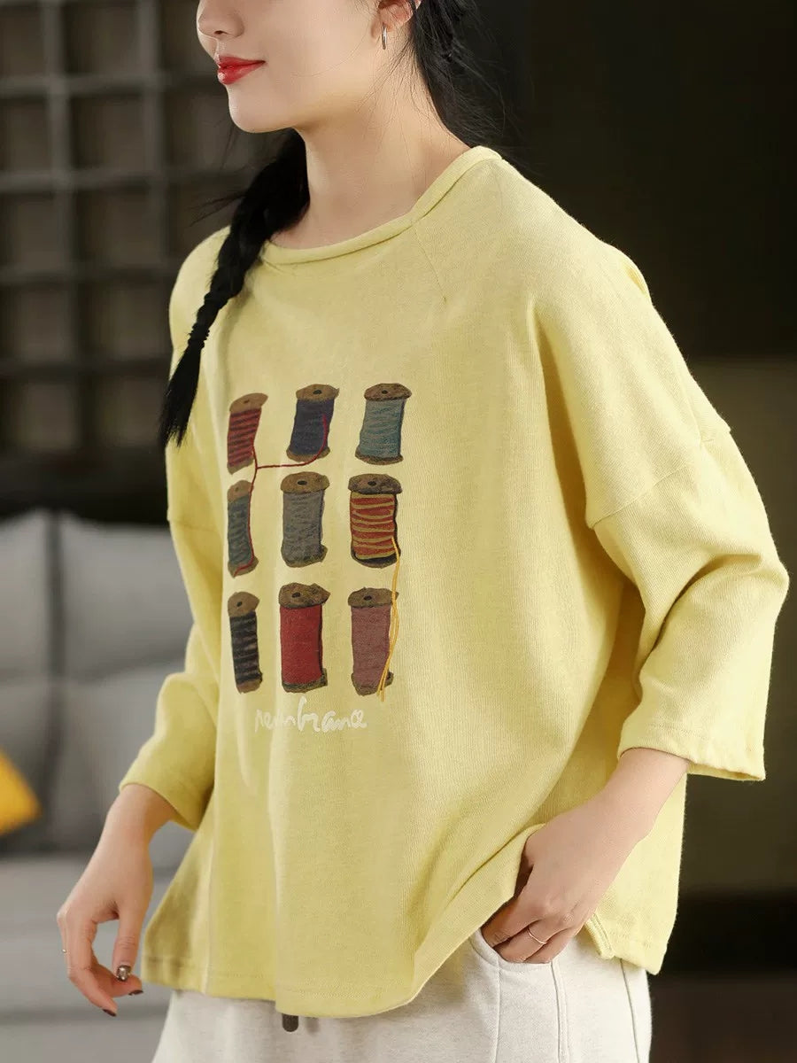 بلوزة نسائية ربيعية مطبوعة بنمط فني من القطن برقبة دائرية