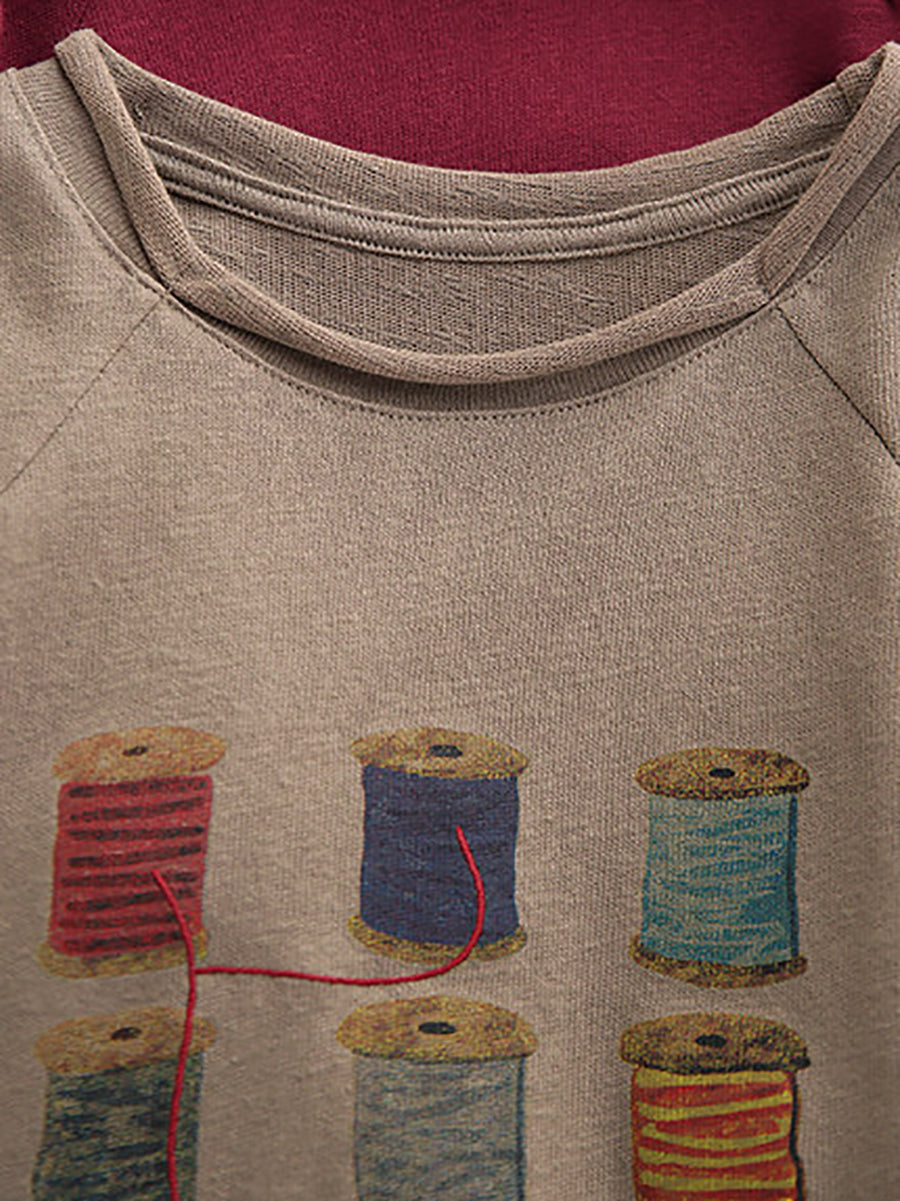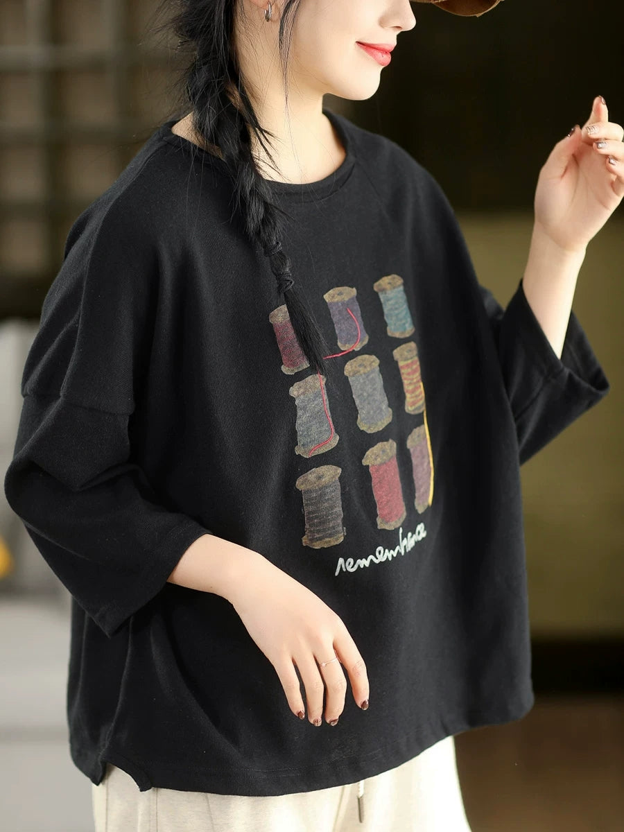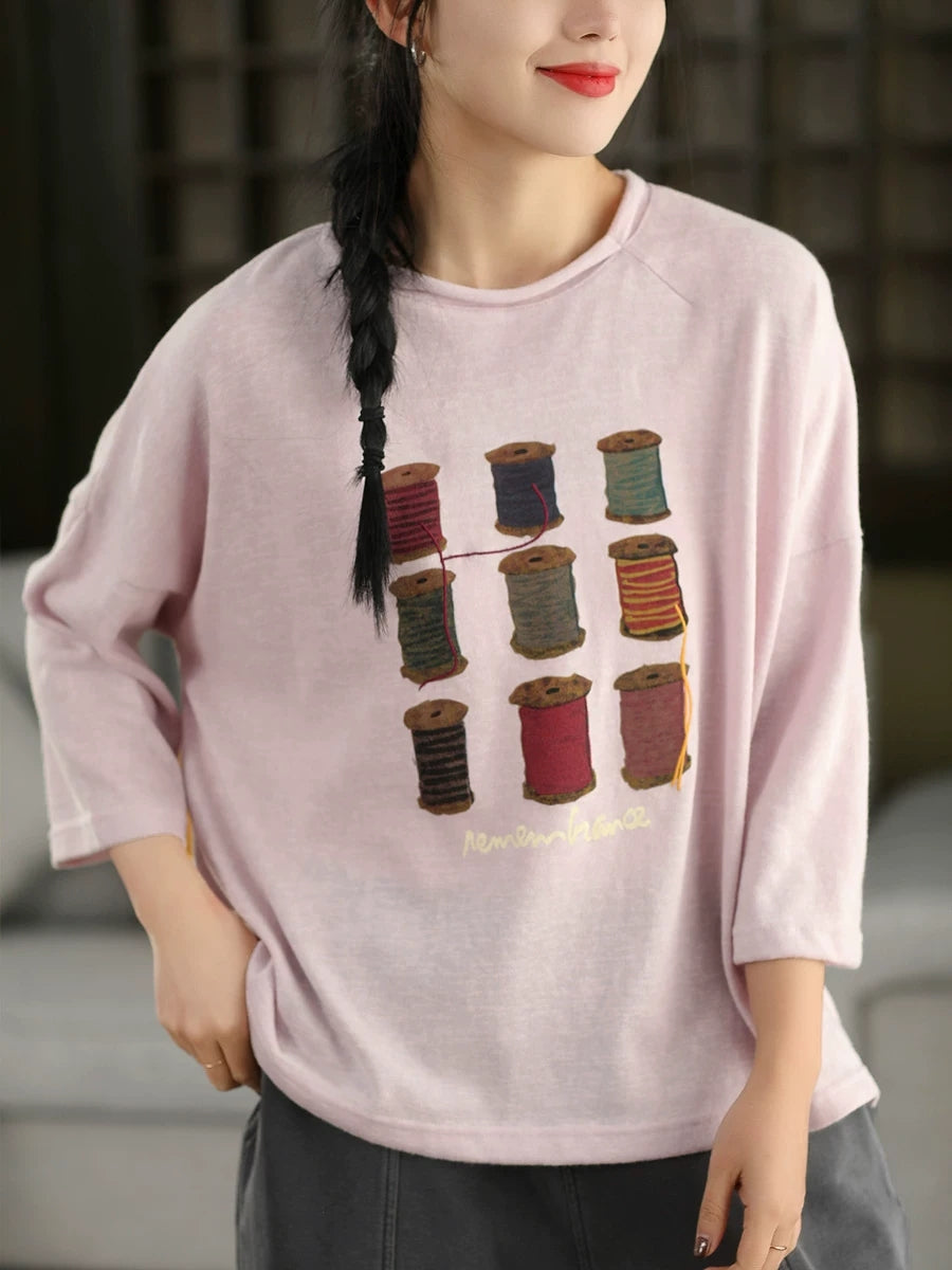 بلوزة نسائية ربيعية مطبوعة بنمط فني من القطن برقبة دائرية