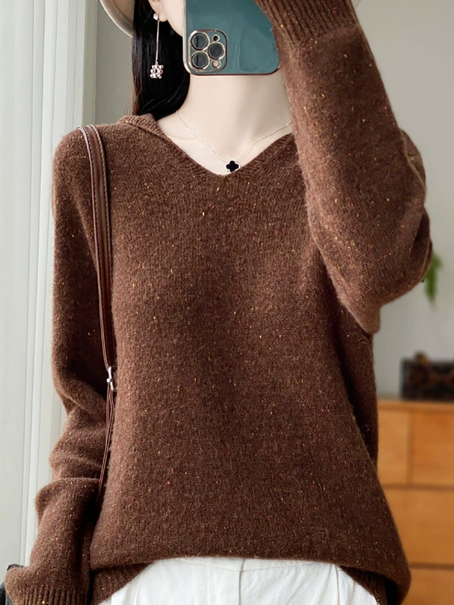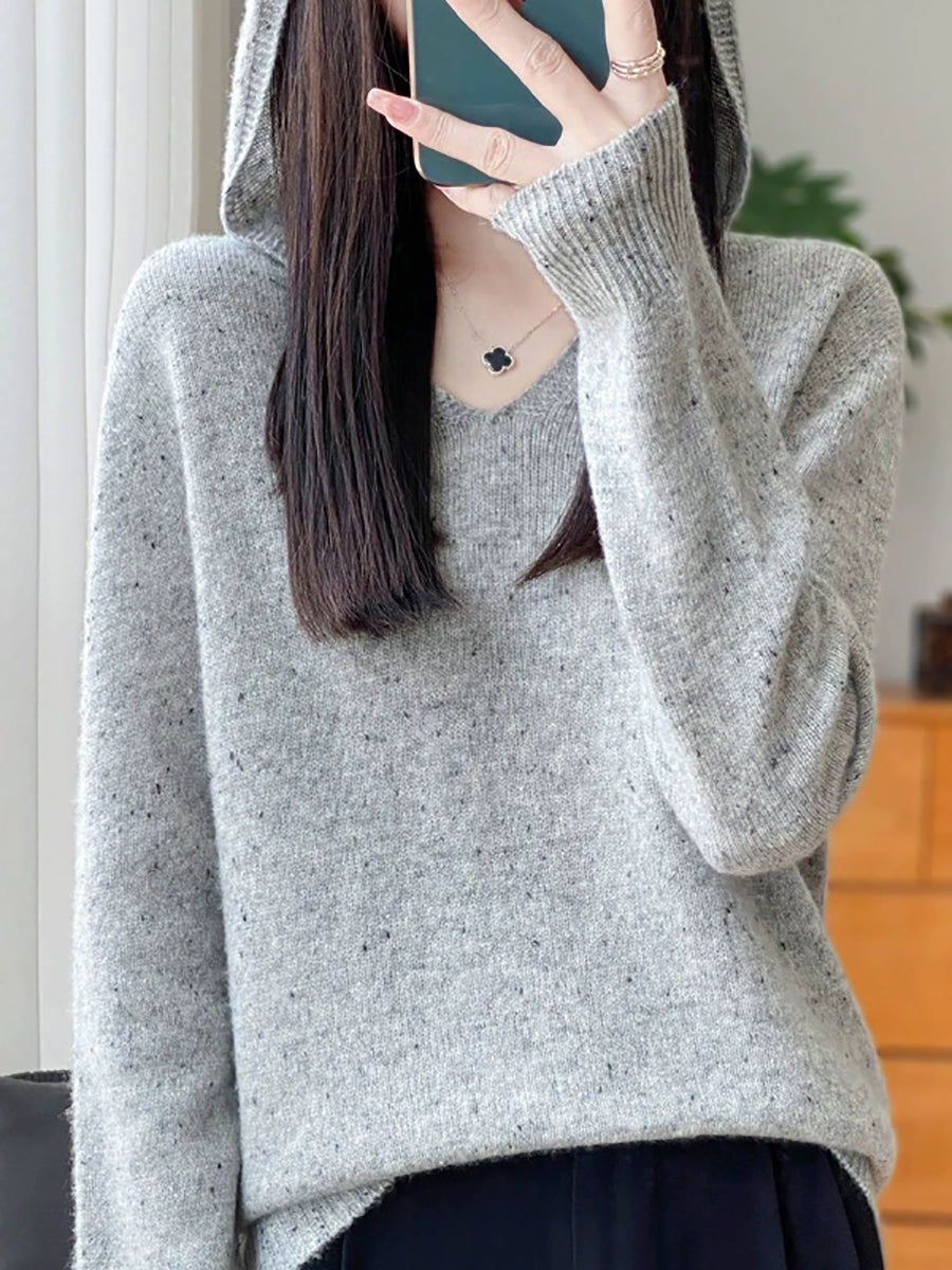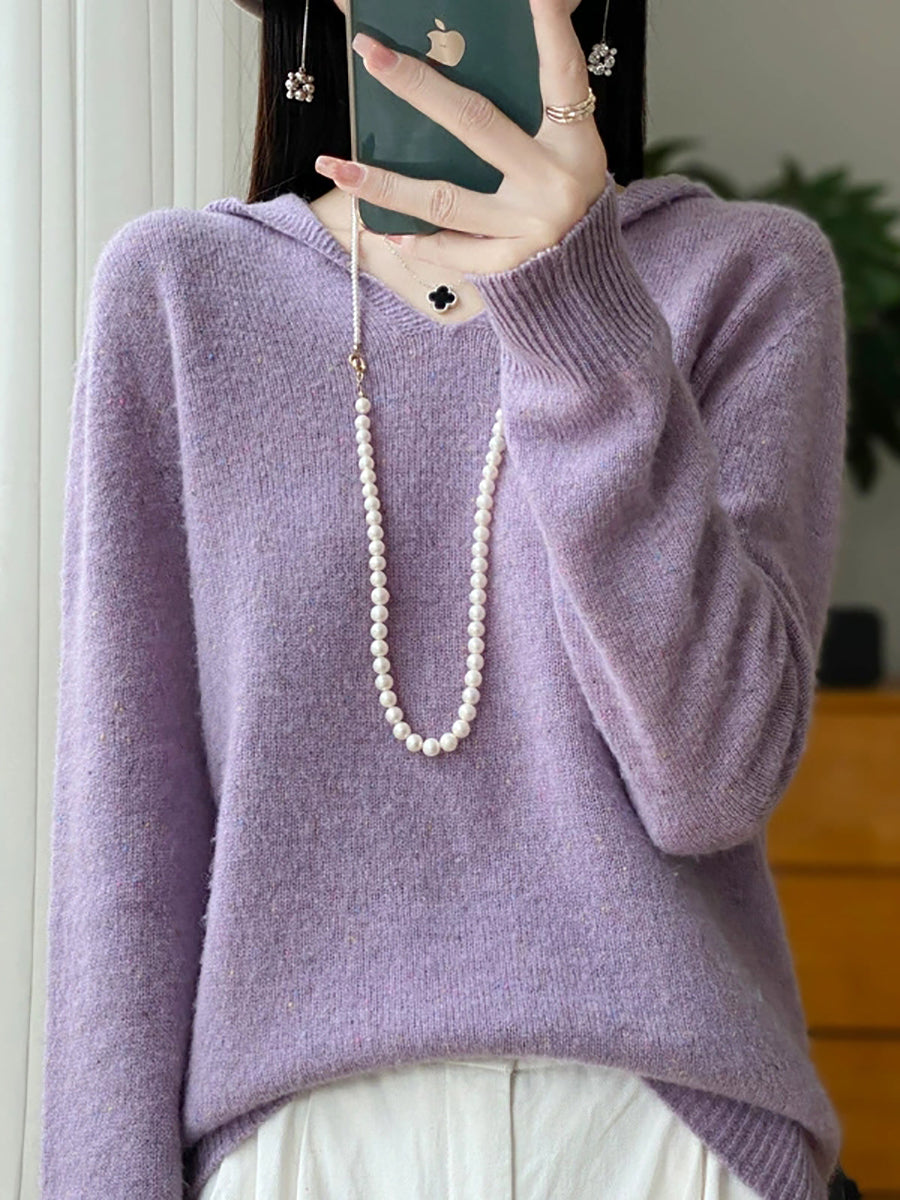 كنزة صوفية نسائية ربيعية فنية بألوان سادة بغطاء رأس