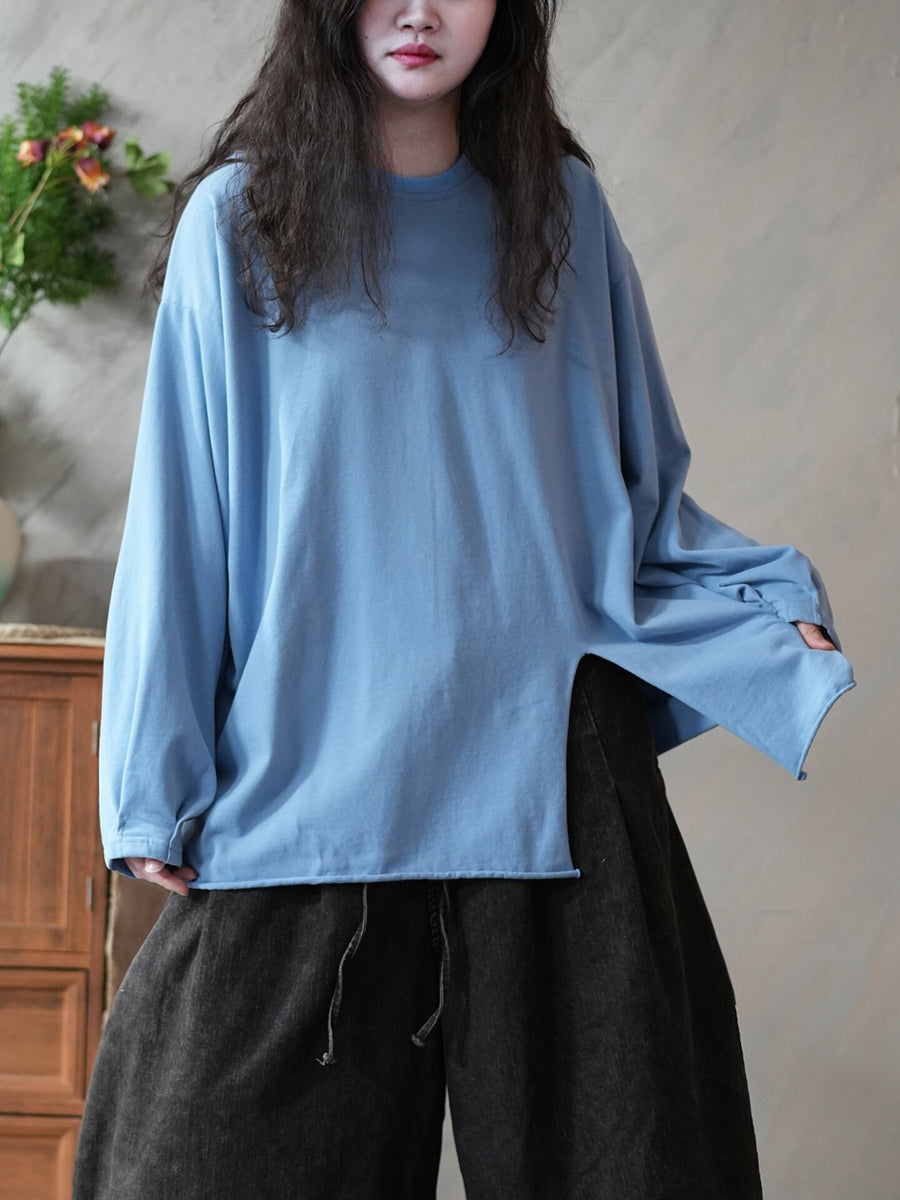 بلوزة نسائية ربيعية فنية بلون موحد بفتحة جانبية وياقة دائرية