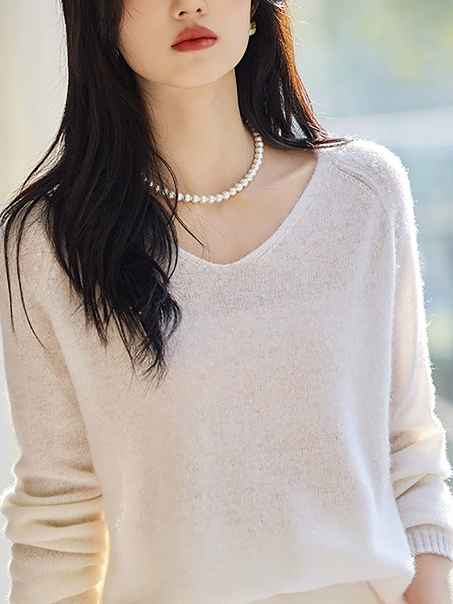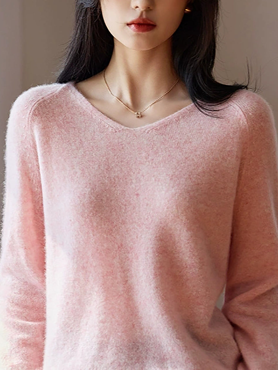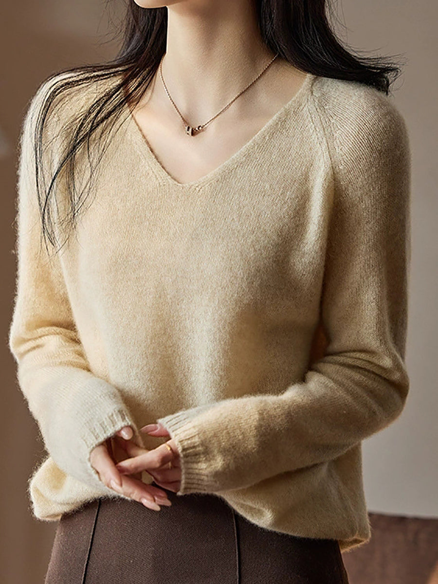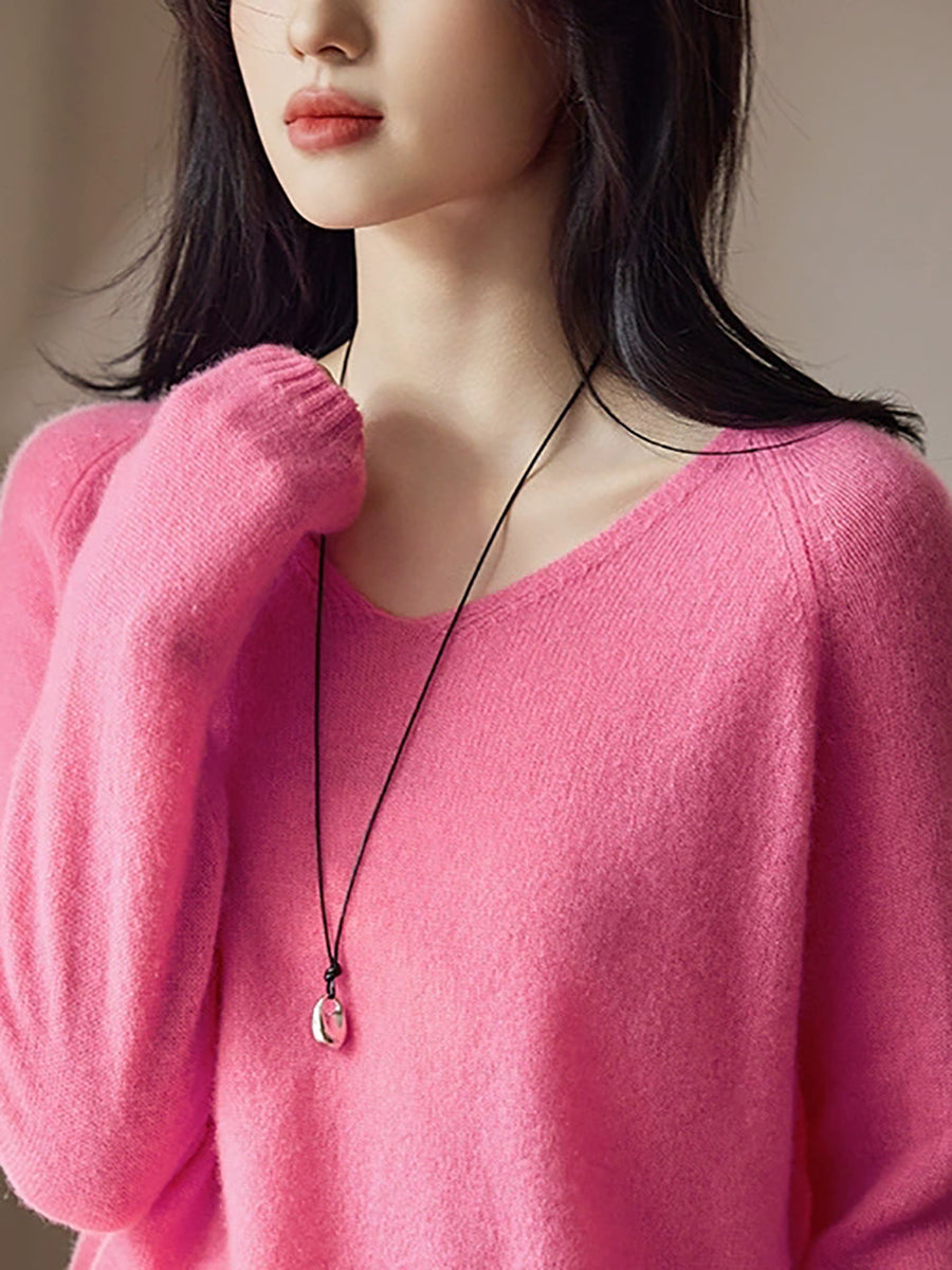 كنزة صوفية نسائية ربيعية فنية بلون موحد بياقة على شكل حرف V