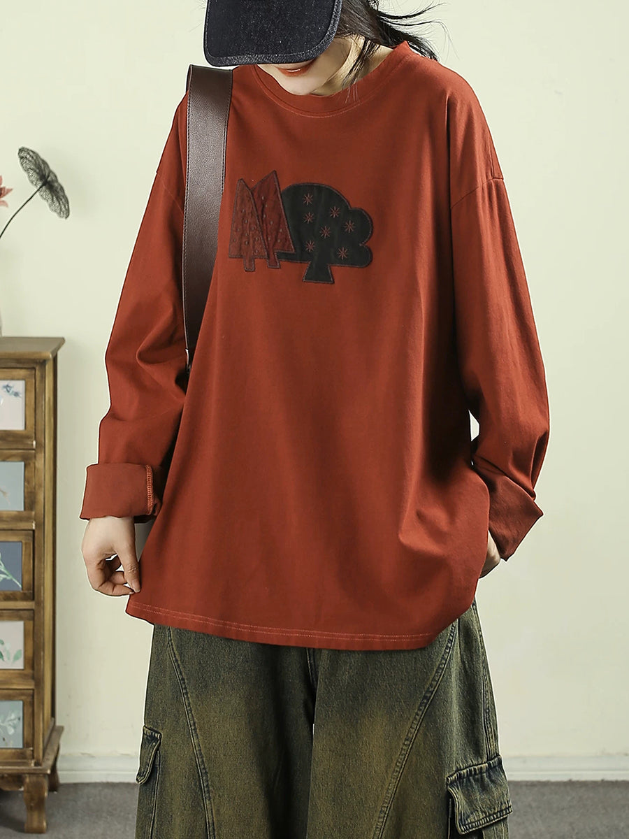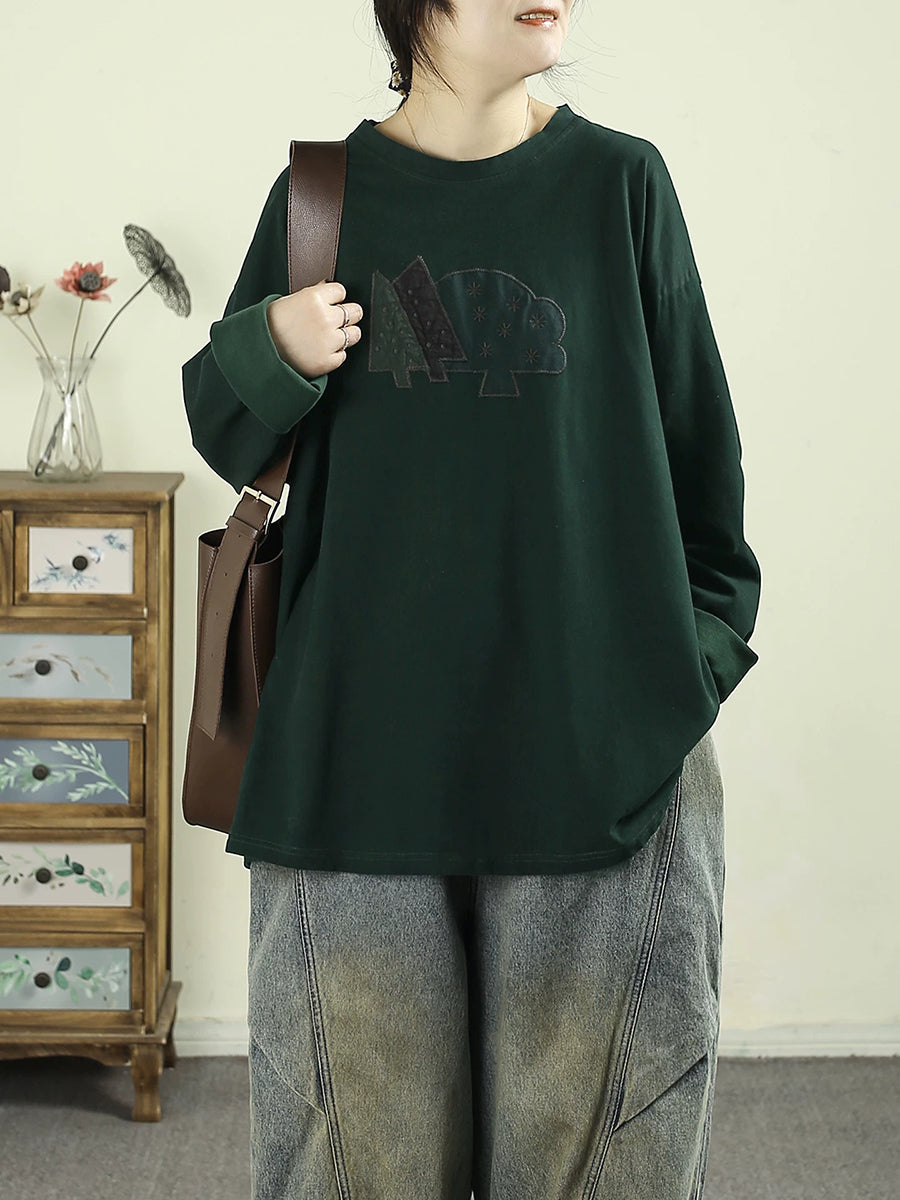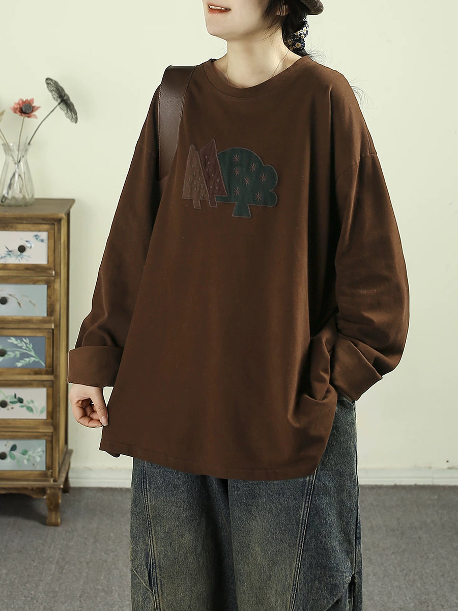 بلوزة نسائية ربيعية مزينة بنقشة شجرة فنية، بياقة دائرية، مصنوعة من القطن الخالص 100%