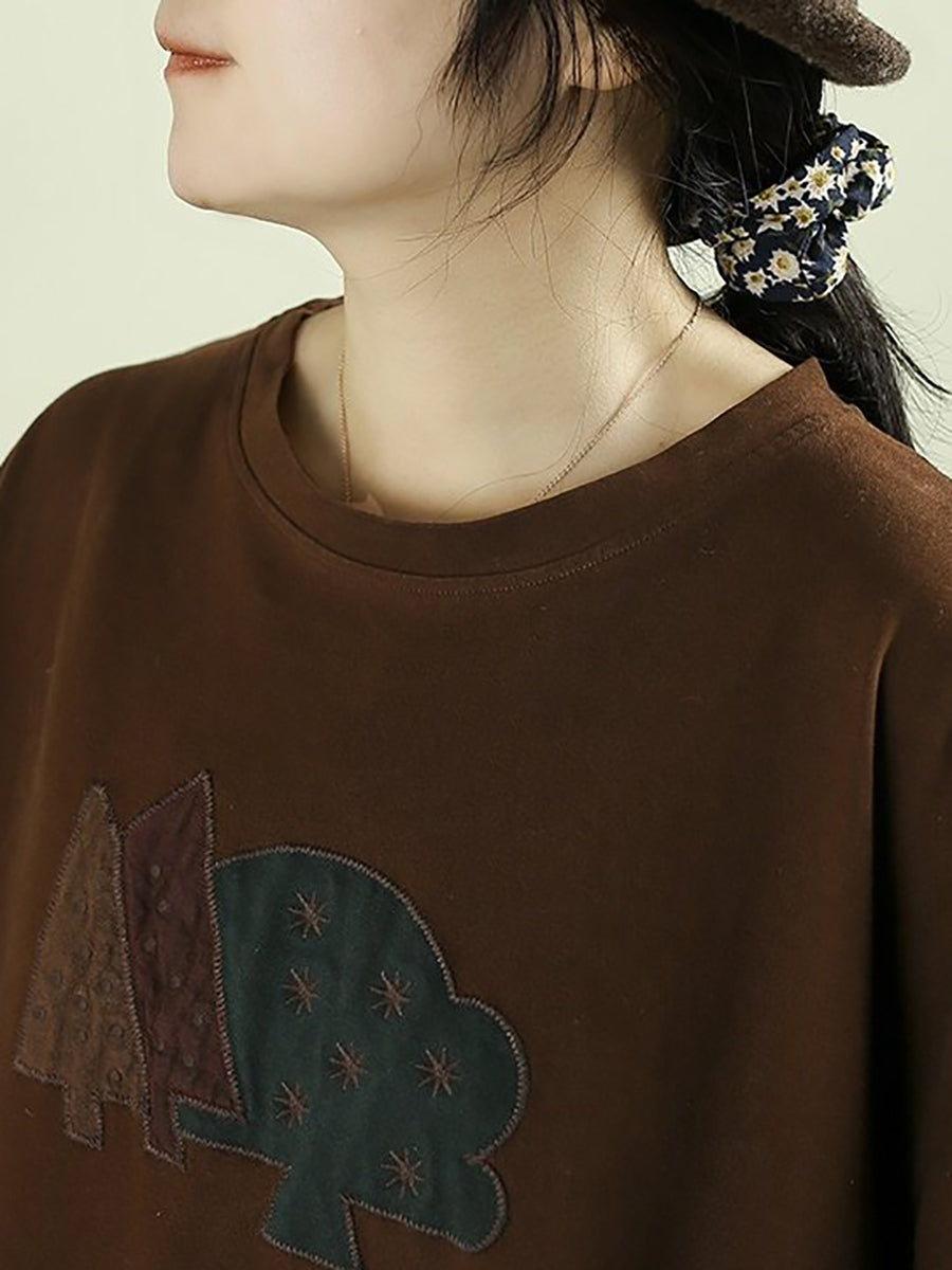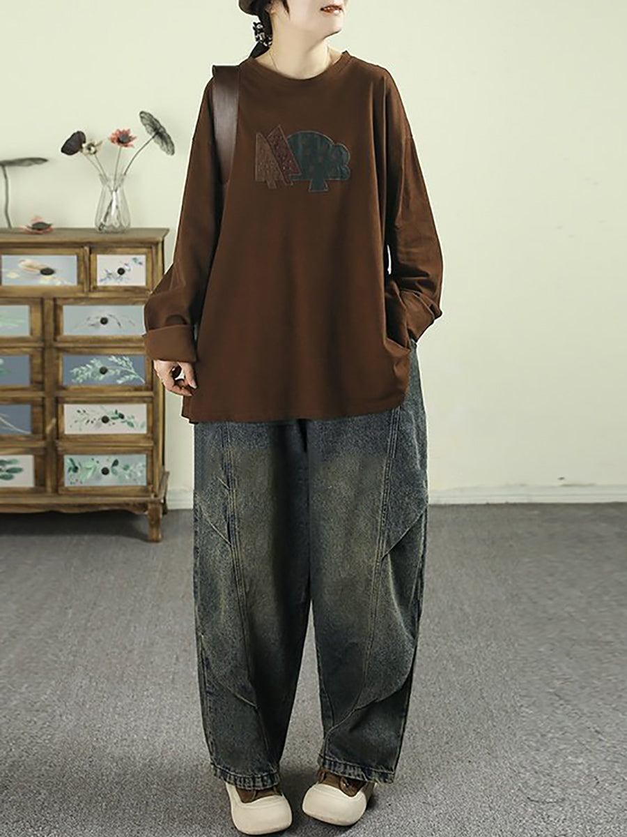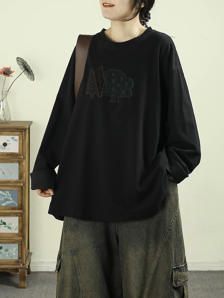 بلوزة نسائية ربيعية مزينة بنقشة شجرة فنية، بياقة دائرية، مصنوعة من القطن الخالص 100%