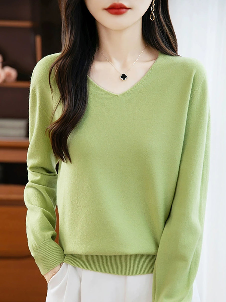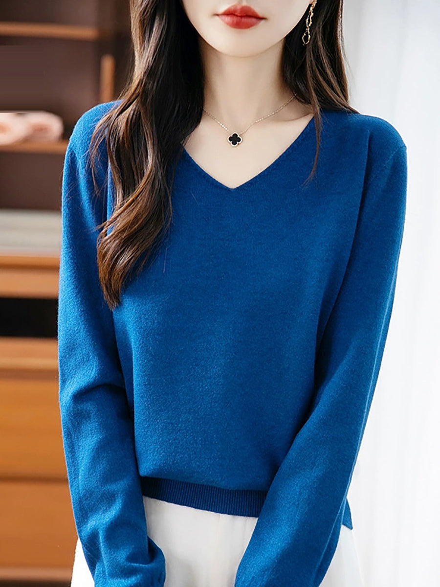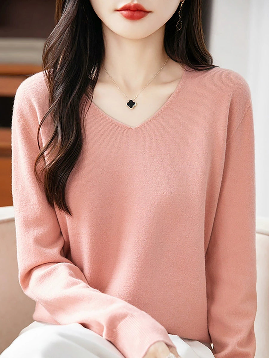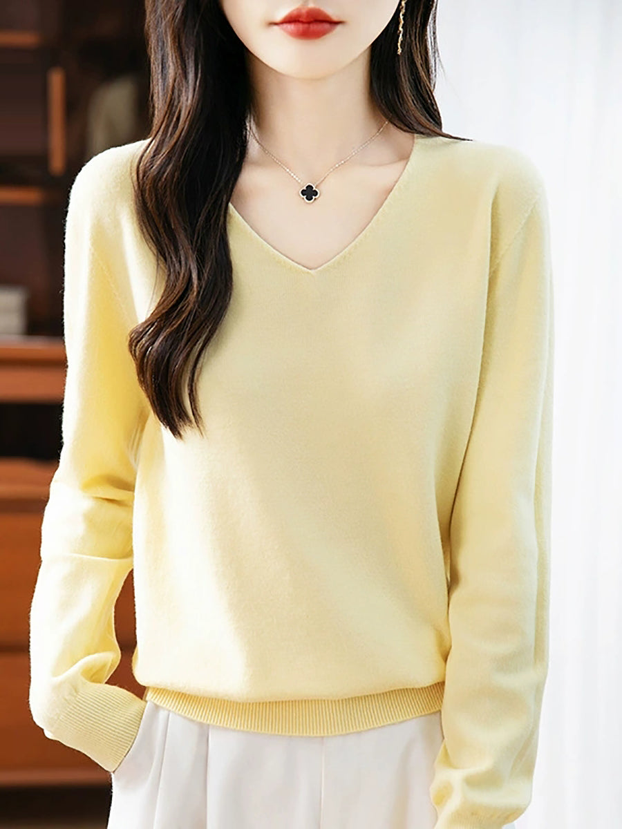 كنزة نسائية ربيعية كاجوال بلون موحد بياقة على شكل حرف V