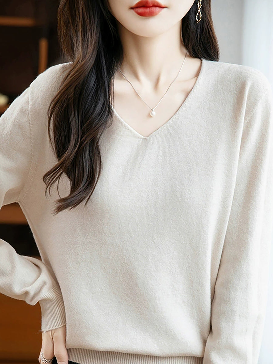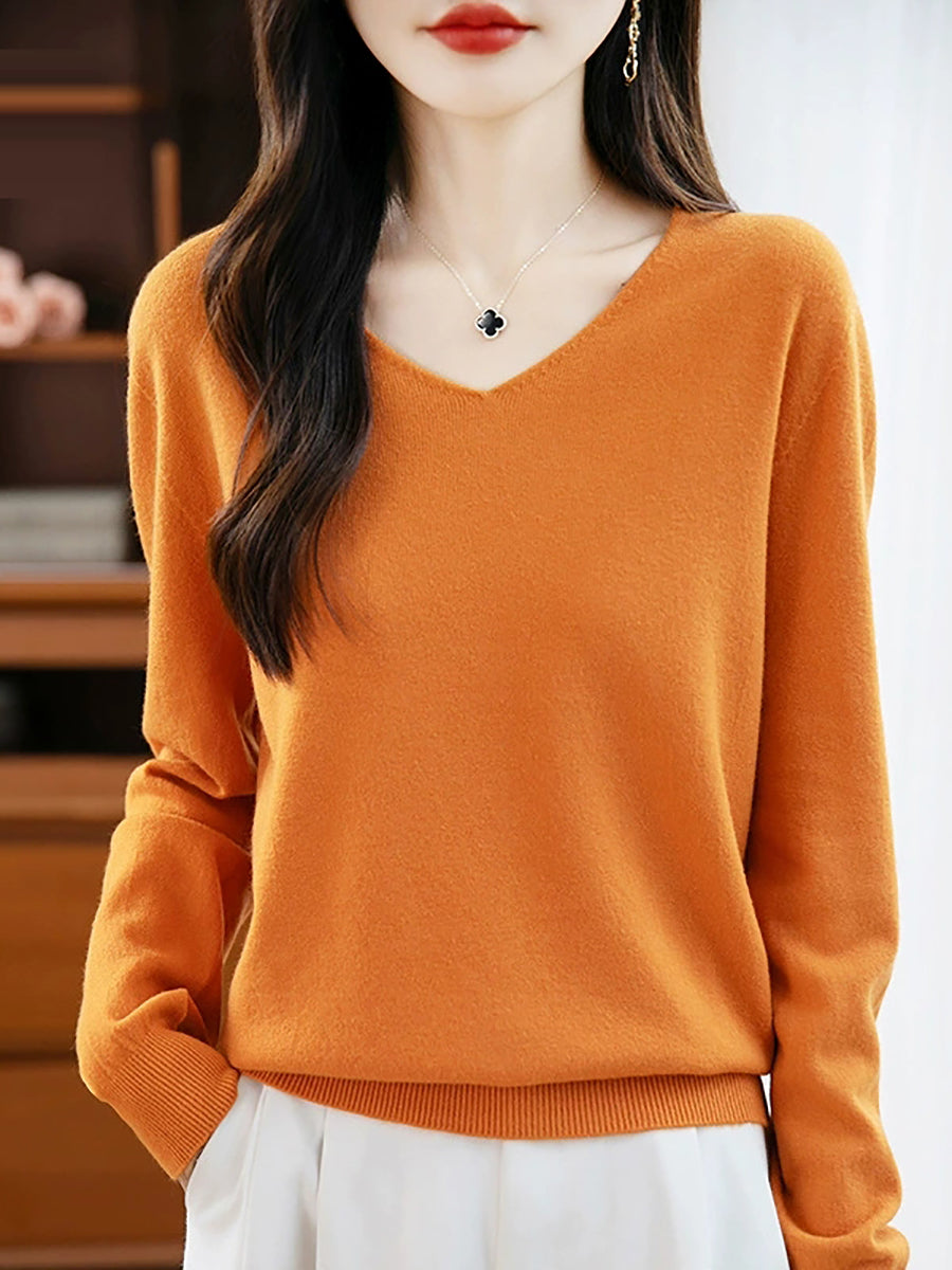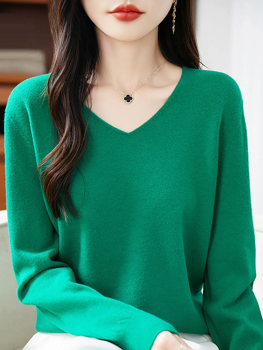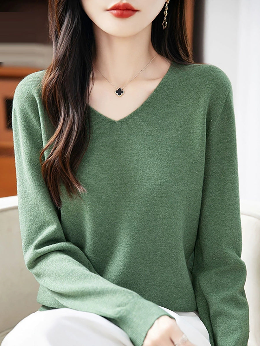 كنزة نسائية ربيعية كاجوال بلون موحد بياقة على شكل حرف V