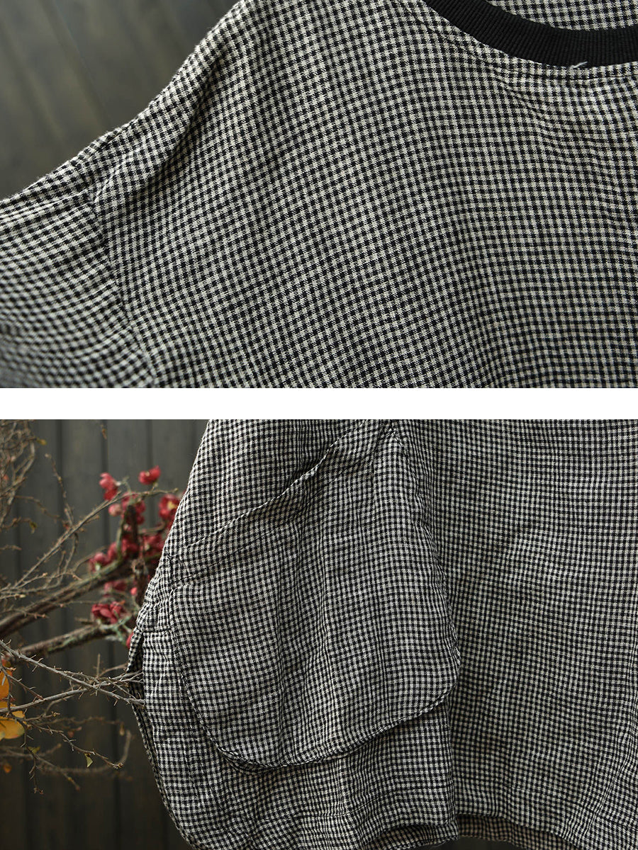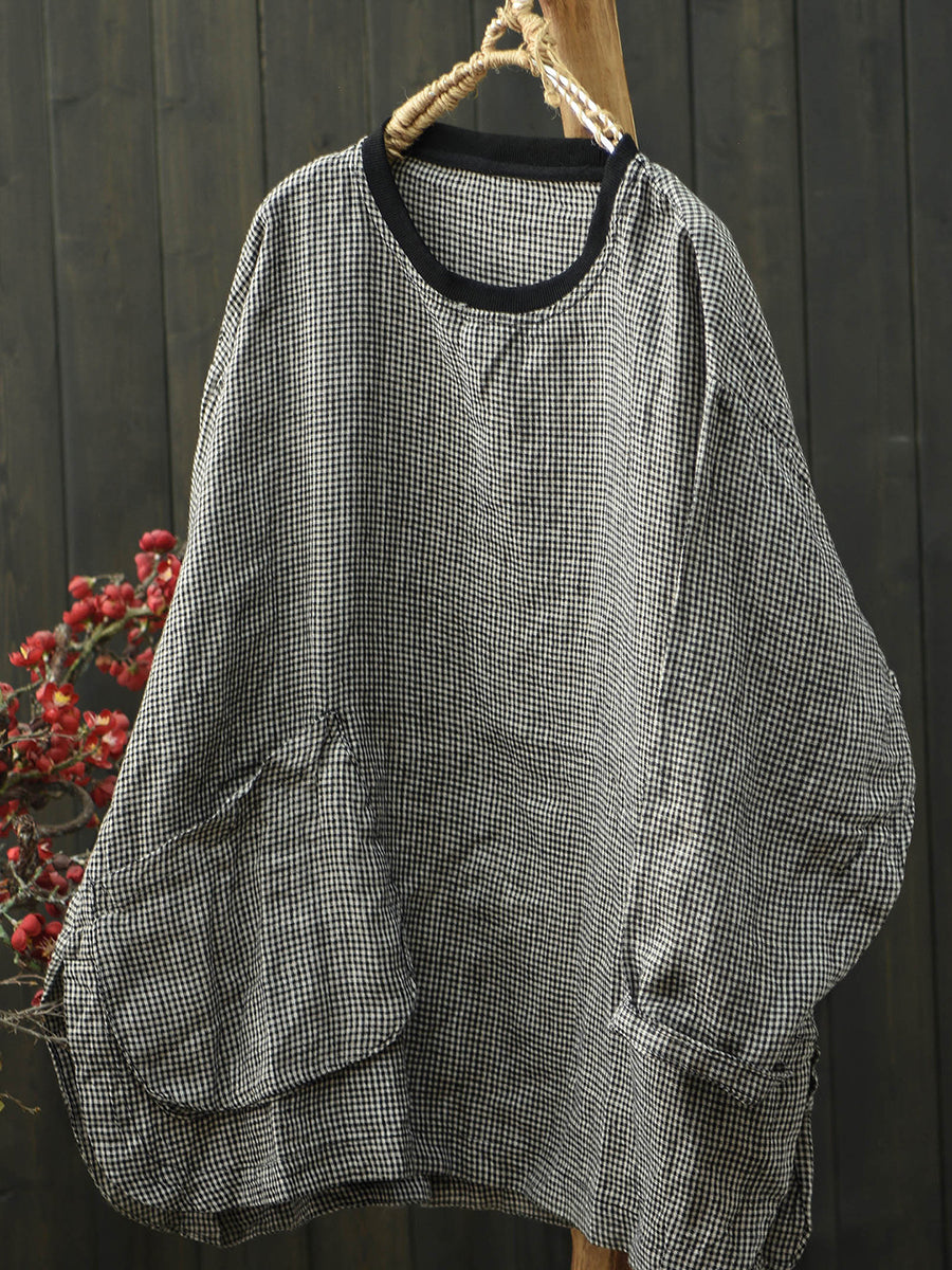 قميص كتان نسائي ربيعي بتصميم شبكي كلاسيكي بياقة دائرية