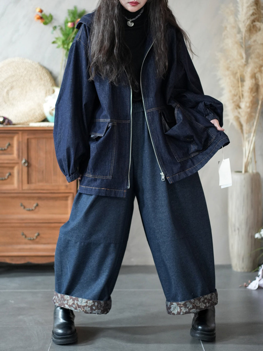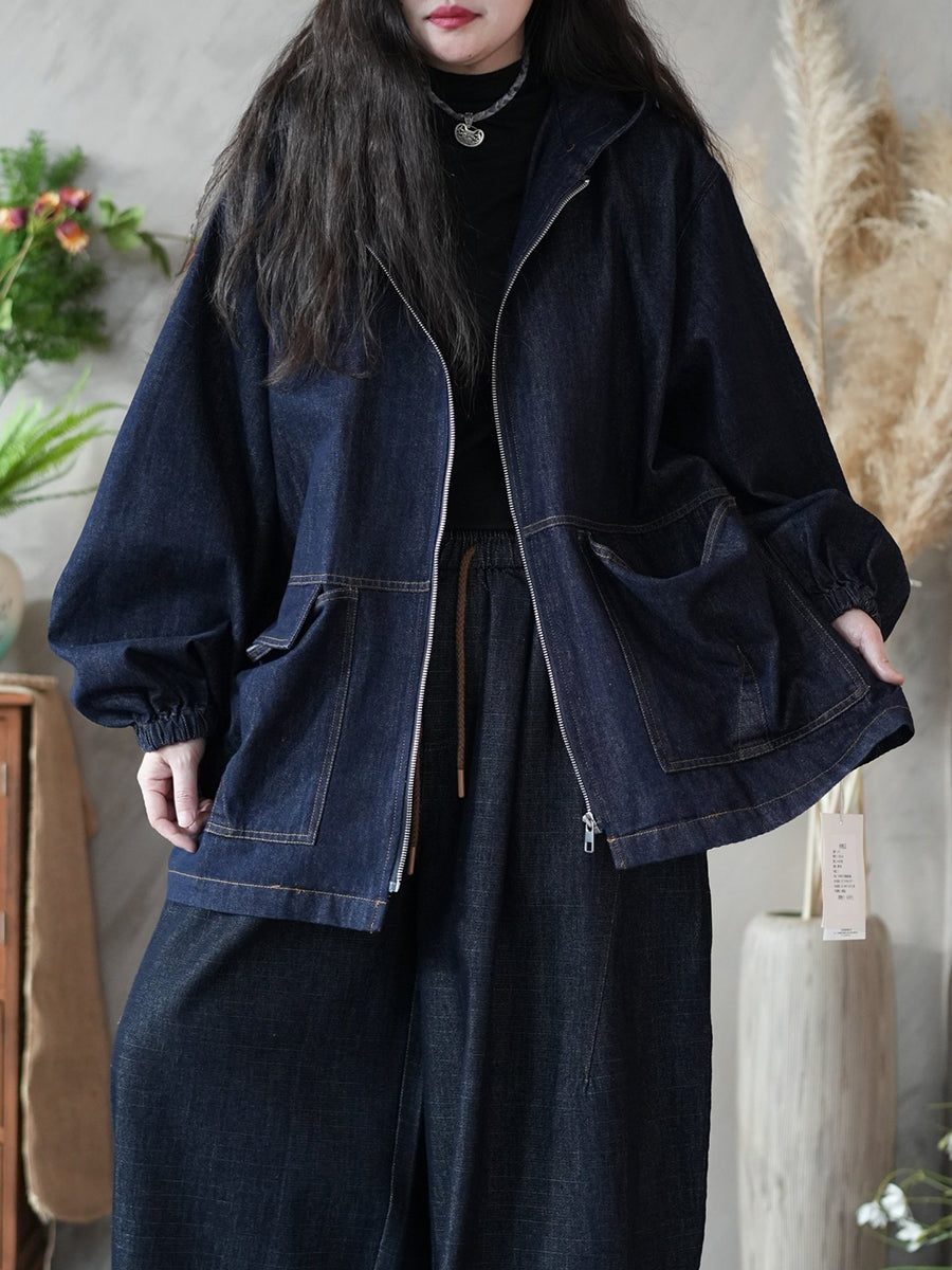 معطف نسائي ربيعي ريترو من الدنيم بلون موحد وغطاء رأس