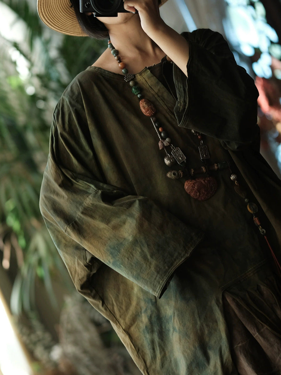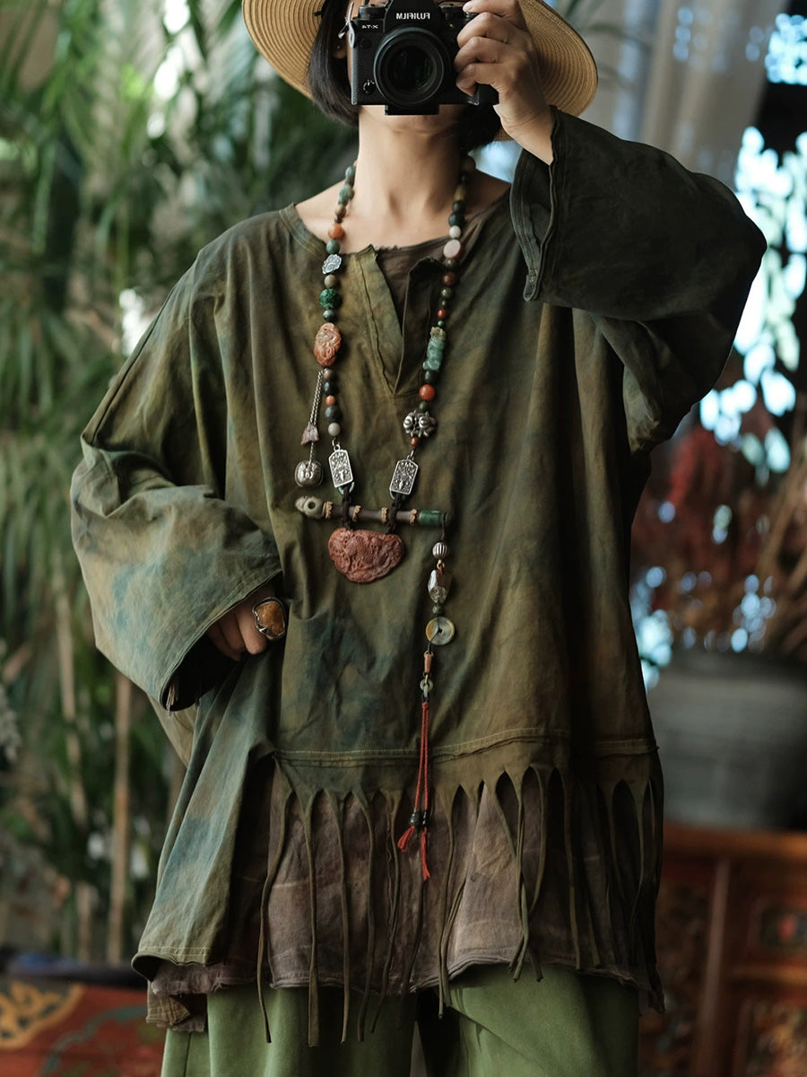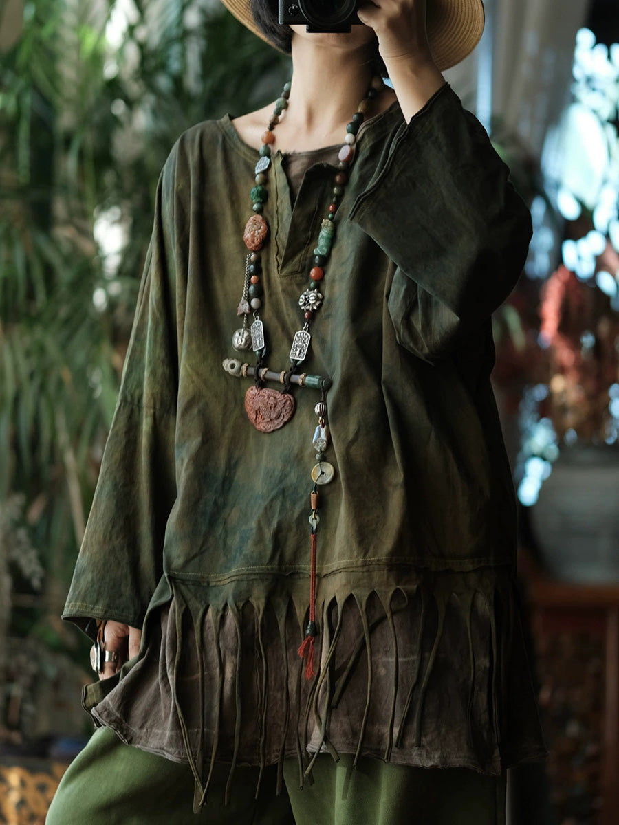 بلوزة نسائية ربيعية بتصميم ريترو بنمط ربطة العنق المصبوغة بشرابات متداخلة وياقة دائرية