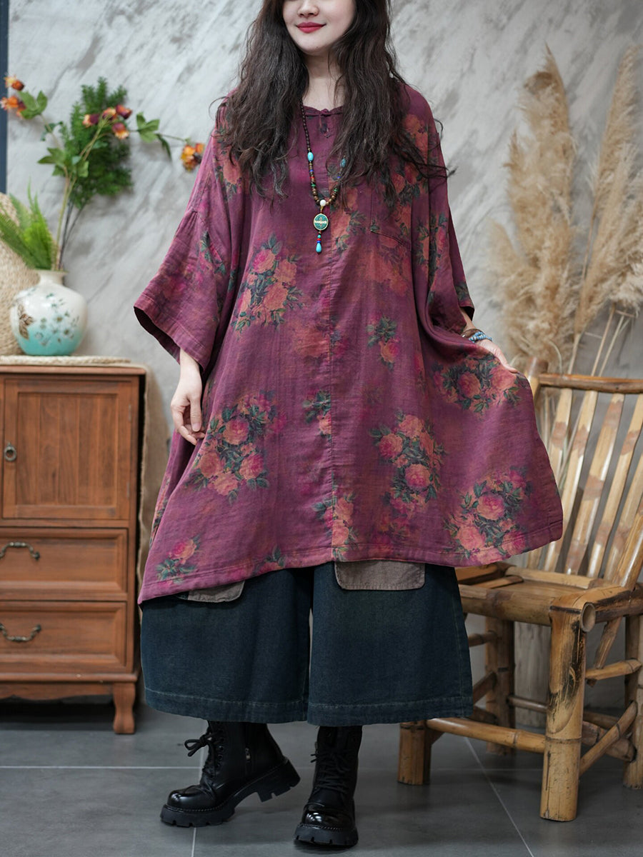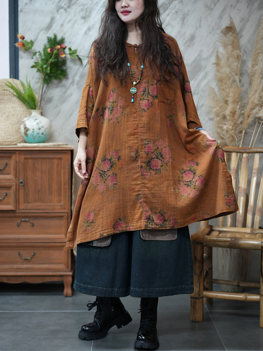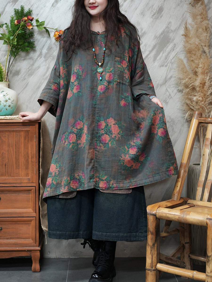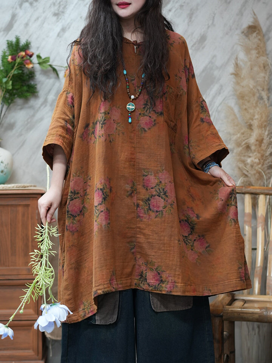 قميص نسائي صيفي طويل بياقة دائرية مزين بالزهور بتصميم كلاسيكي