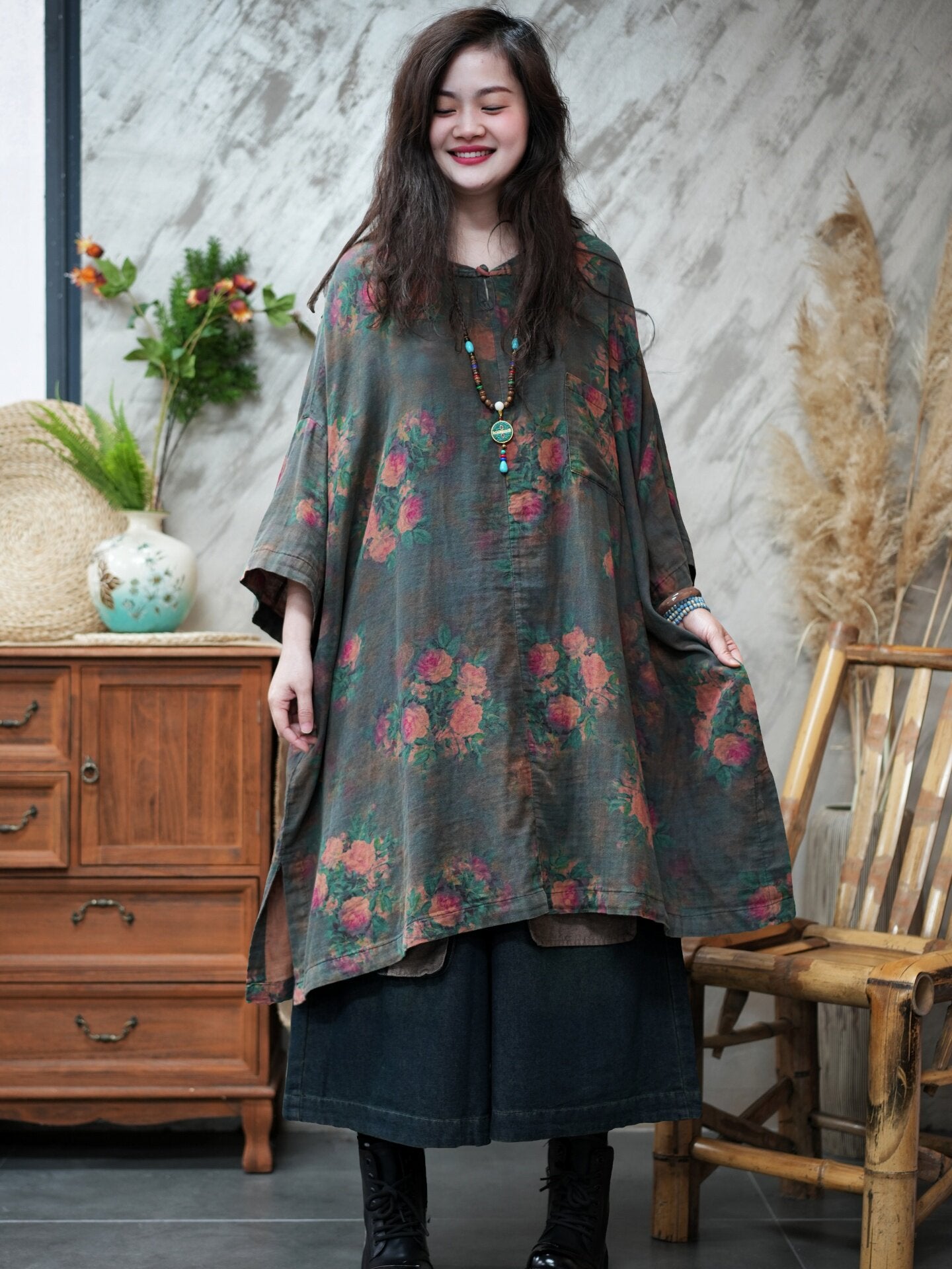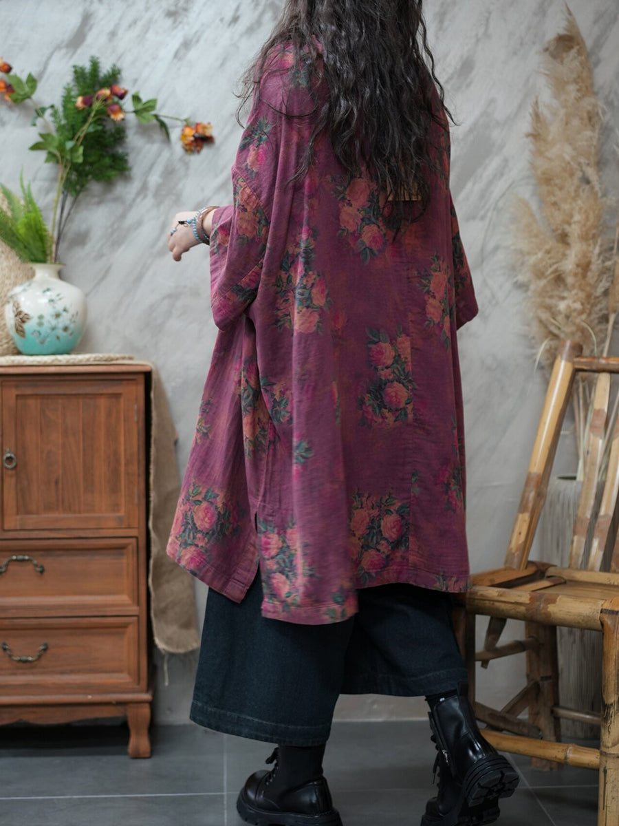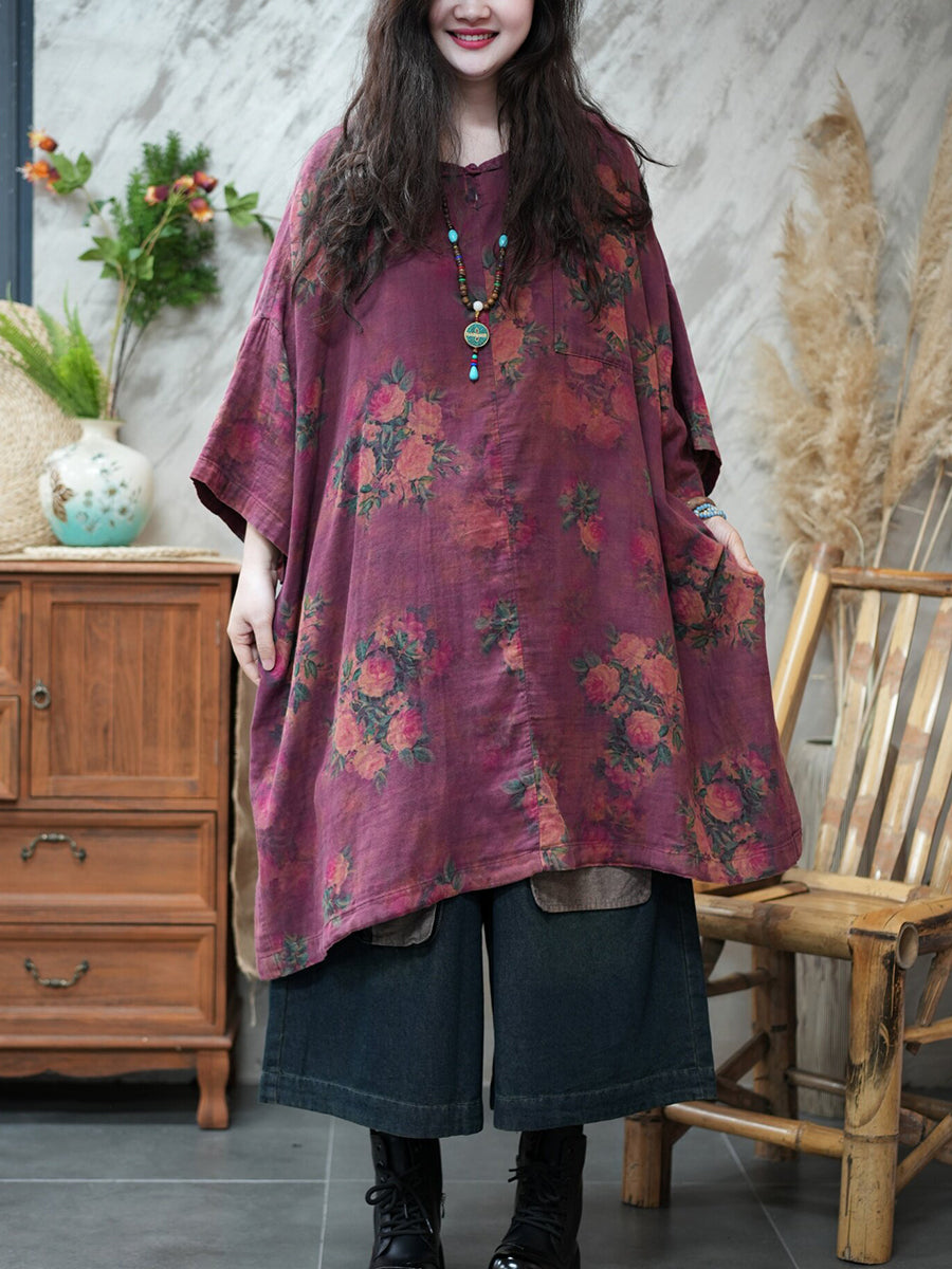 قميص نسائي صيفي طويل بياقة دائرية مزين بالزهور بتصميم كلاسيكي