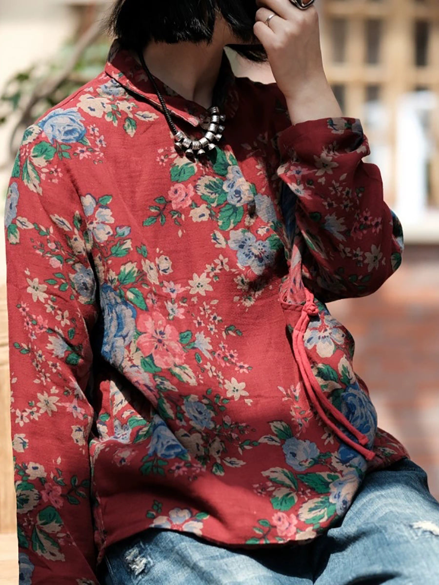 قميص نسائي ربيعي عتيق مزين بالزهور، بياقة مطوية، مصنوع من القطن الخالص 100%