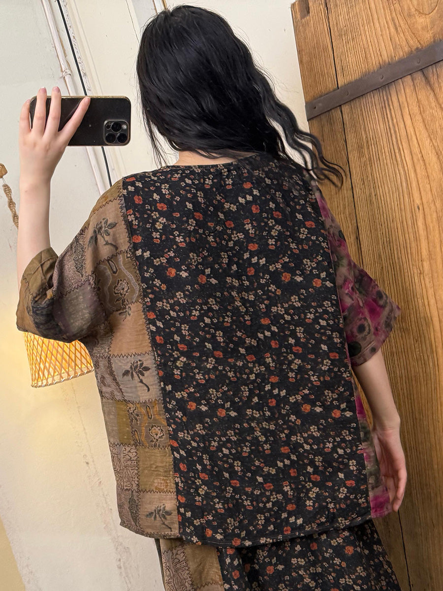 قميص نسائي صيفي من القطن برقبة دائرية مزخرف بنقشة زهور فنية