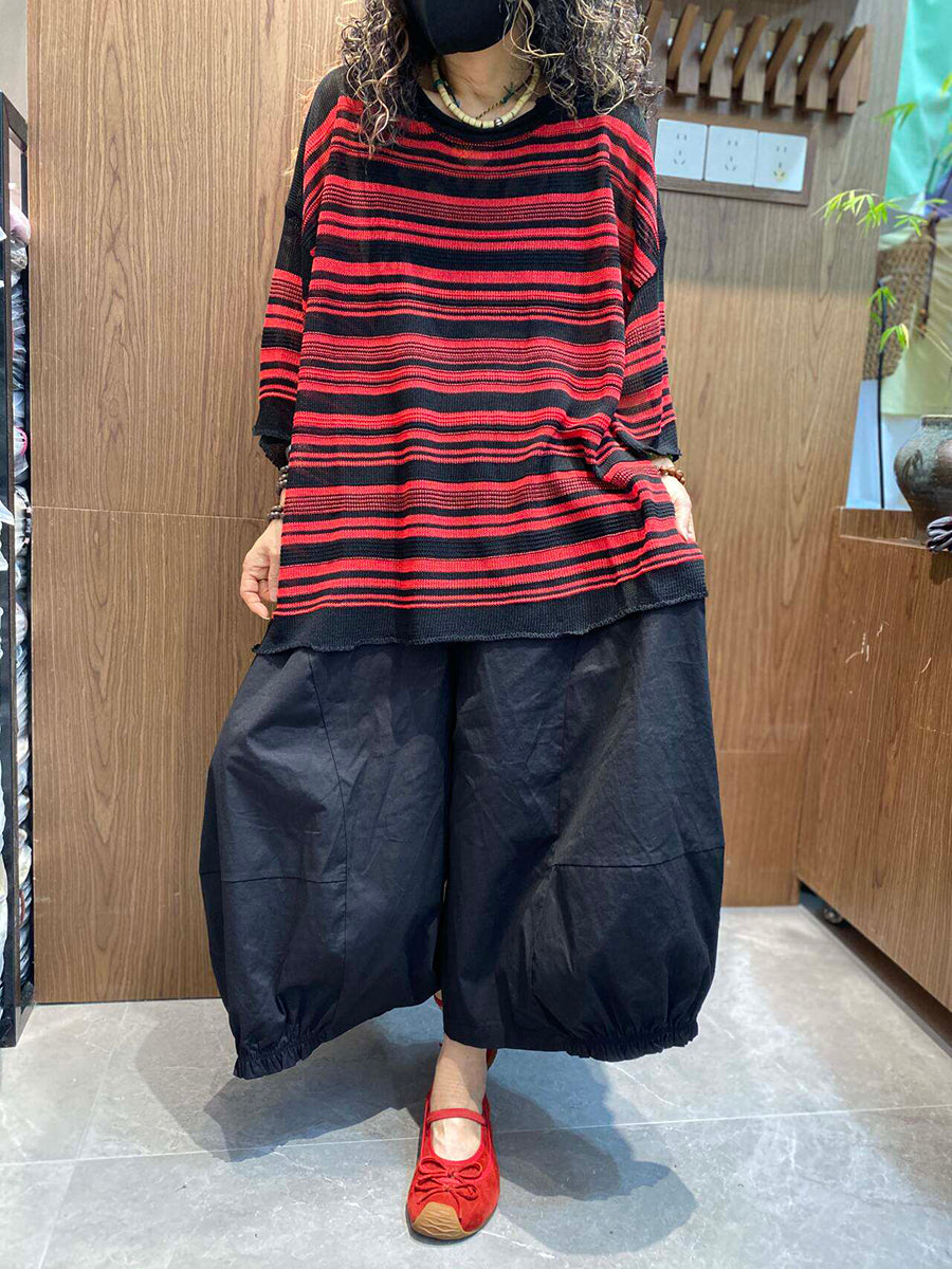 بلوزة نسائية صيفية مخططة بياقة دائرية