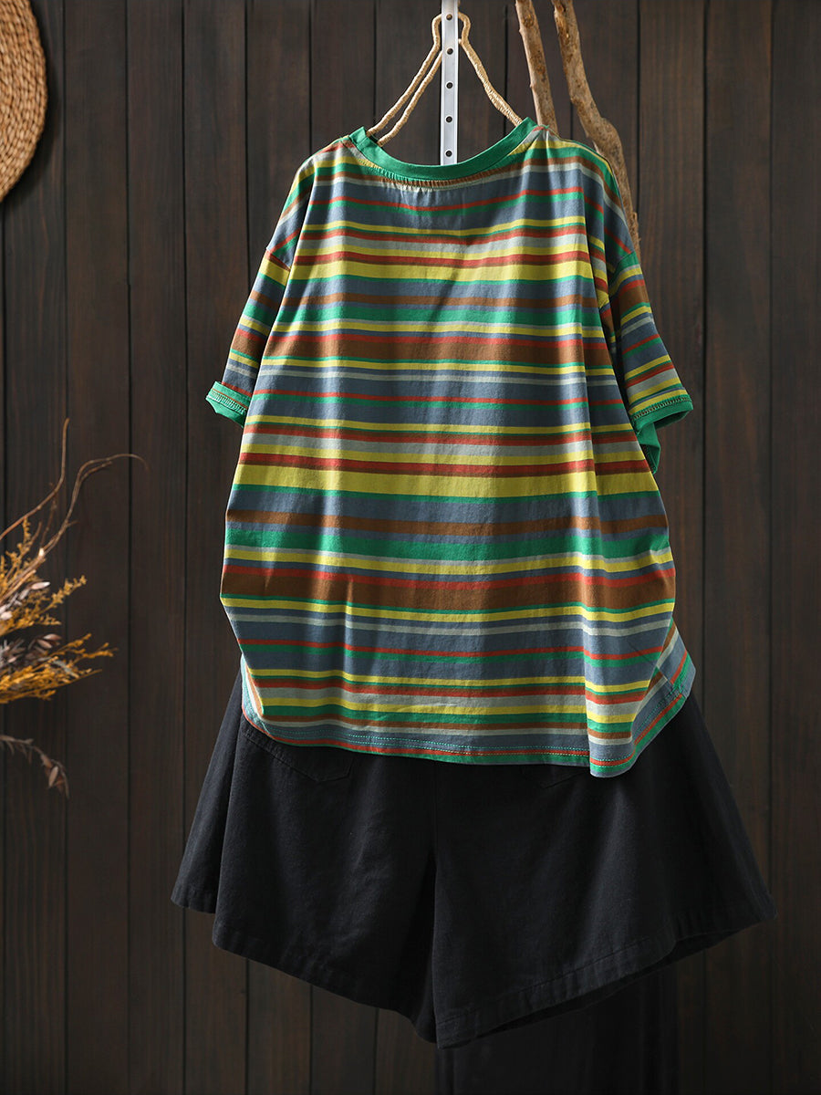 بلوزة نسائية صيفية كاجوال مخططة من القطن بياقة دائرية