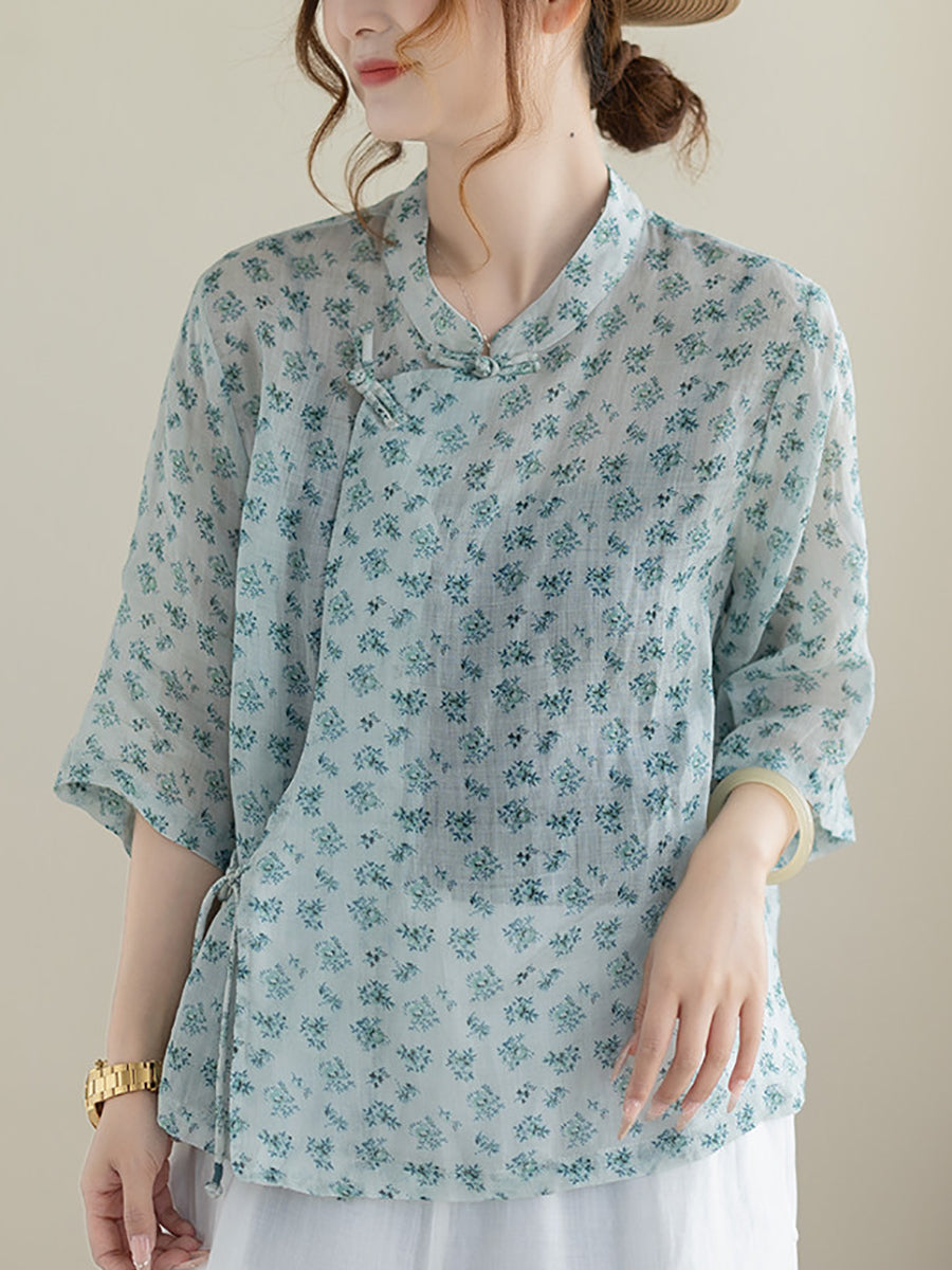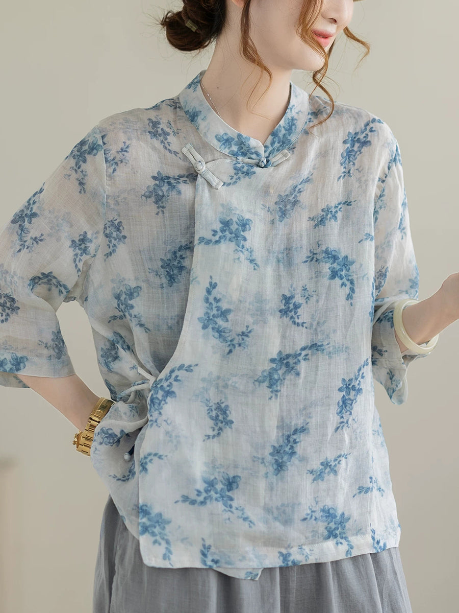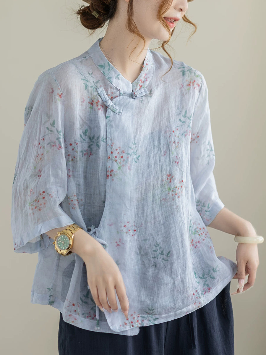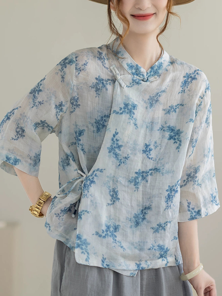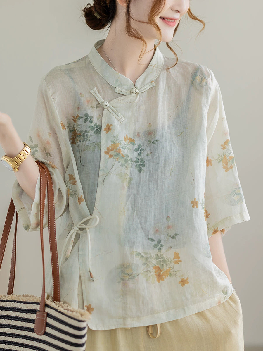 بلوزة نسائية صيفية مزينة بنقوش زهور عرقية وياقة عالية من قماش الرامي 100%