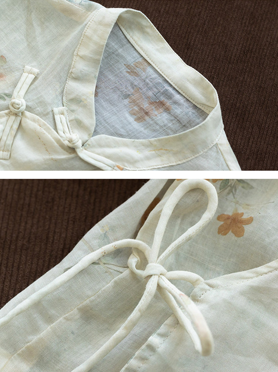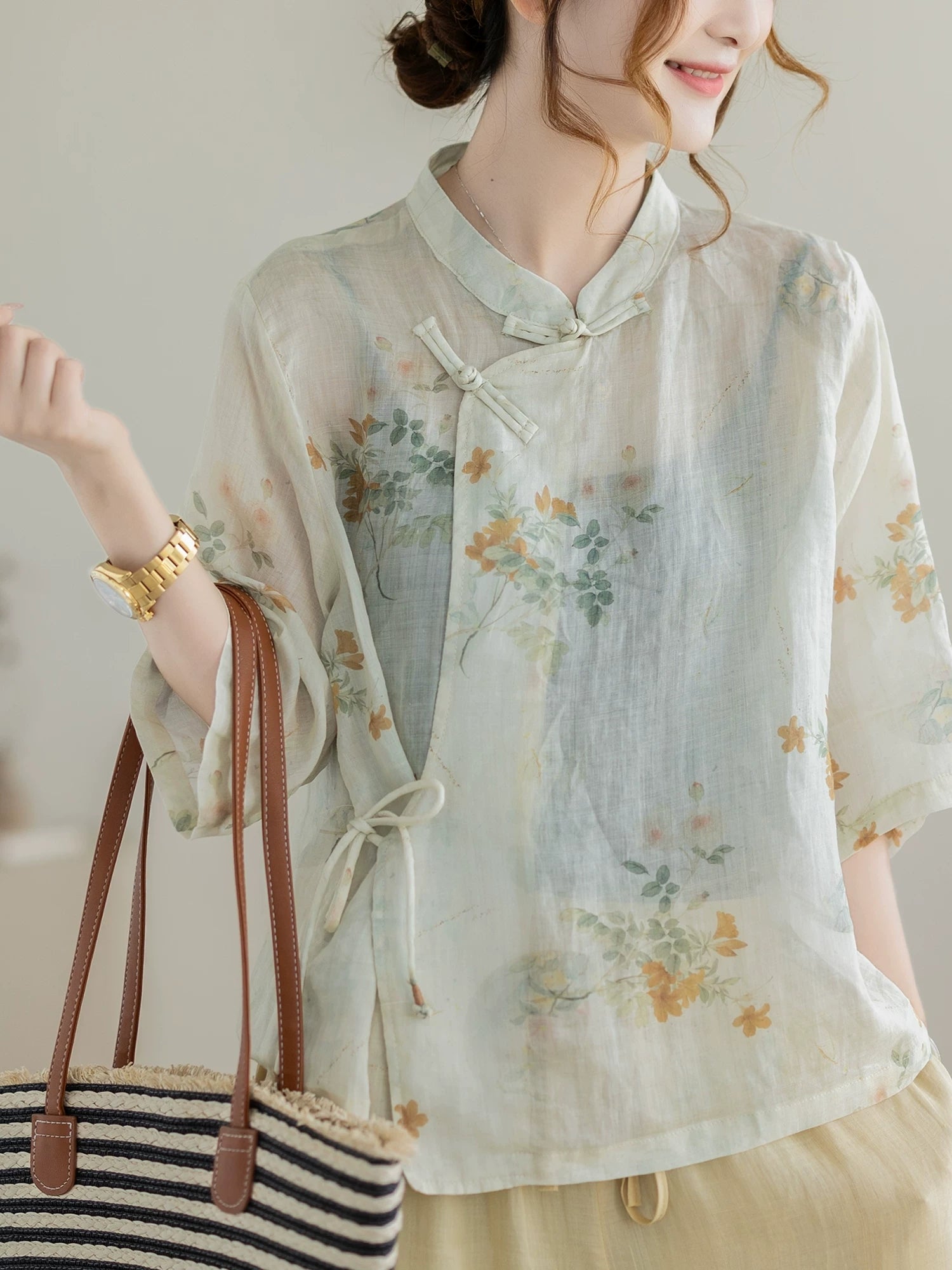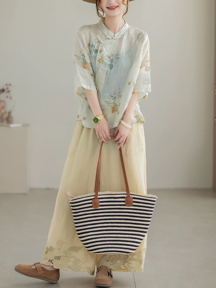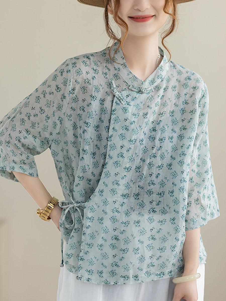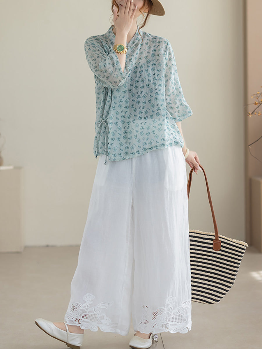 بلوزة نسائية صيفية مزينة بنقوش زهور عرقية وياقة عالية من قماش الرامي 100%