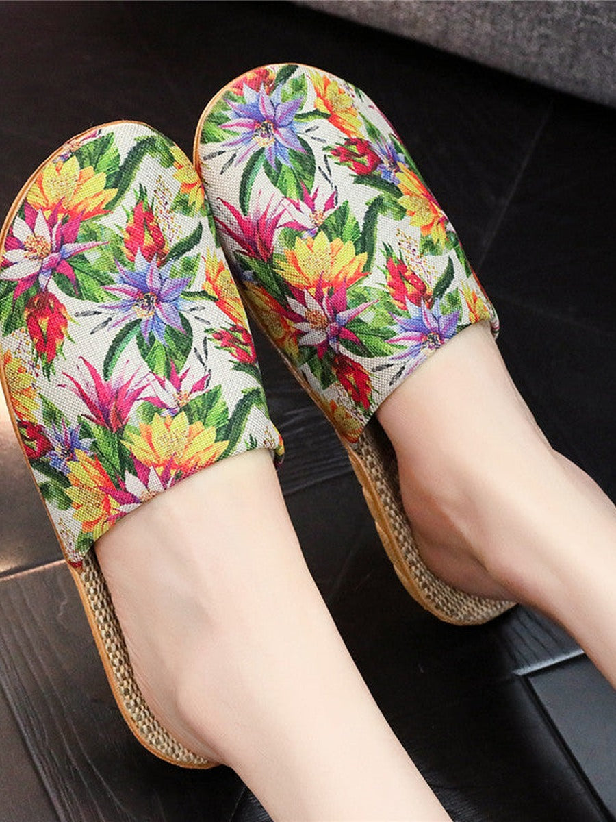 شباشب نسائية صيفية من الكتان بنعل سميك مزينة بنقوش زهور