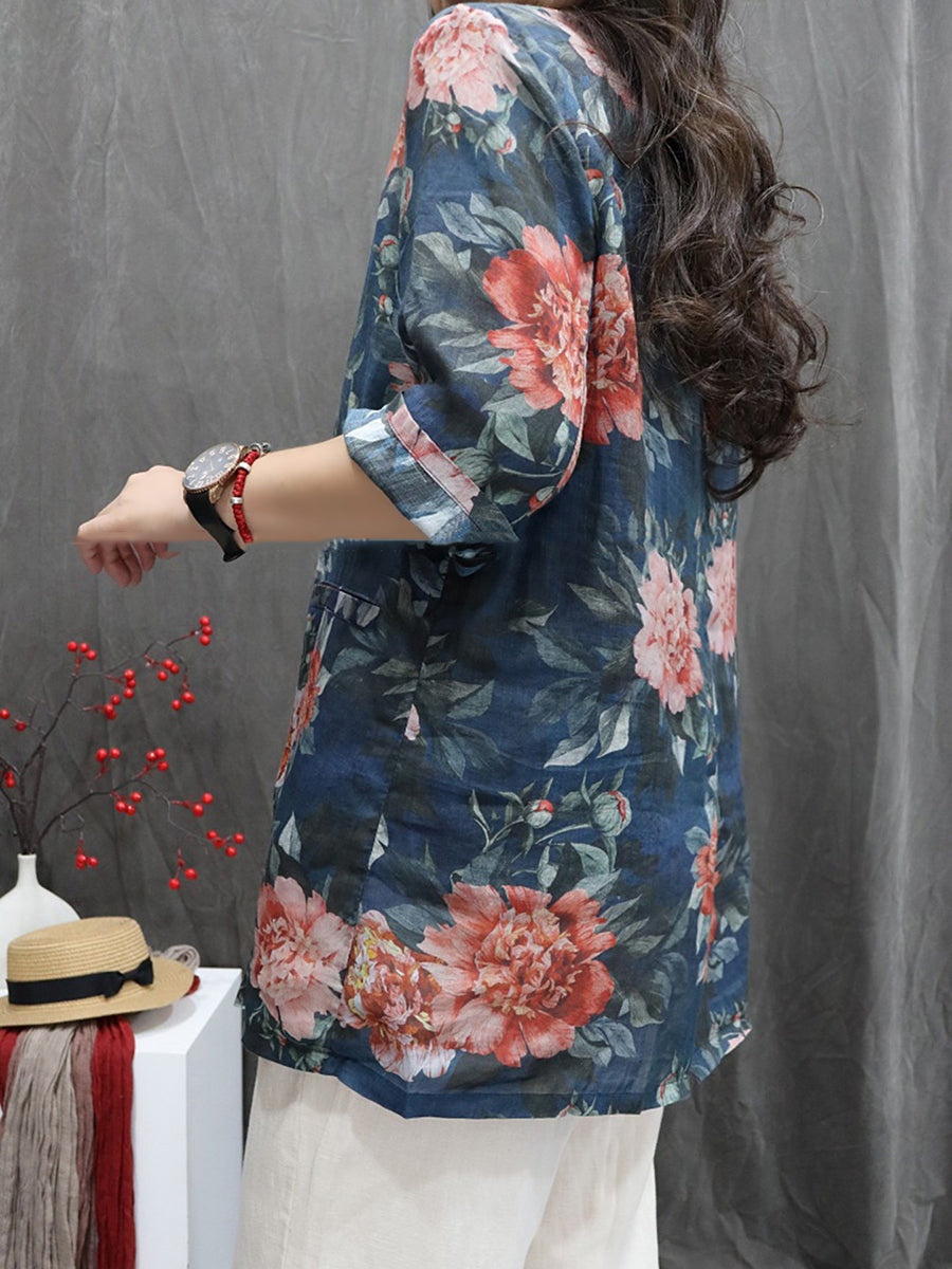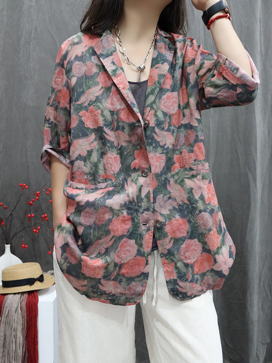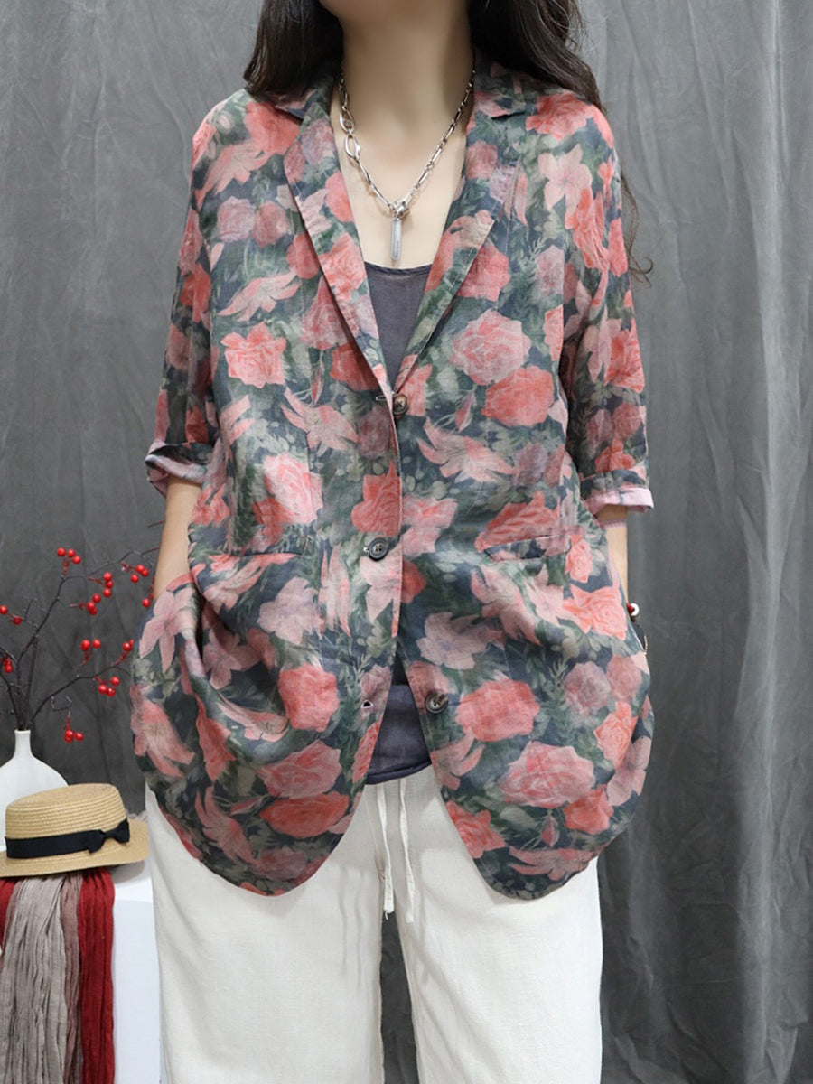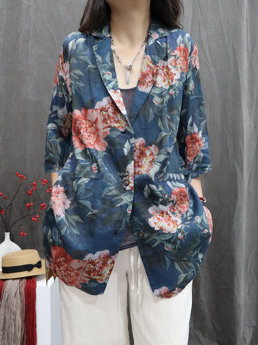معطف نسائي صيفي مزين بالزهور، مصنوع من قماش الرامي بنسبة 100%، بياقة مطوية.