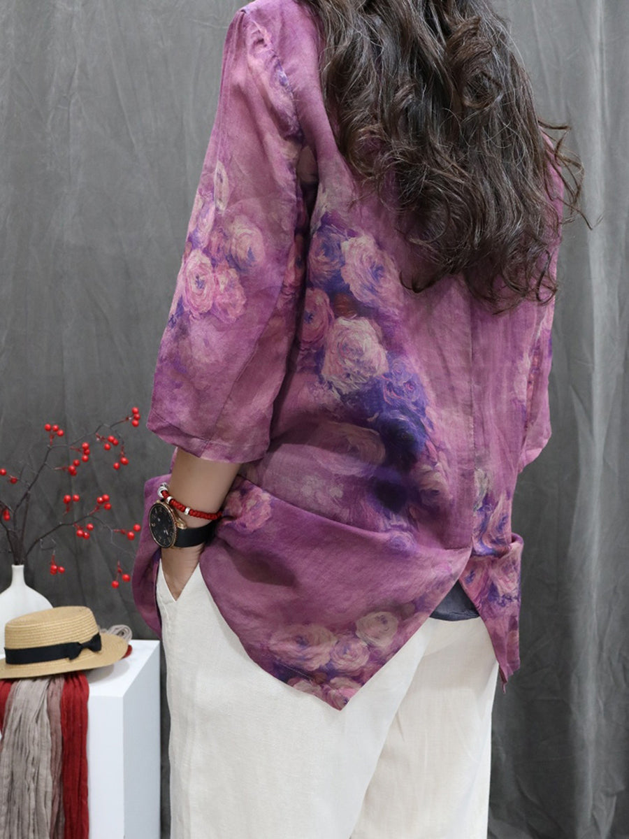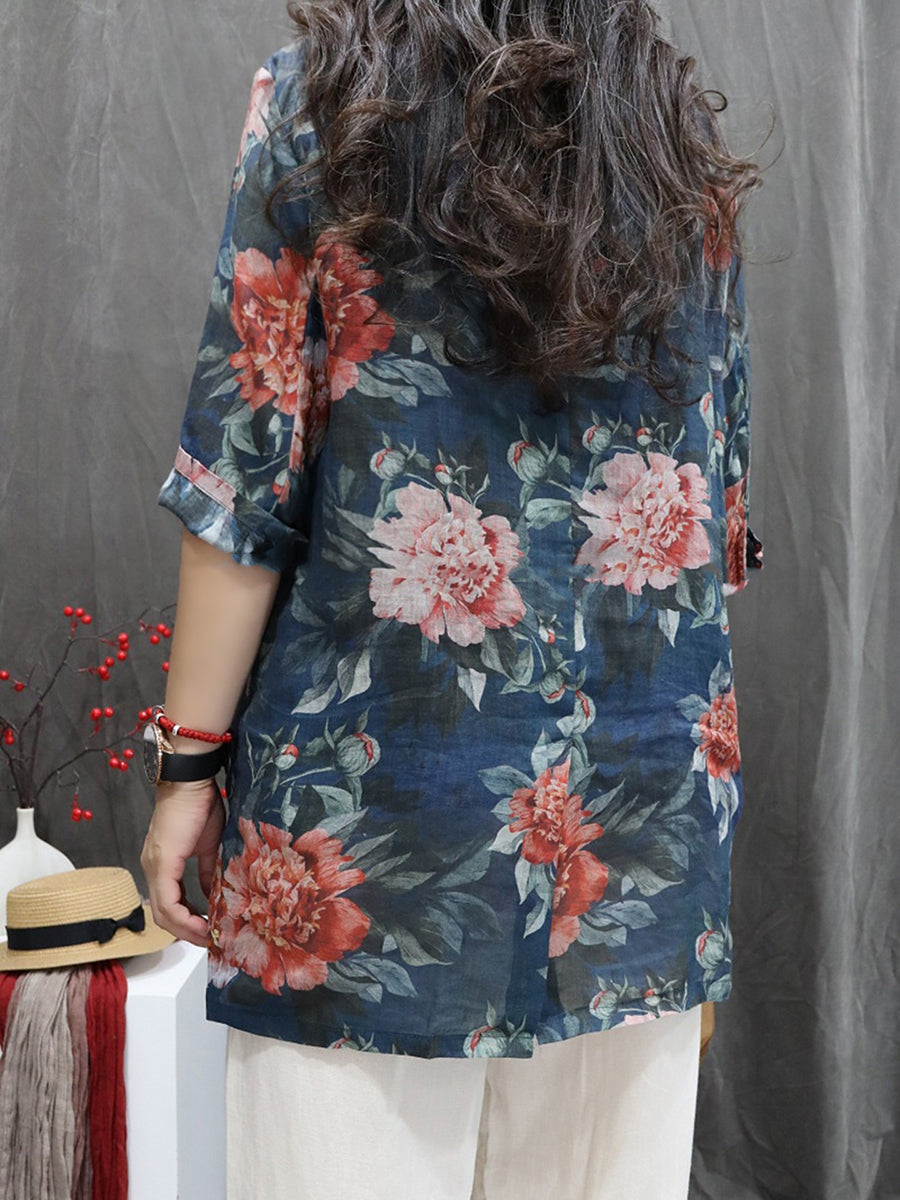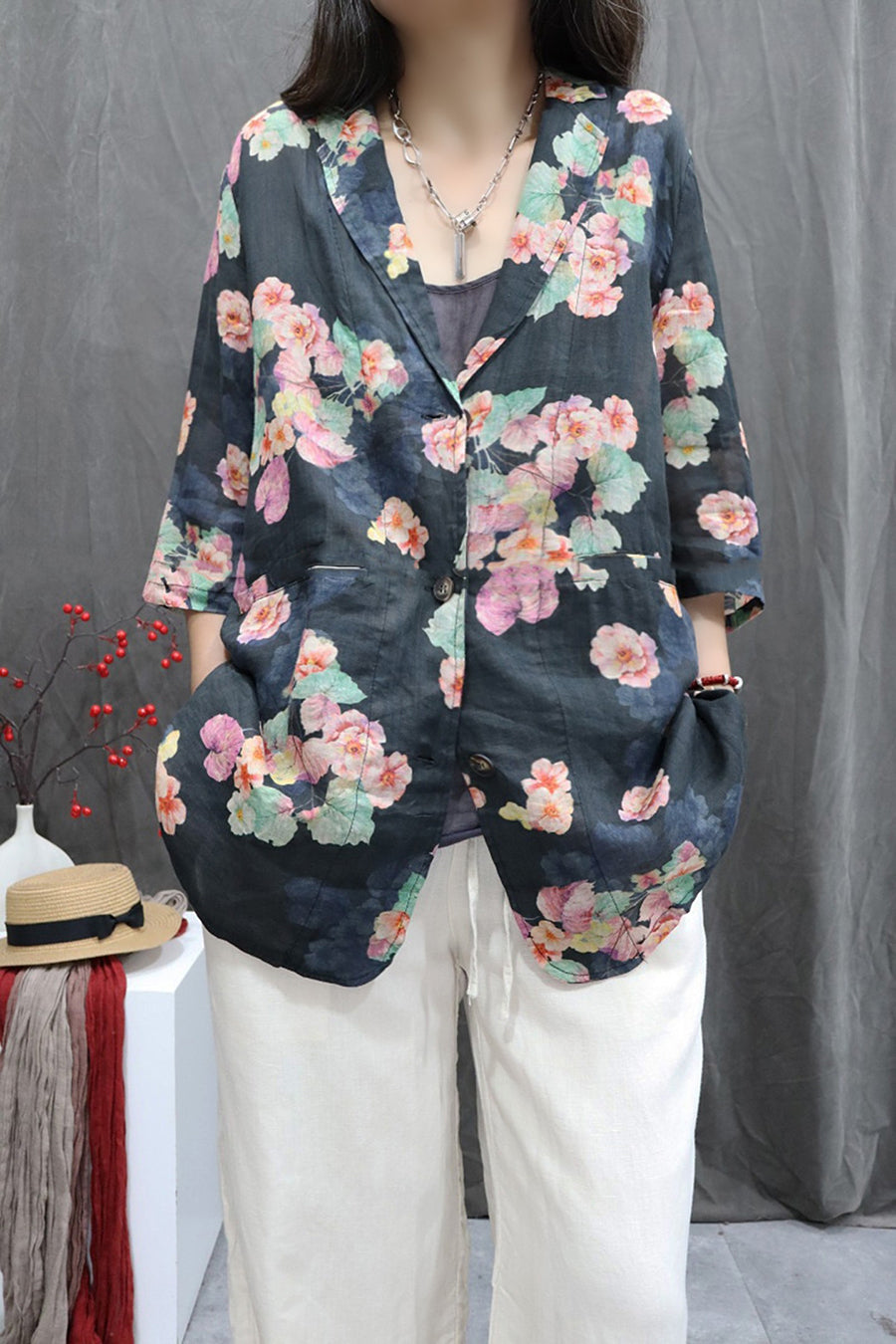 معطف نسائي صيفي مزين بالزهور، مصنوع من قماش الرامي بنسبة 100%، بياقة مطوية.