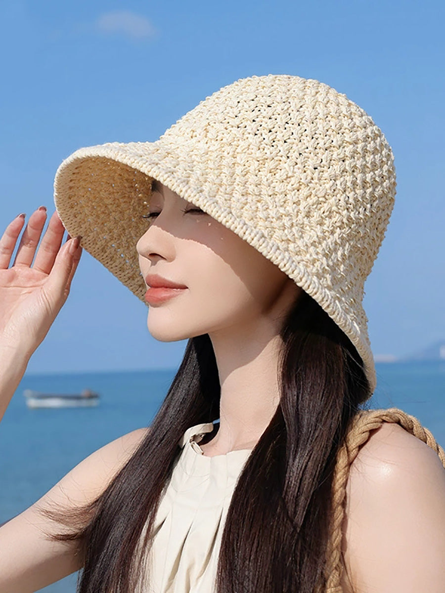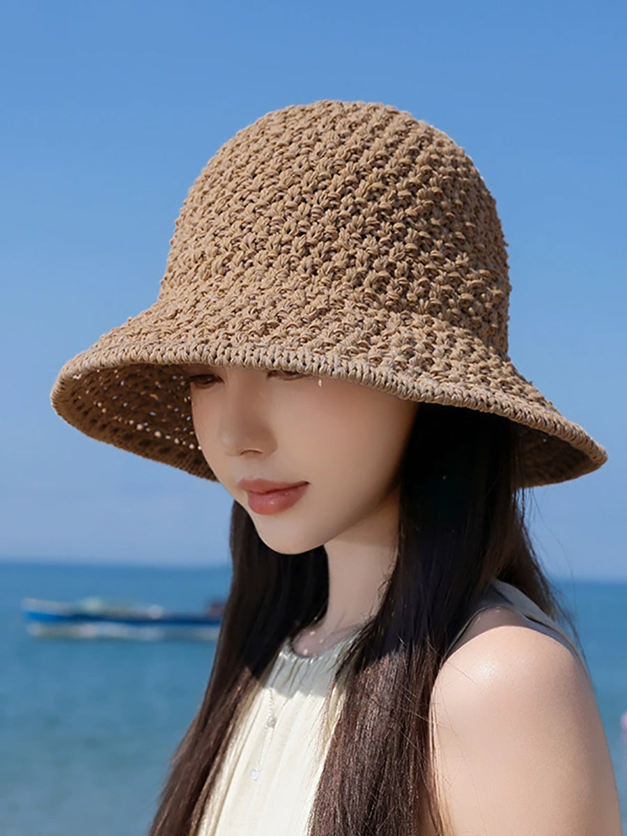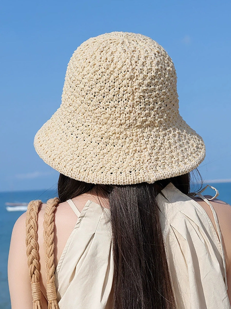 قبعة دلو صيفية نسائية بلون موحد منسوجة