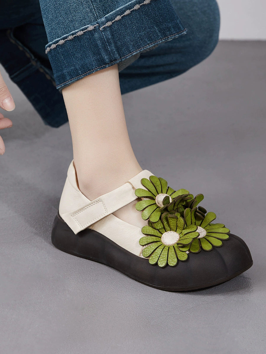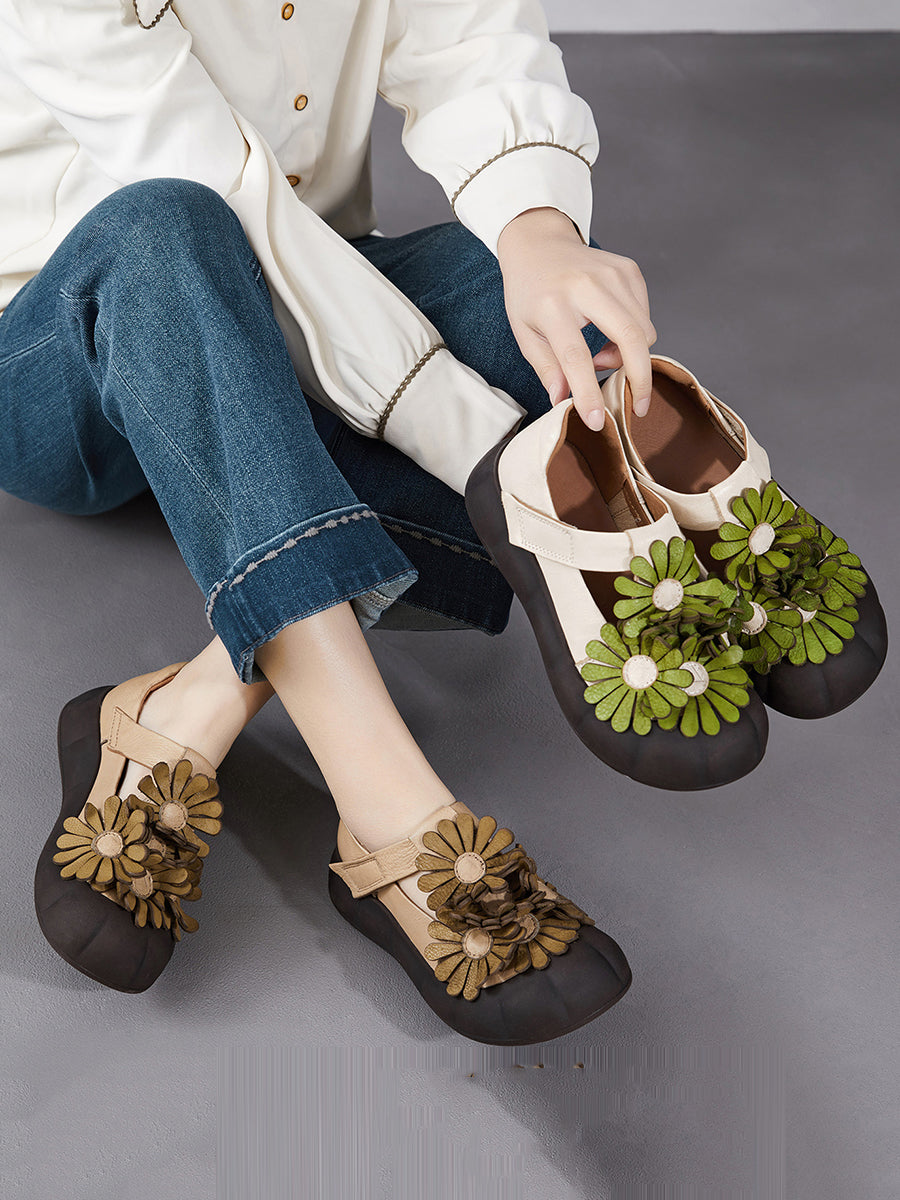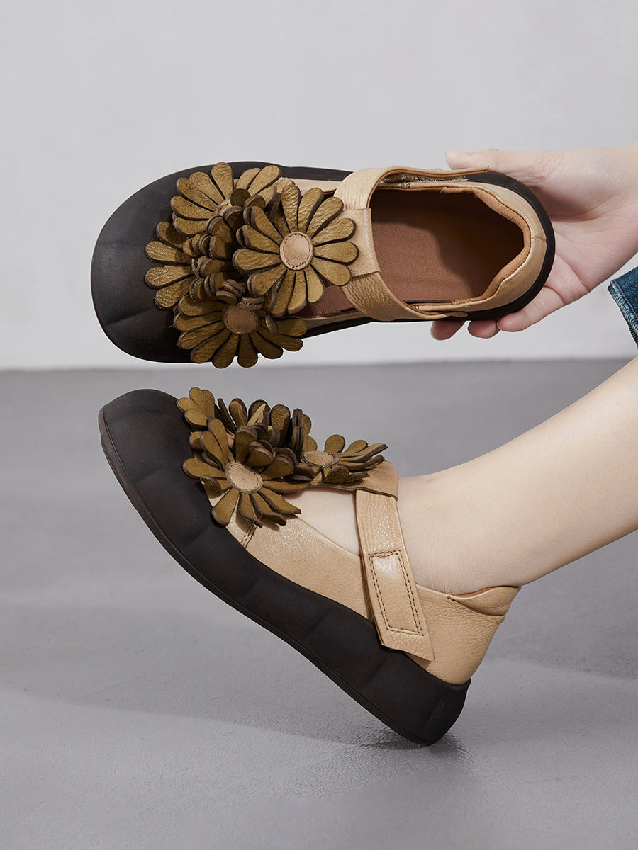 أحذية نسائية صيفية كلاسيكية من الجلد الطبيعي مزينة بالزهور