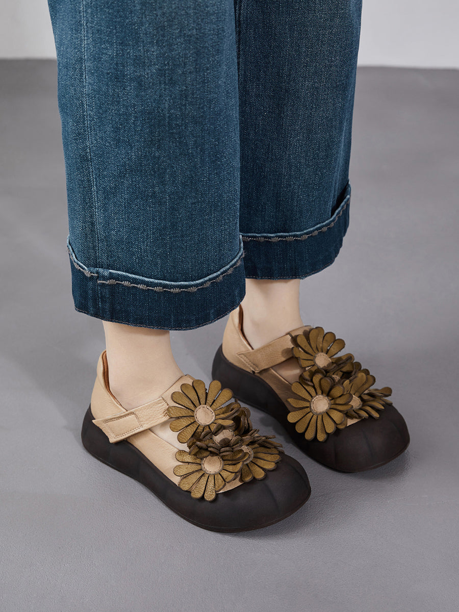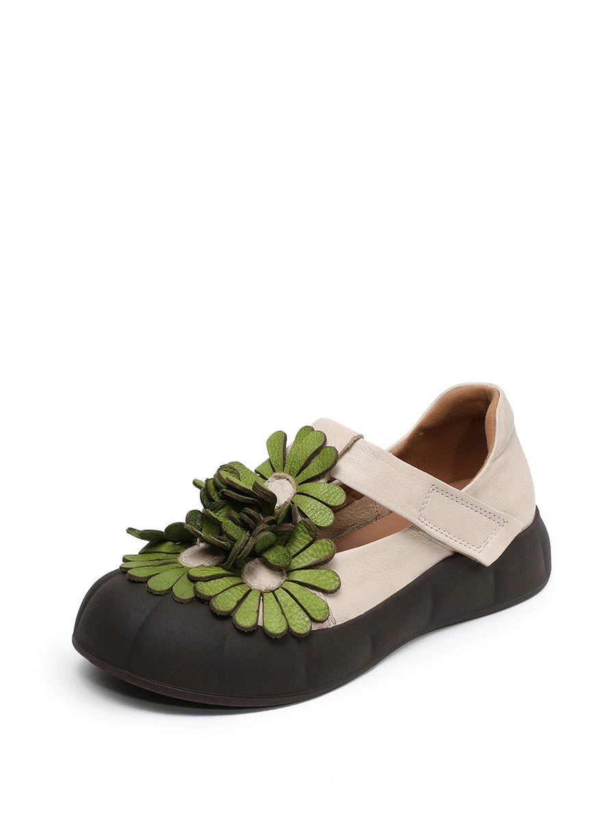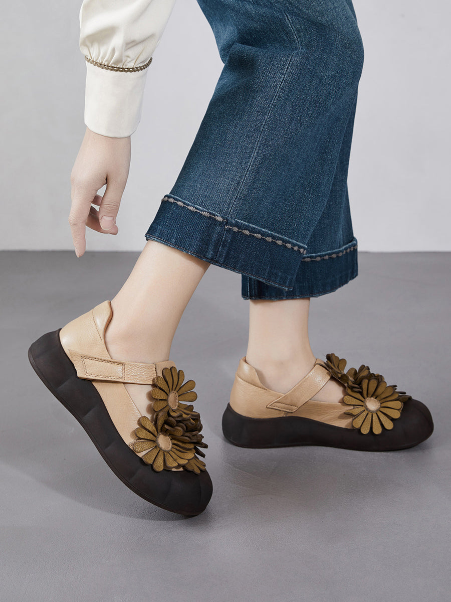أحذية نسائية صيفية كلاسيكية من الجلد الطبيعي مزينة بالزهور