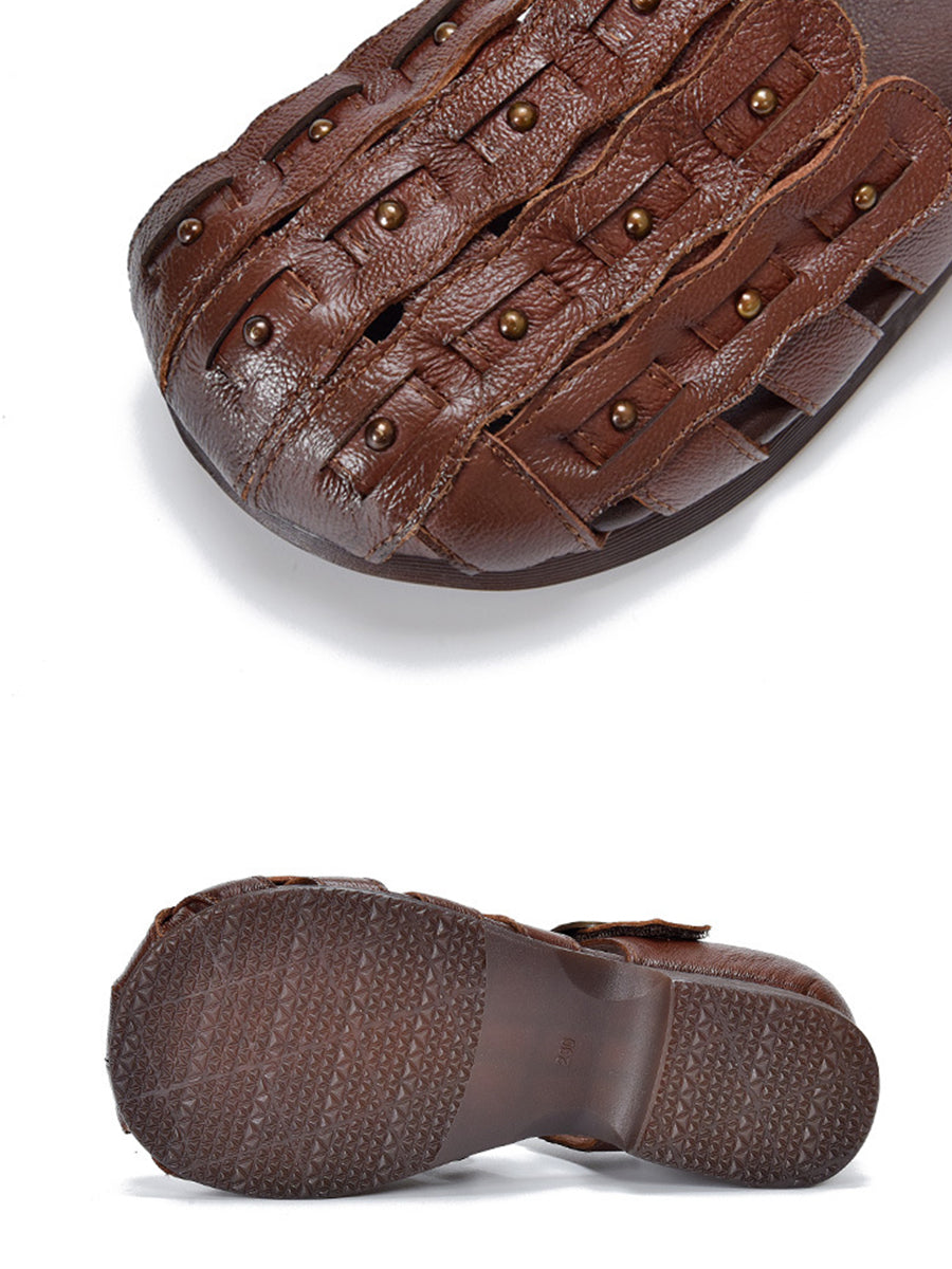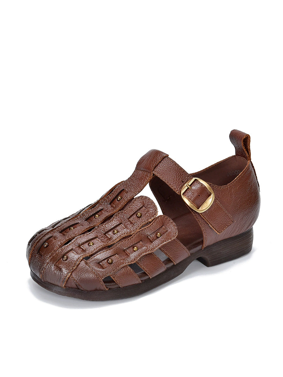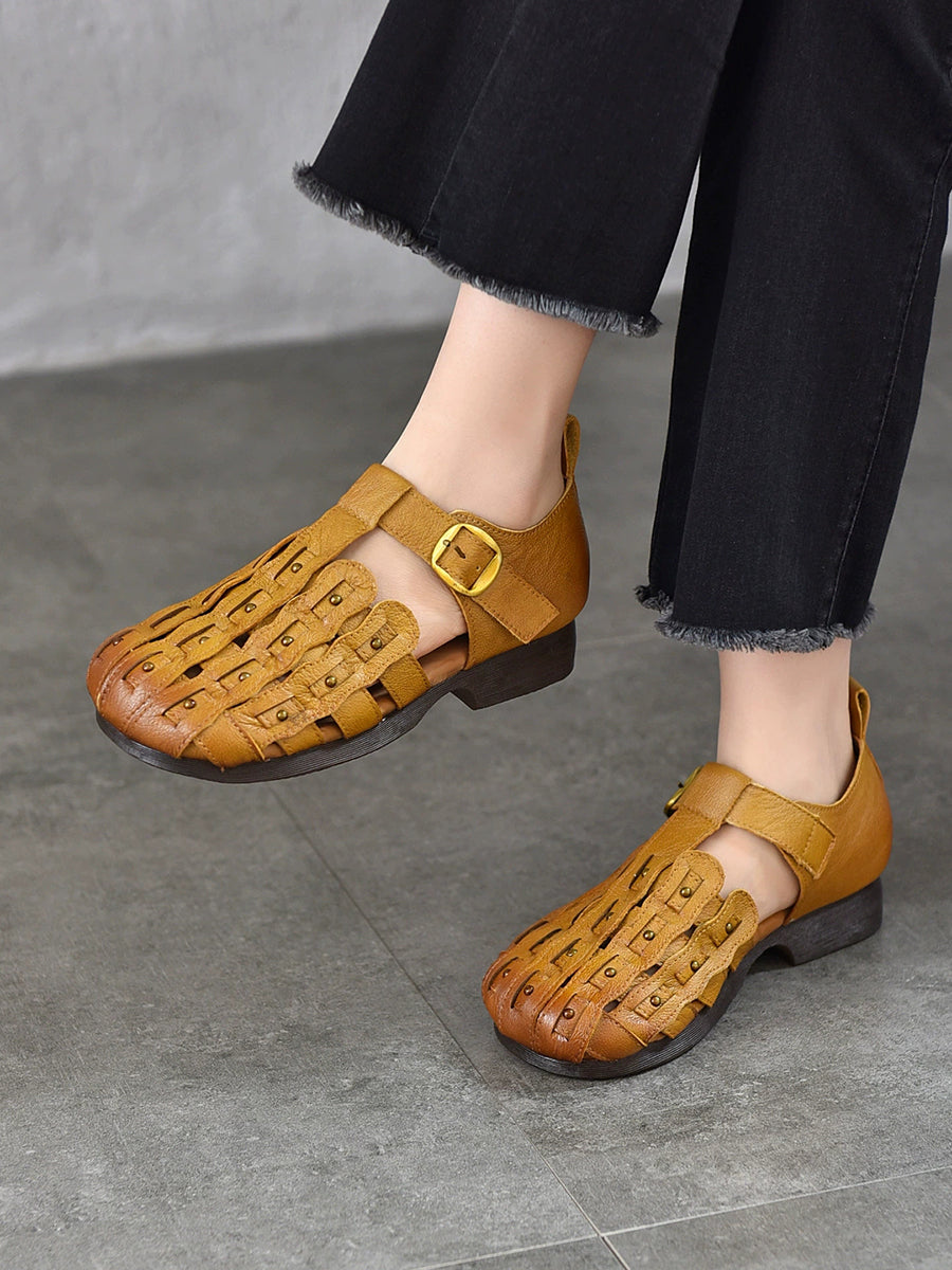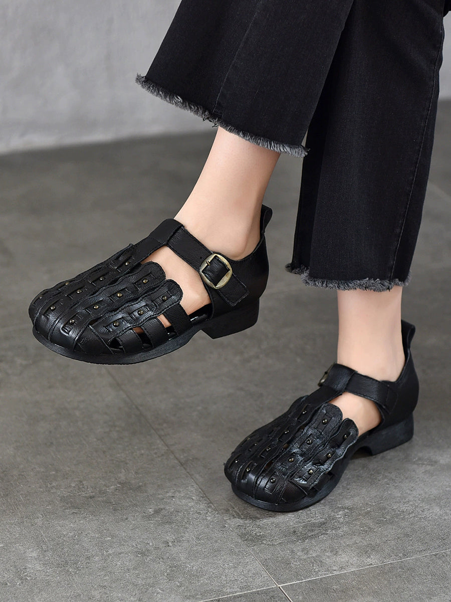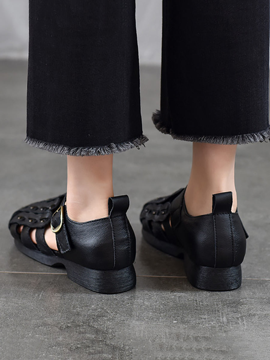 صنادل نسائية صيفية كلاسيكية من الجلد الطبيعي بكعب منخفض