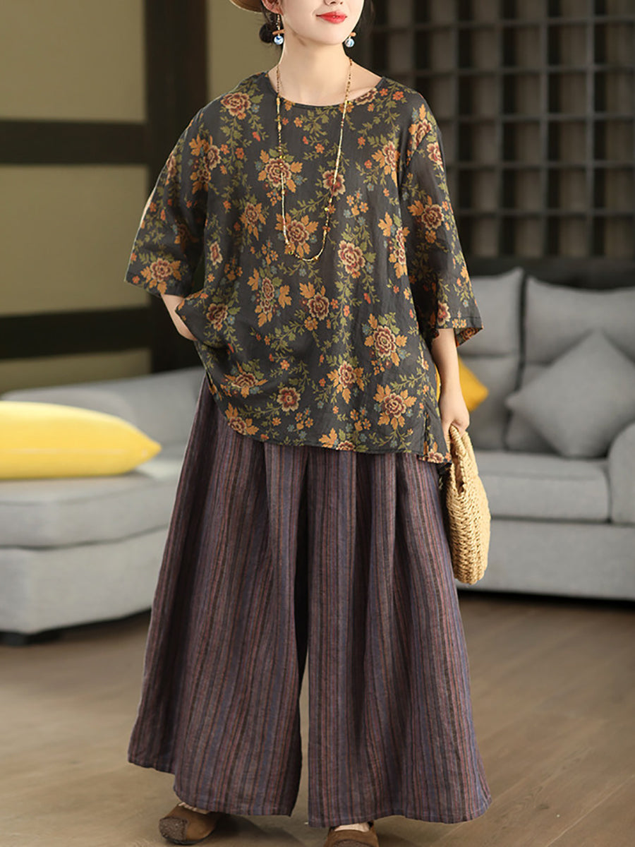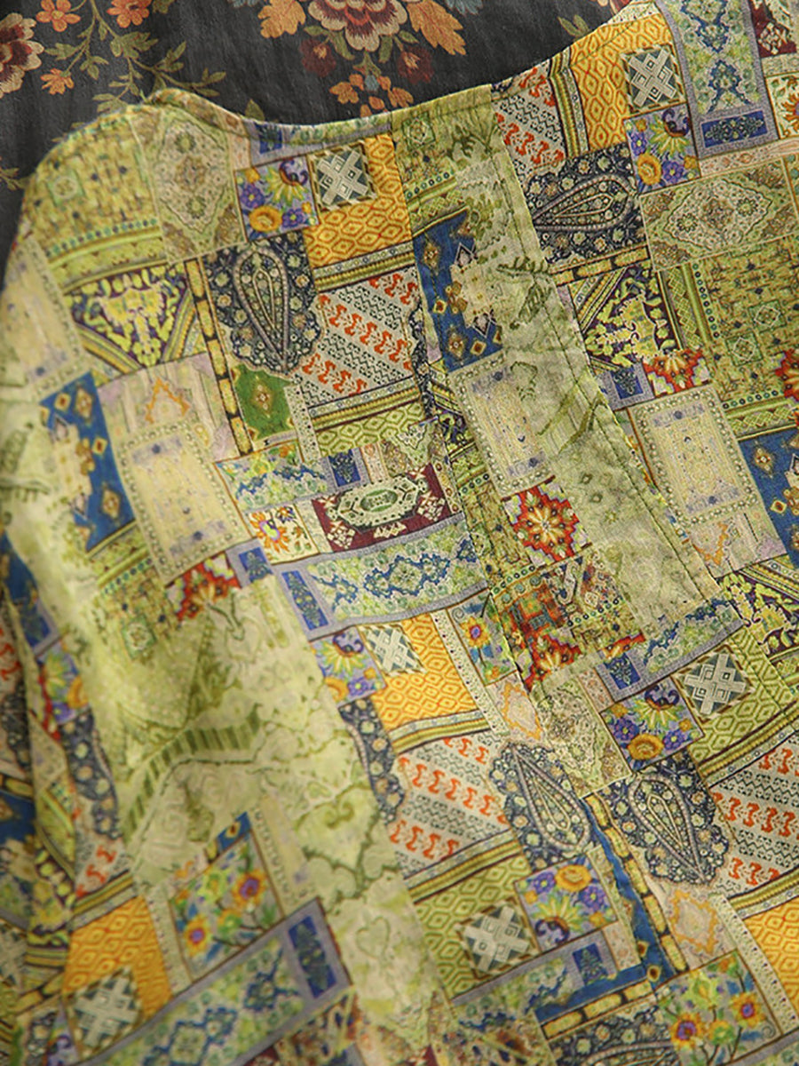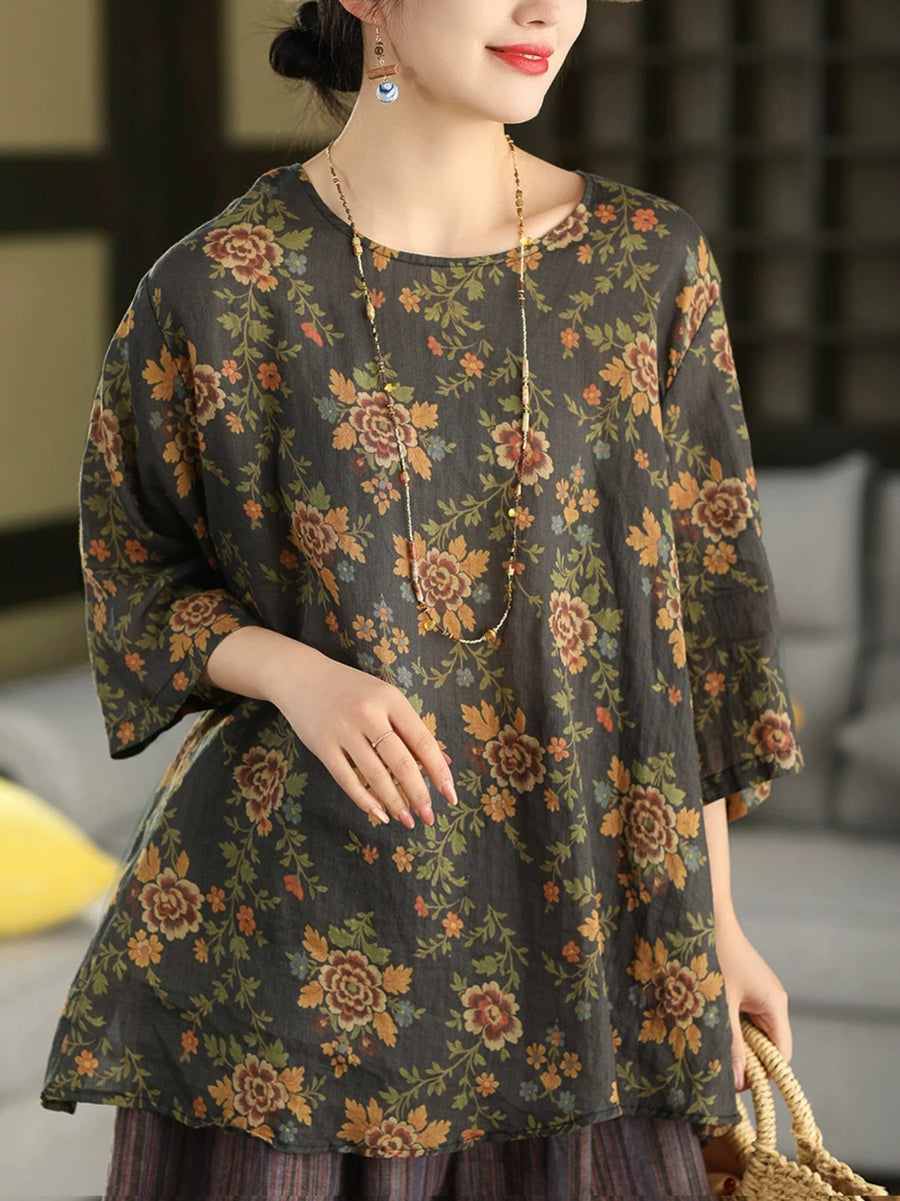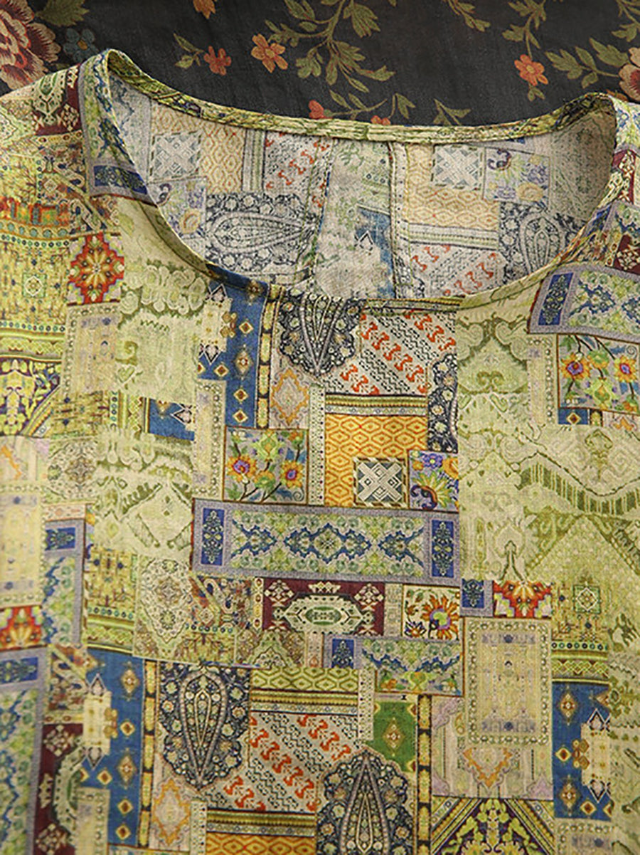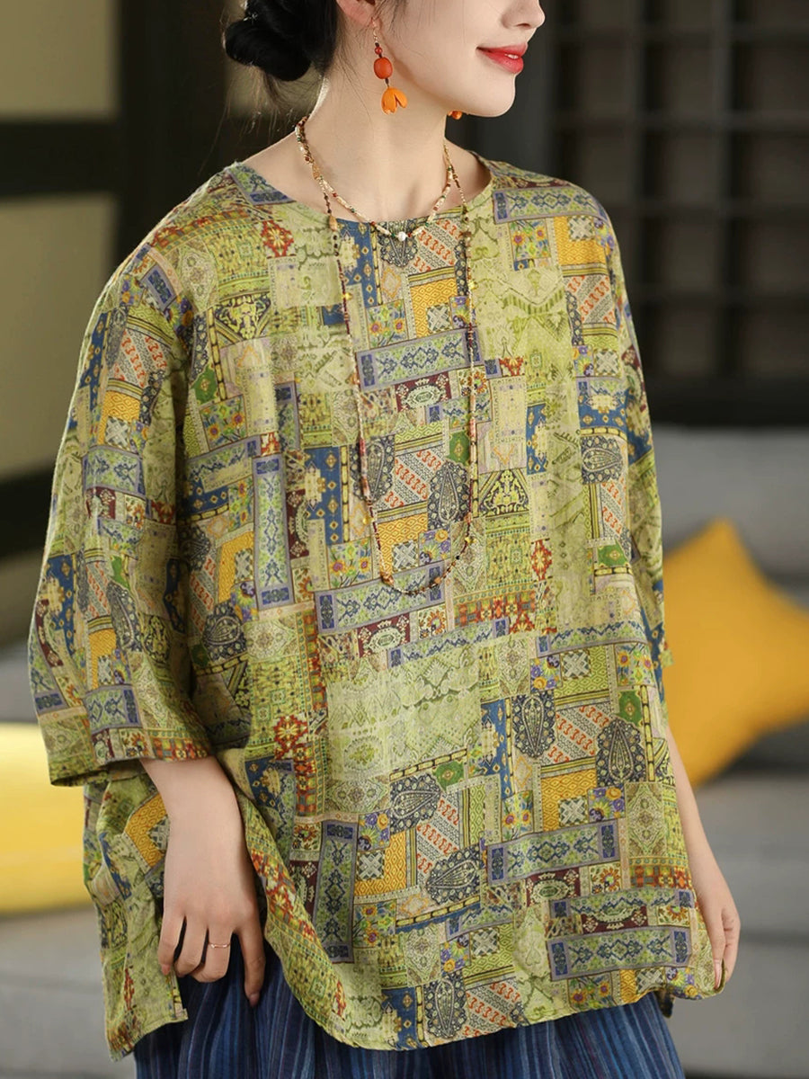 بلوزة نسائية صيفية بتصميم ريترو مرقع برقبة دائرية مصنوعة من قماش الرامي 100%