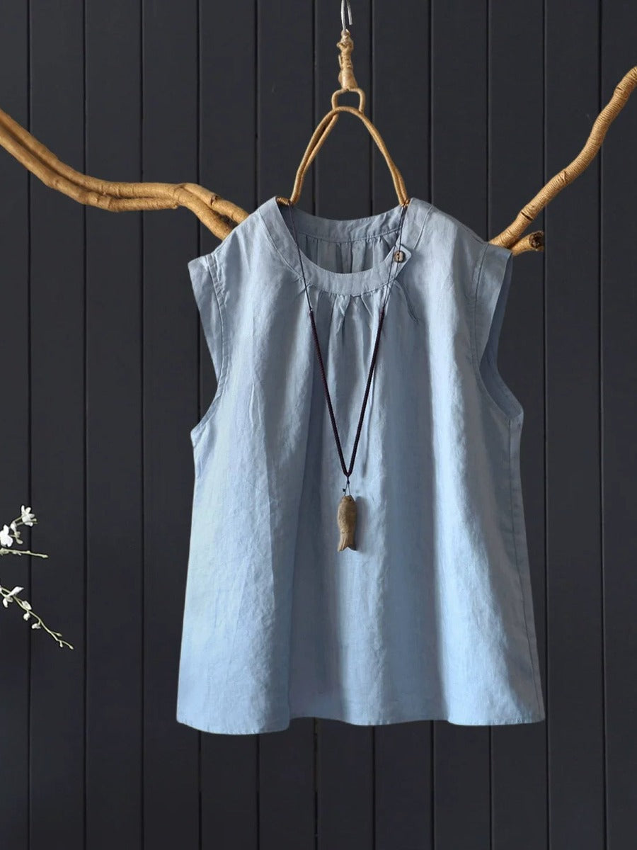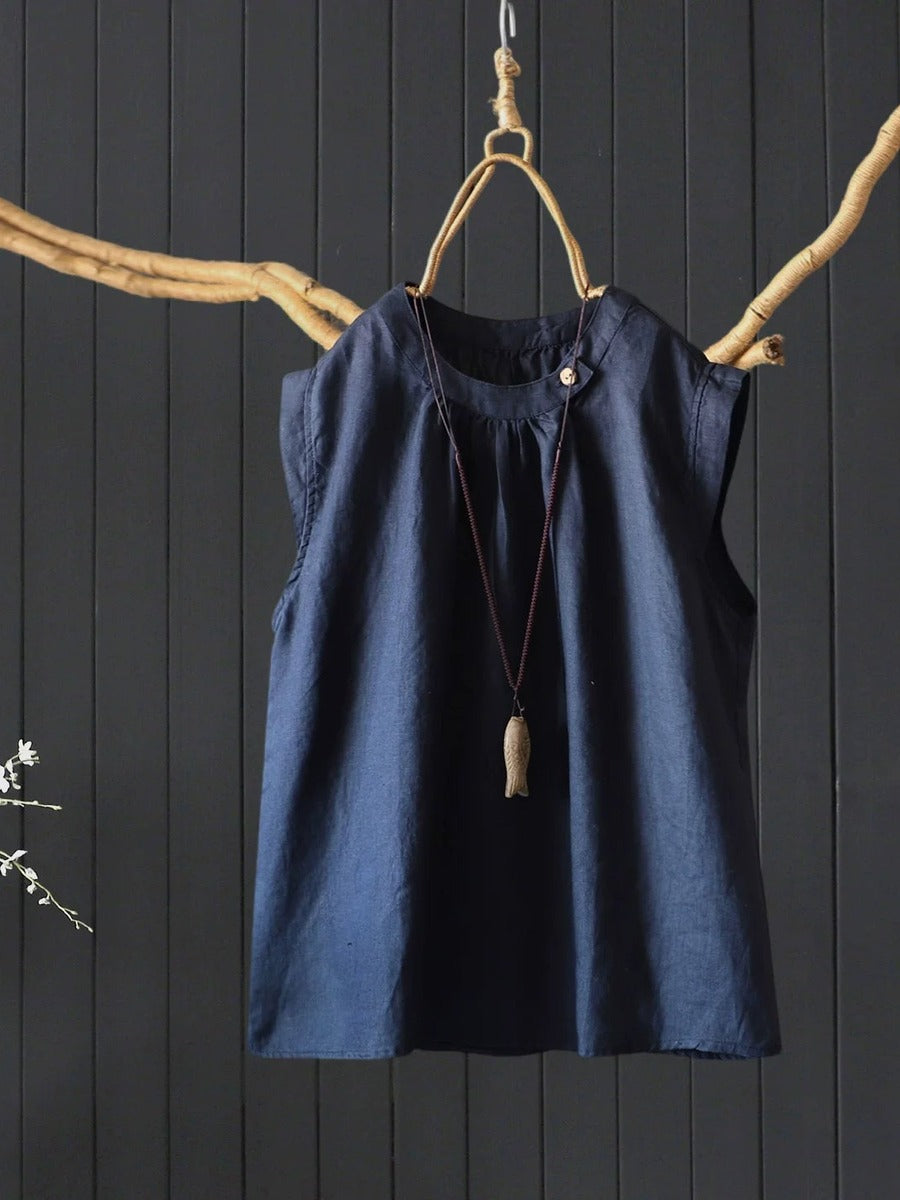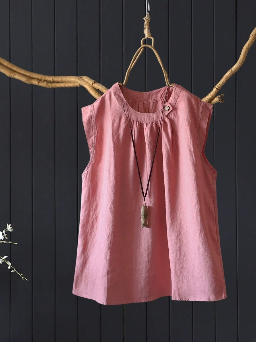 بلوزة نسائية صيفية كلاسيكية بدون أكمام مصنوعة من الكتان الخالص 100%
