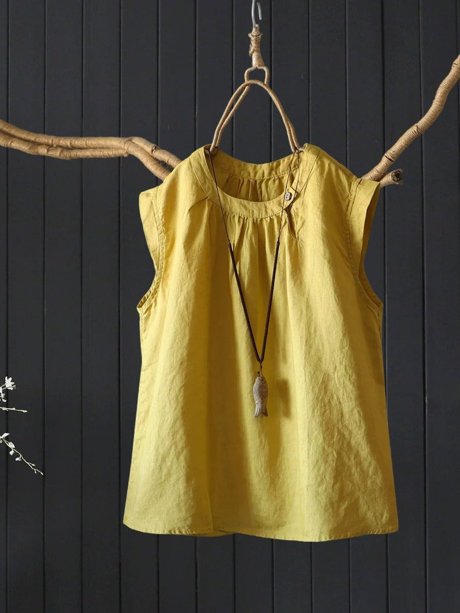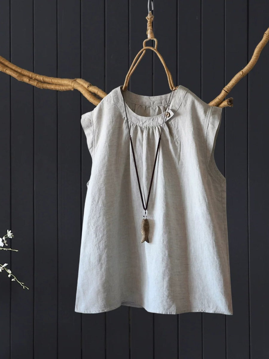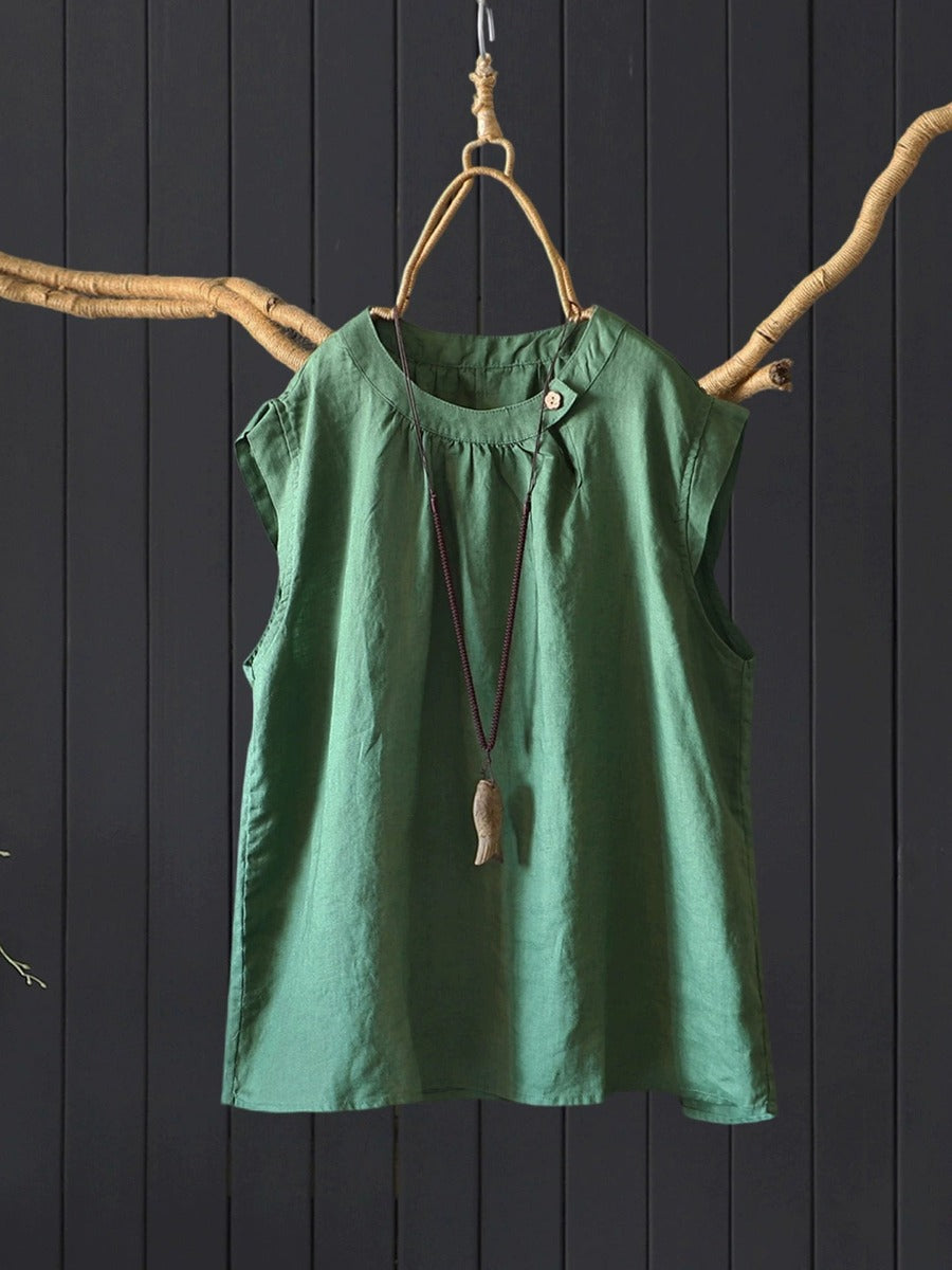 بلوزة نسائية صيفية كلاسيكية بدون أكمام مصنوعة من الكتان الخالص 100%