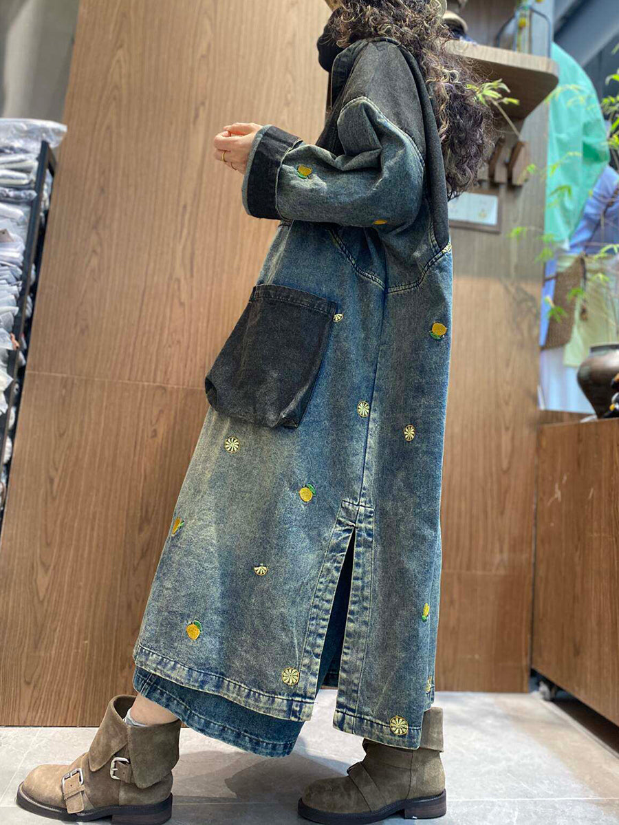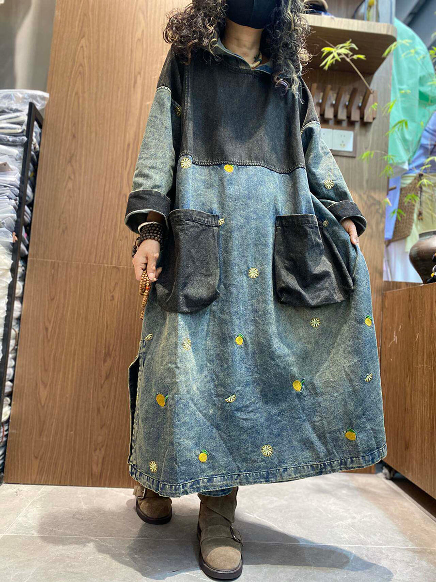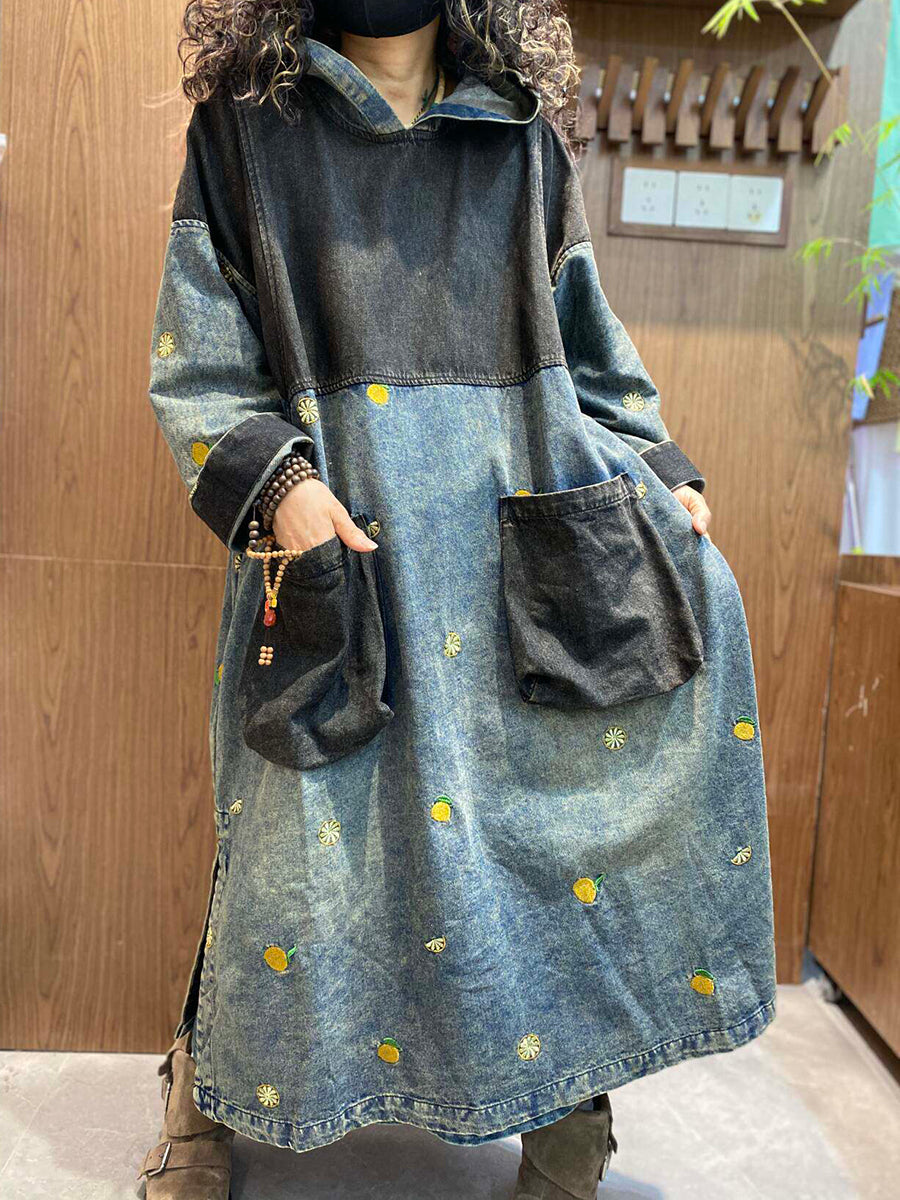 فستان صيفي نسائي عتيق من قماش الدنيم المرقع بغطاء للرأس