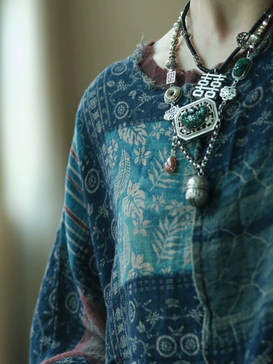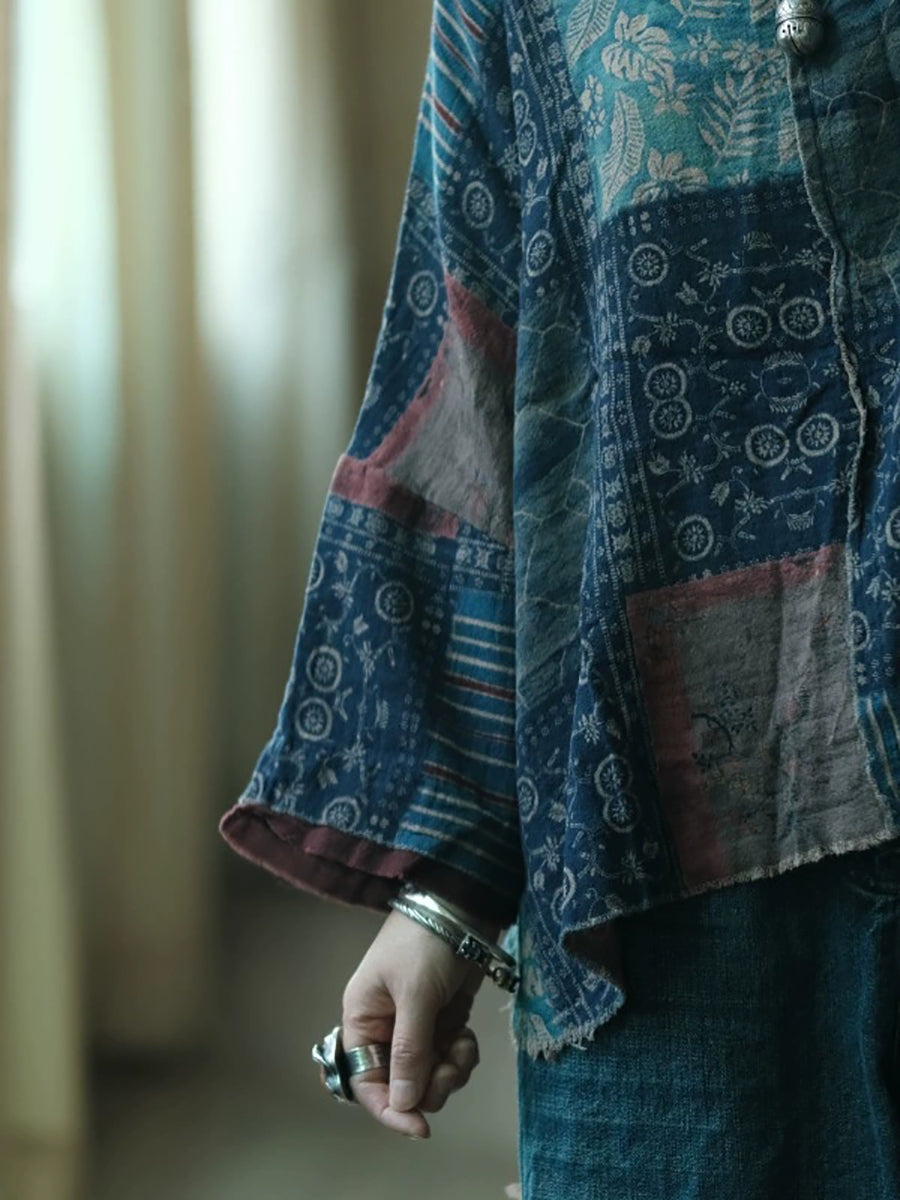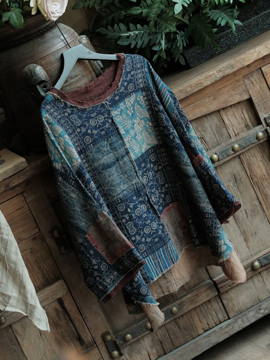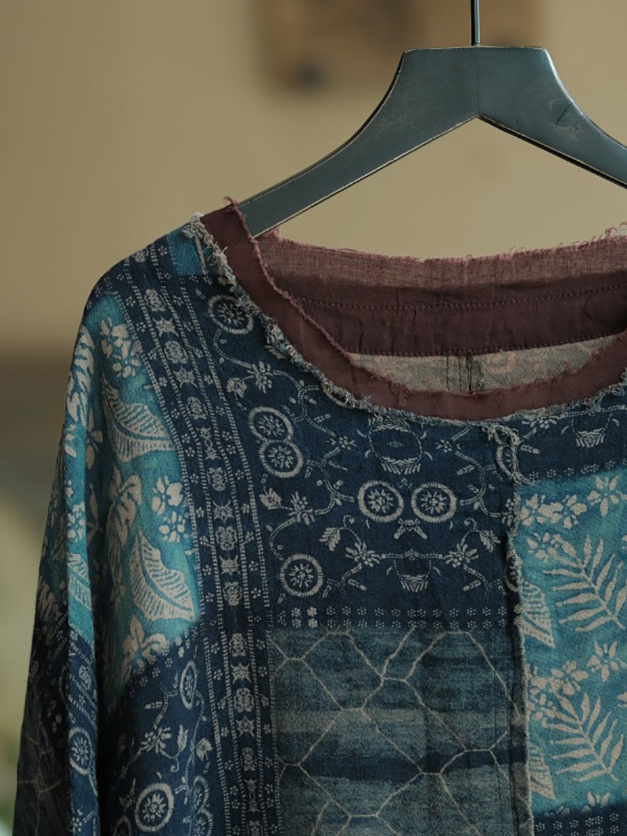 قميص قطني صيفي نسائي بتصميم كلاسيكي مرقع برقبة دائرية