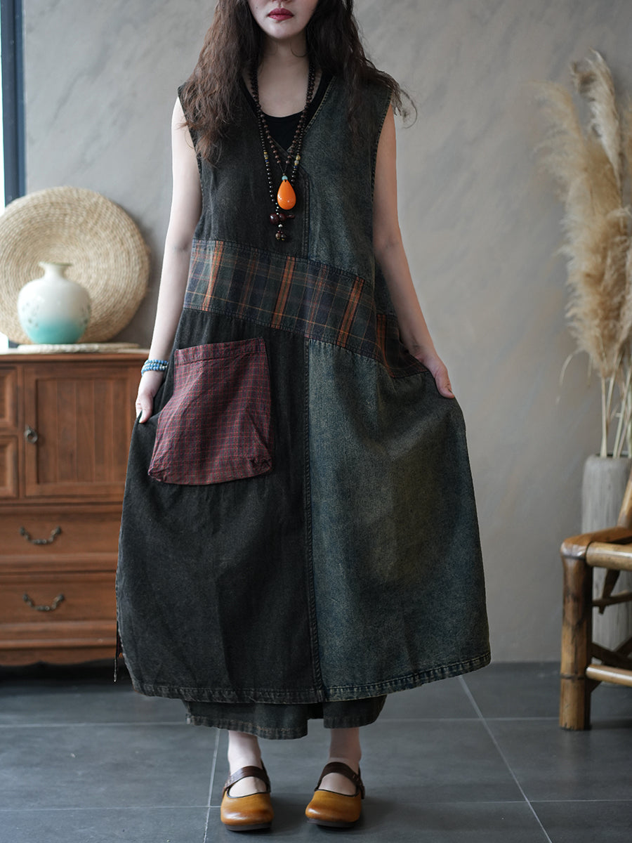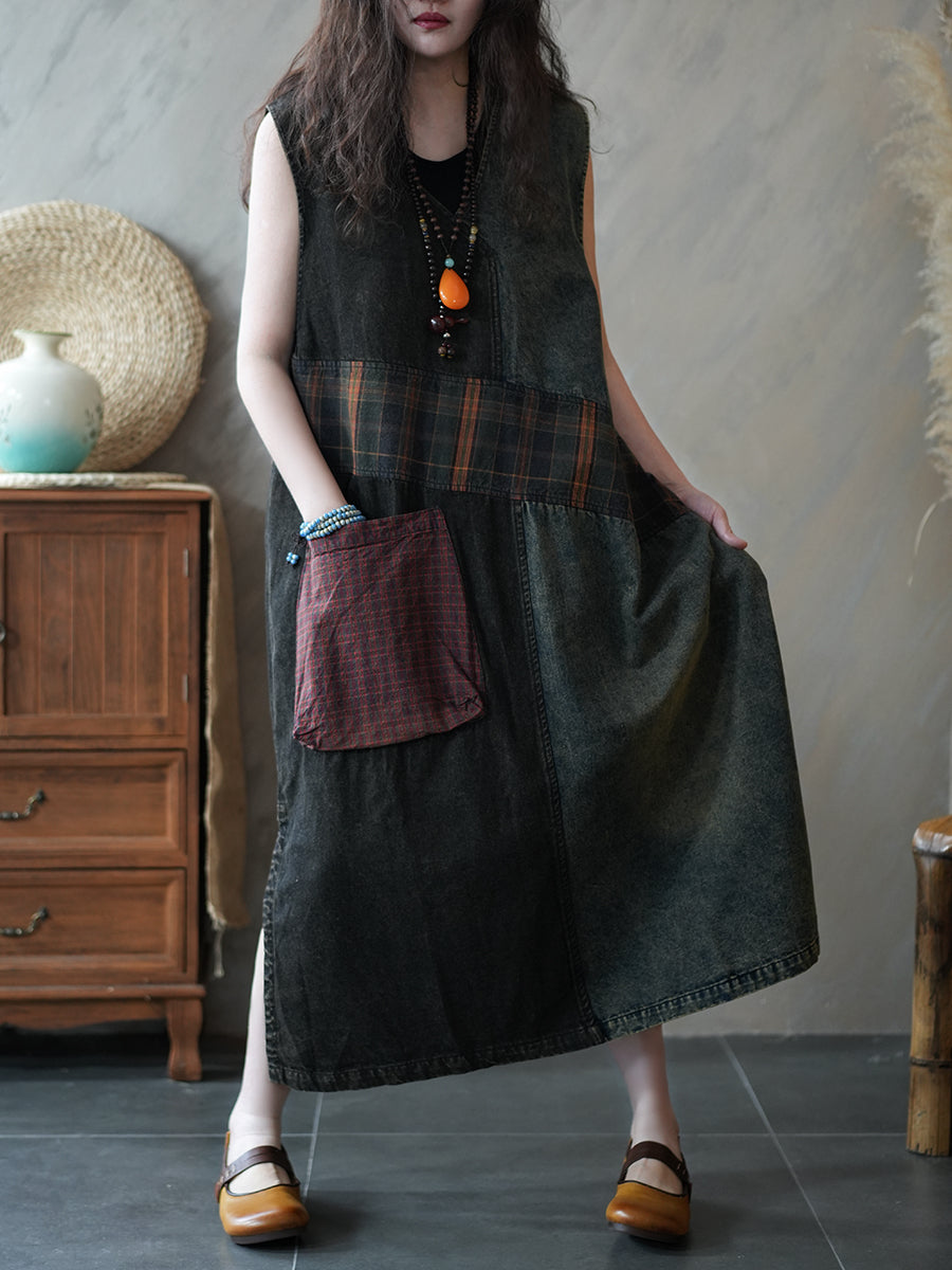 فستان نسائي صيفي بتصميم كلاسيكي من الدنيم بدون أكمام