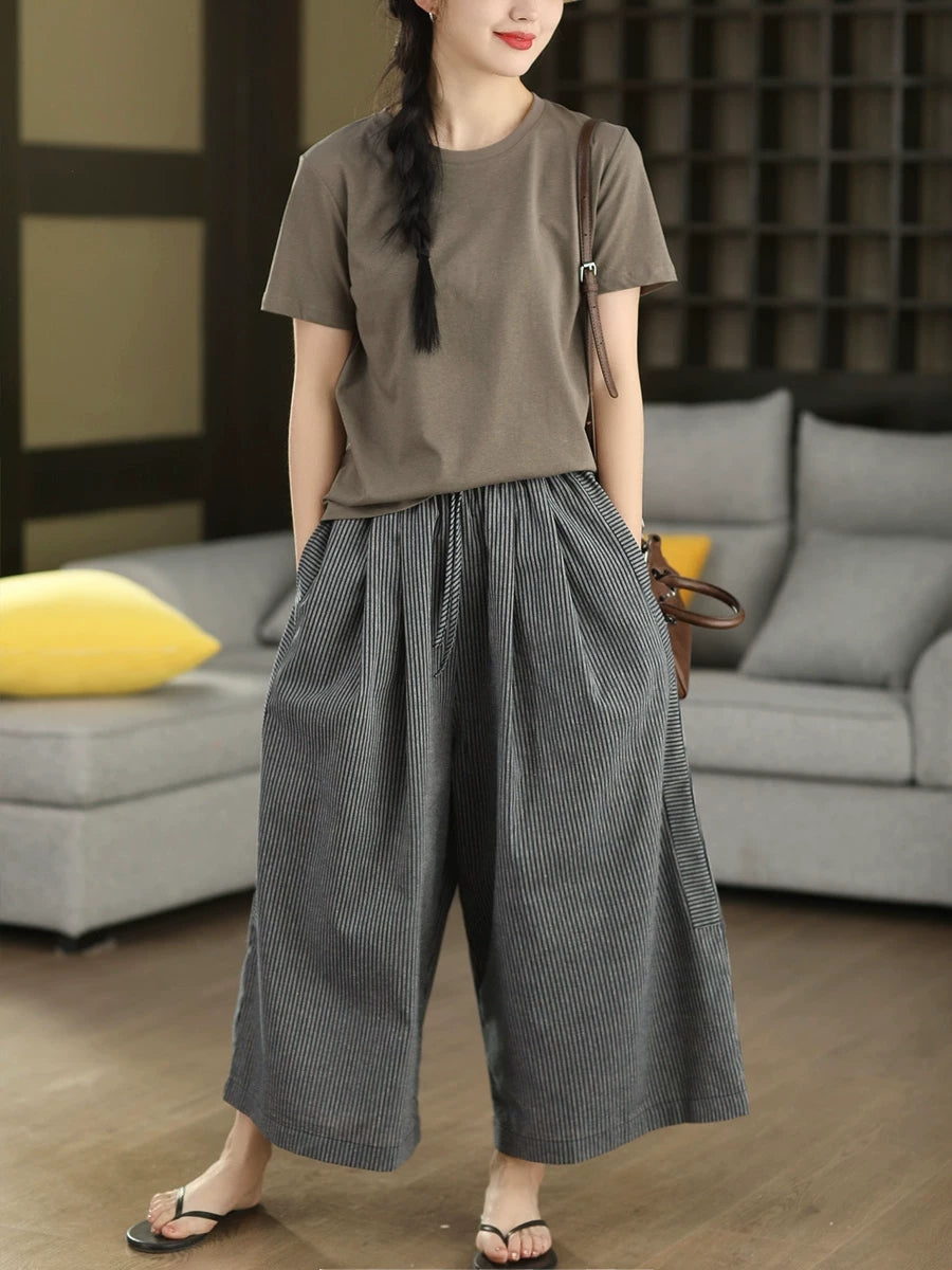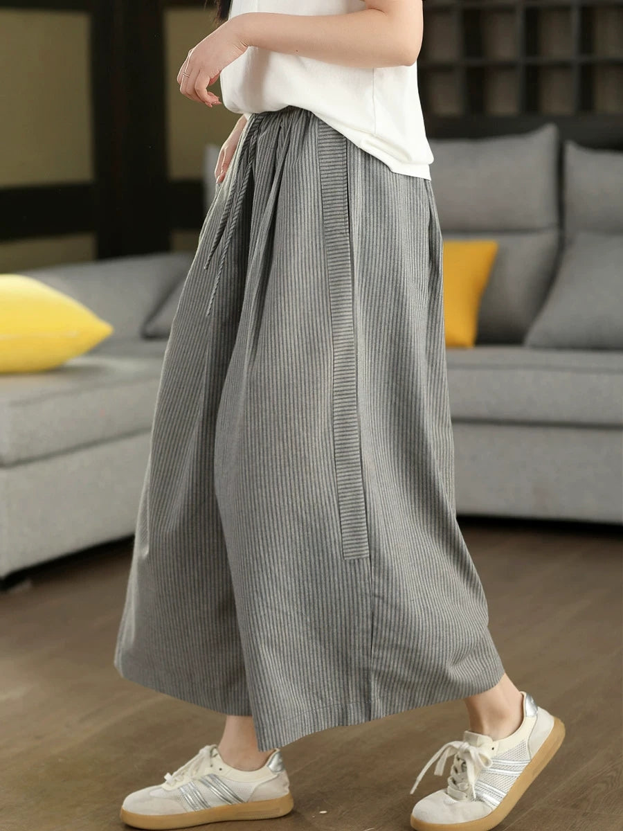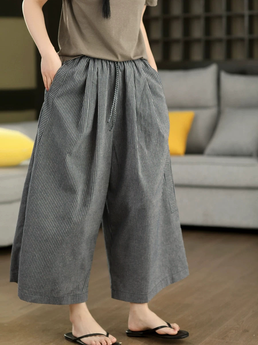 بنطلون نسائي صيفي واسع الساقين من الكتان المخطط بنمط كلاسيكي