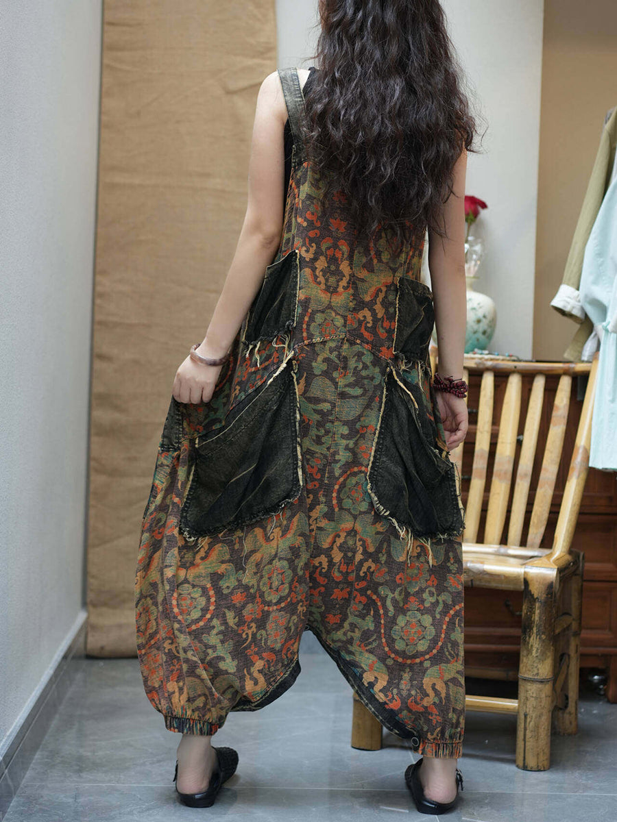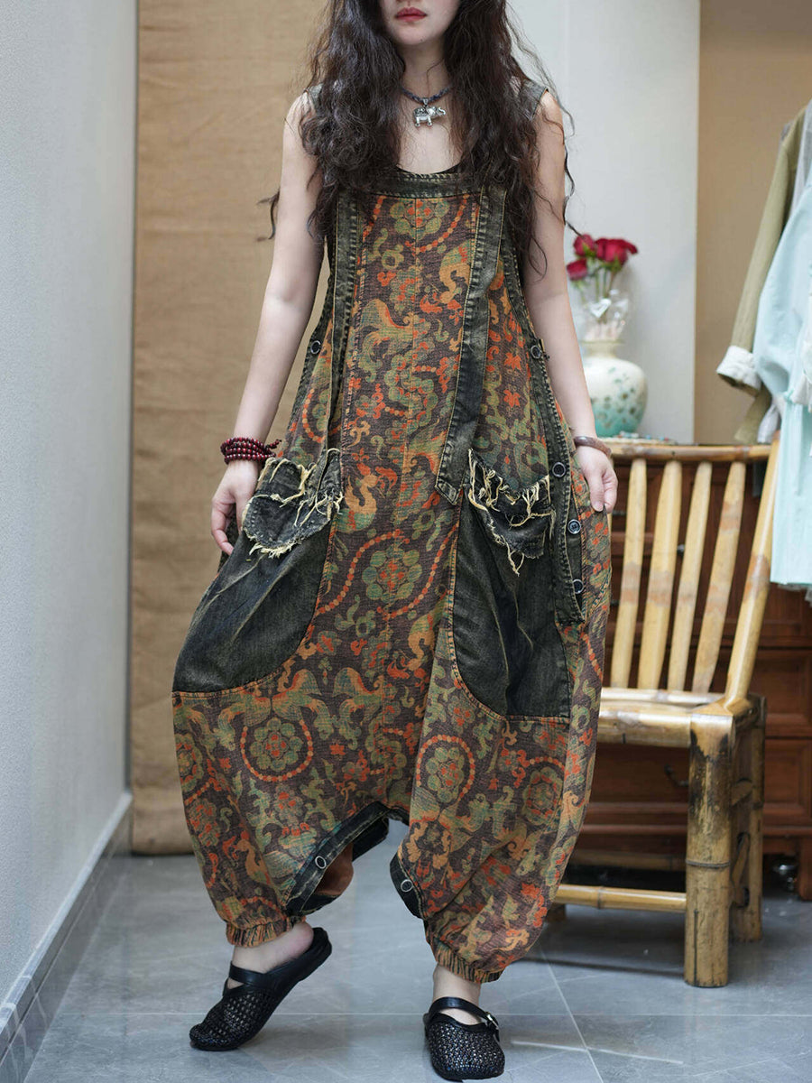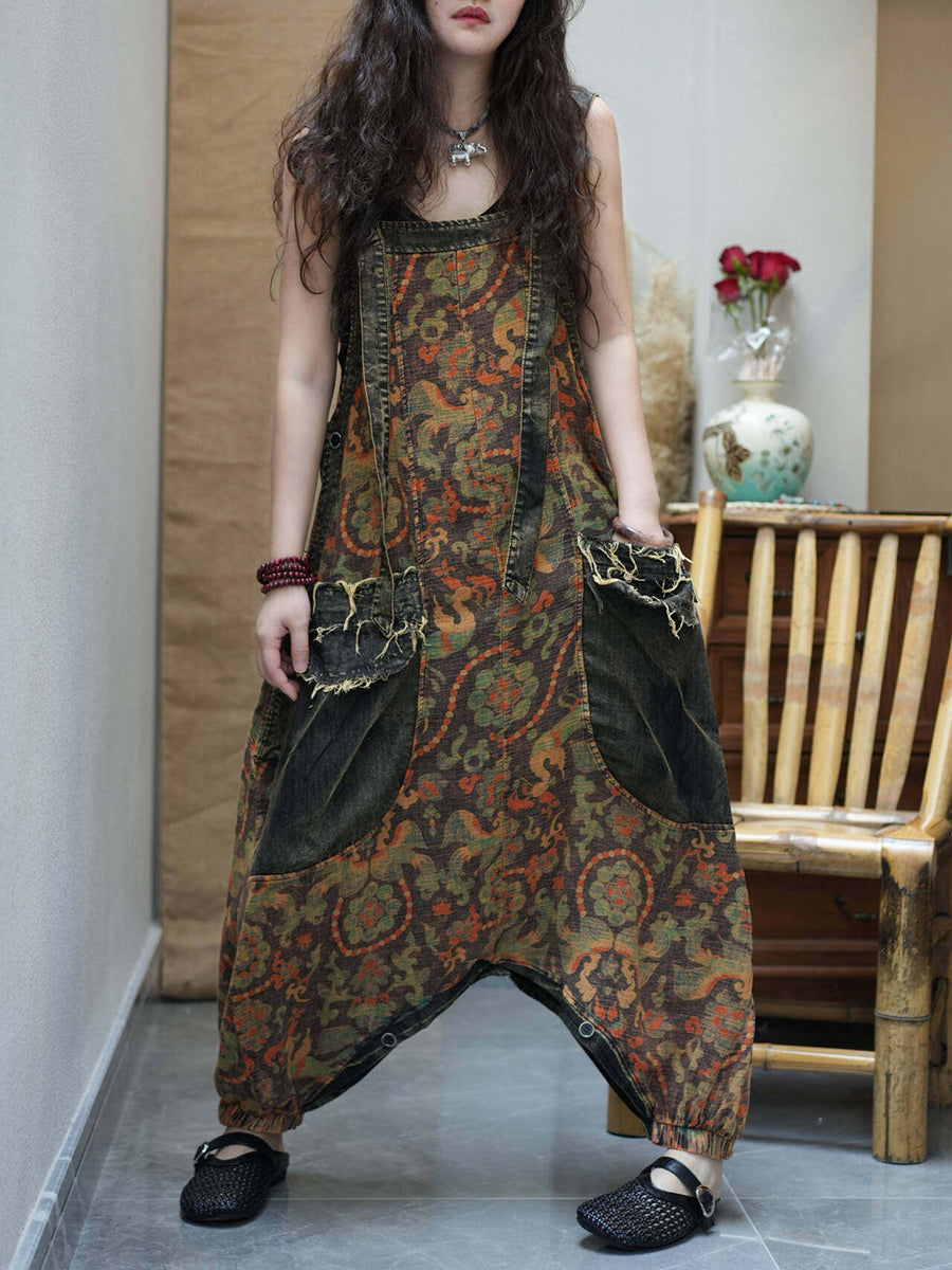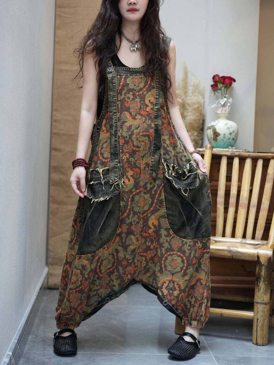 جمبسوت نسائي كلاسيكي من الدنيم مزين بالزهور، بفتحة منخفضة.