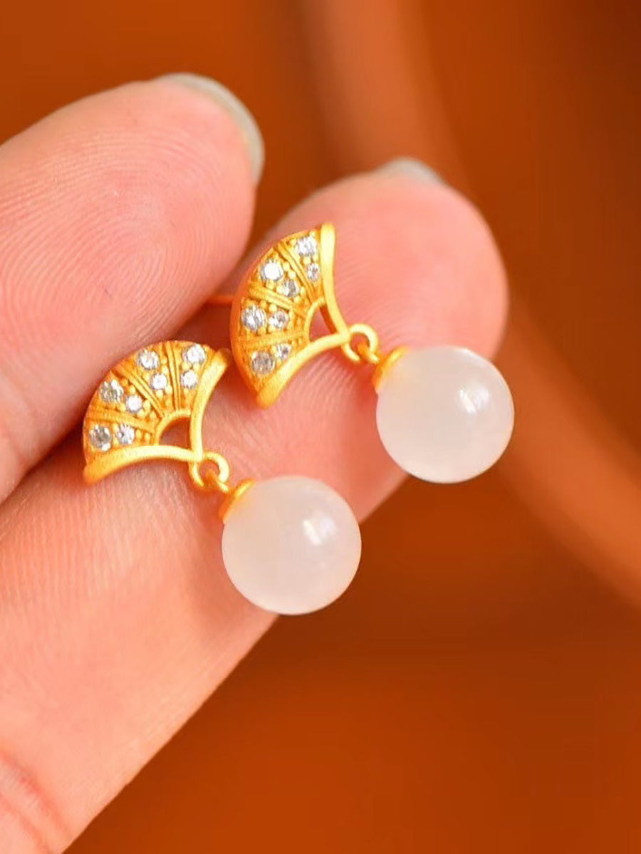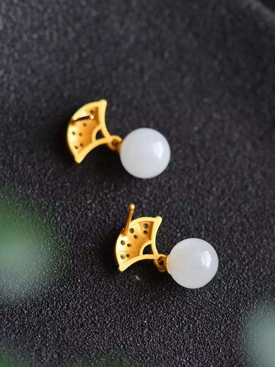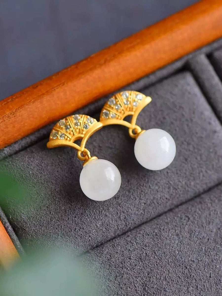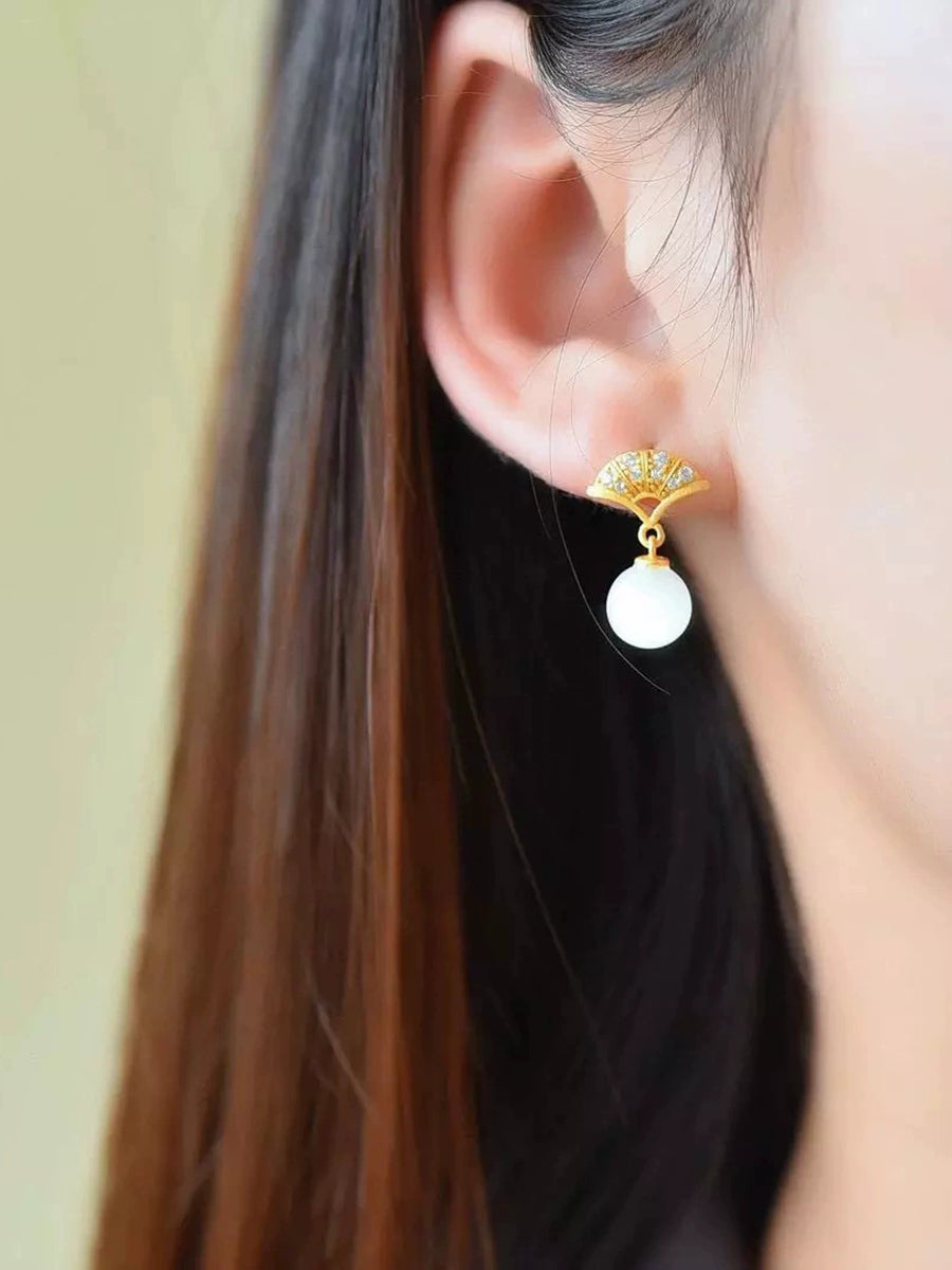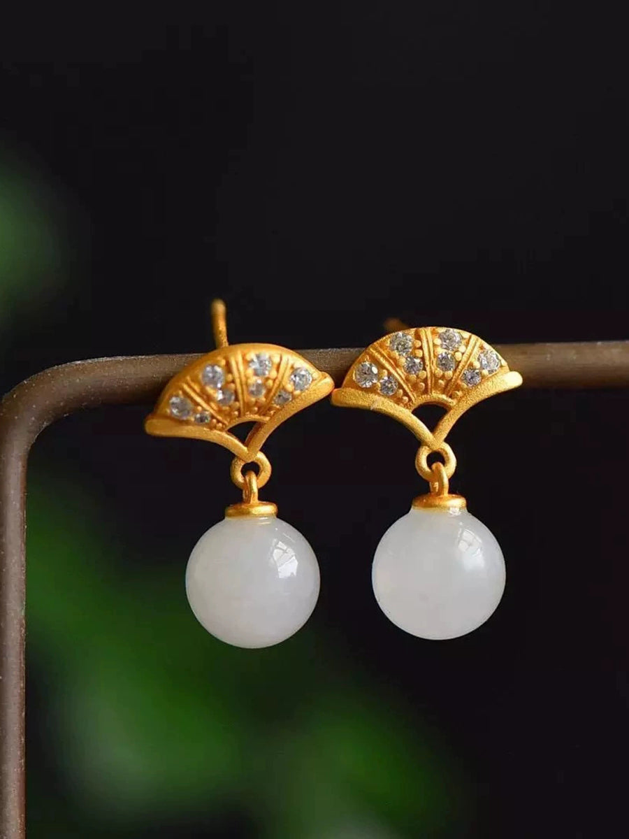 أقراط نسائية عتيقة من اليشم والسبائك المعدنية على شكل مروحة